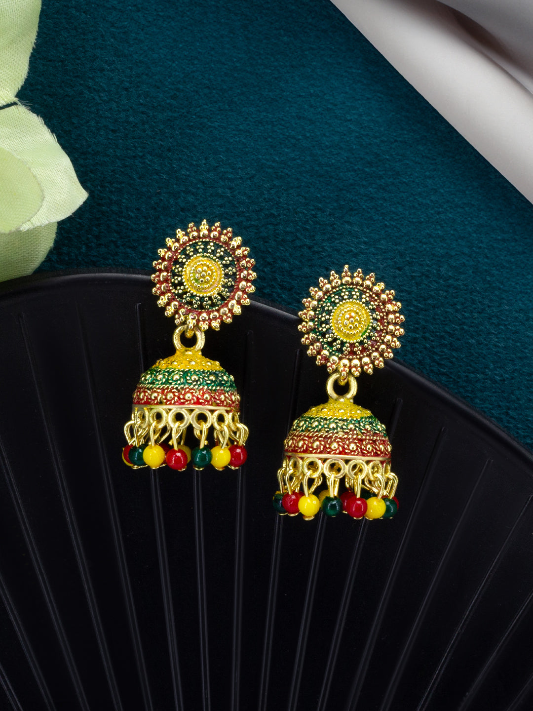 Gold Plated Circular Multi Color Artificial Beaded Jhumki Earrings