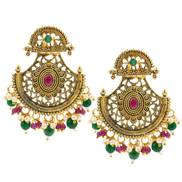 Gold-toned crescent shaped drop earrings, has artificial beads