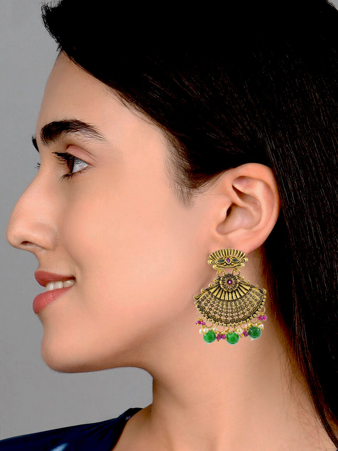 Gold-toned crescent shaped drop earrings, has artificial beads