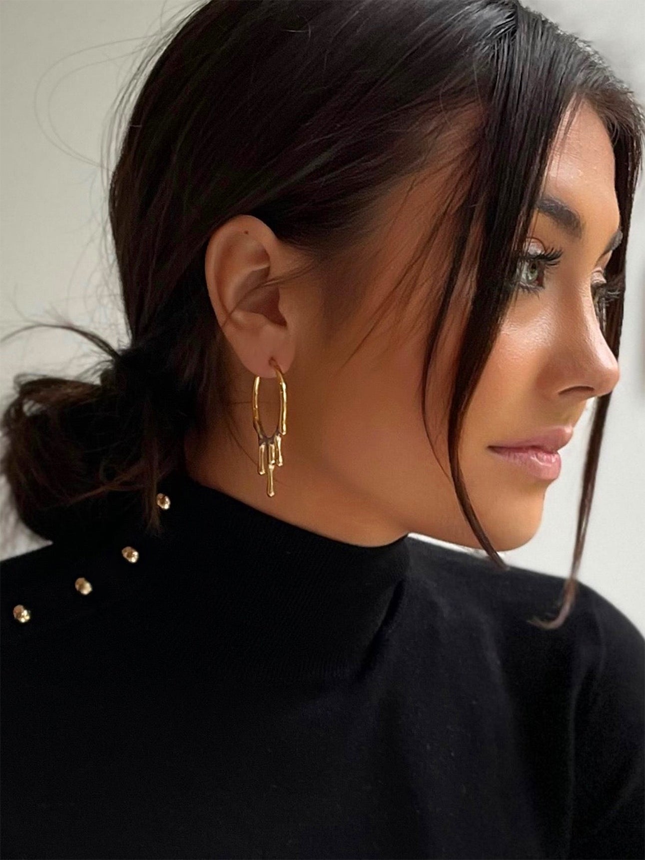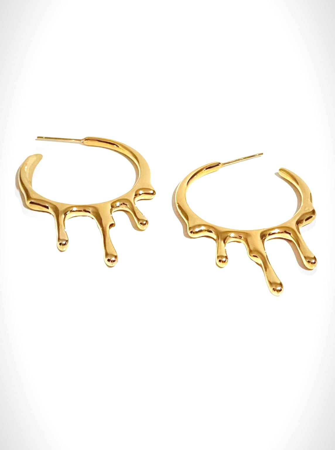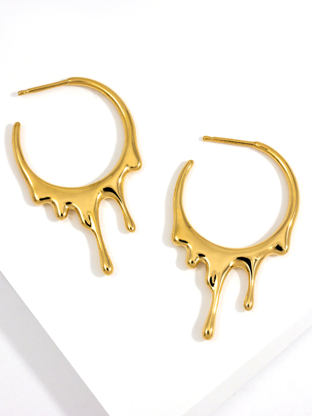These half hoop earrings are in stainless steel material and gold plated, has drip shaped details and secured with post and back closure.