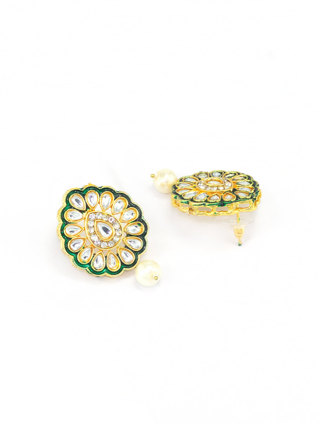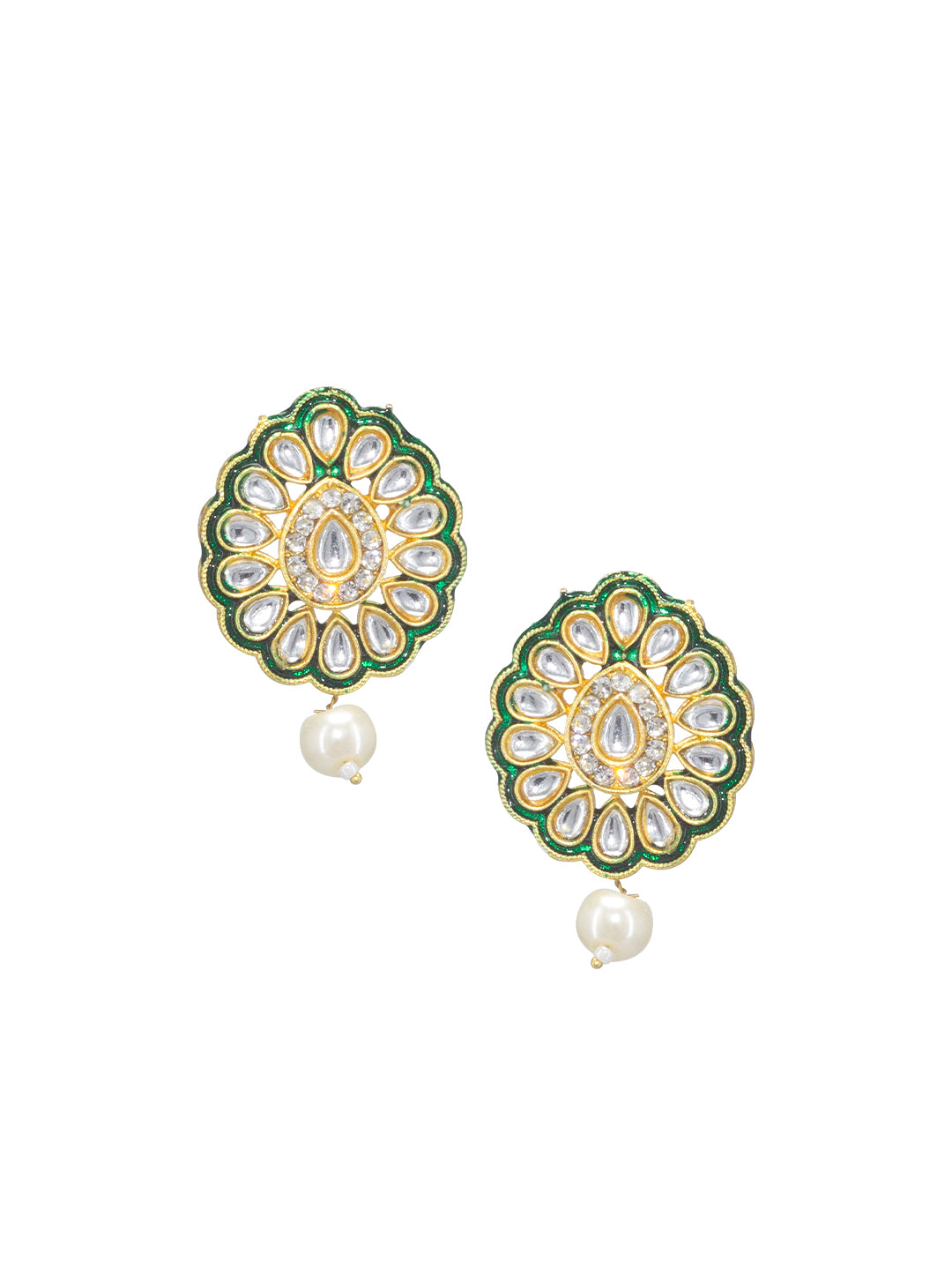 This jewellery set consist of a necklace and a pair of earrings. The necklace is gold plated, has kundan studded details and secured with drawstring closure. The earrings are secured with post and back closure.
