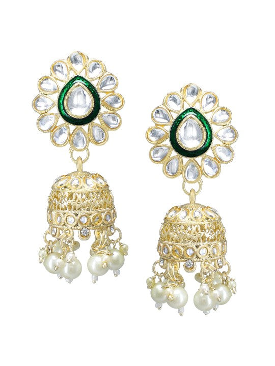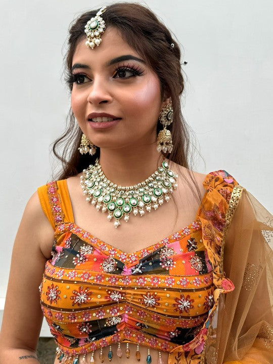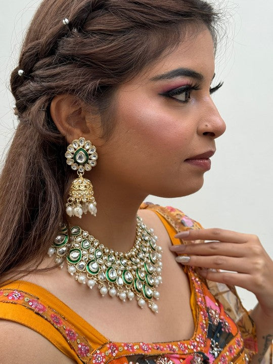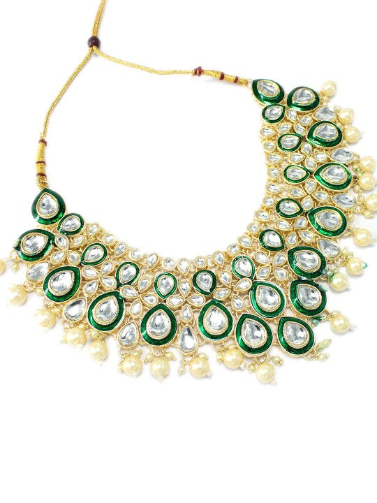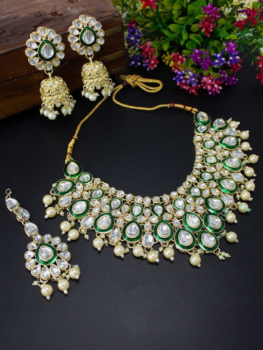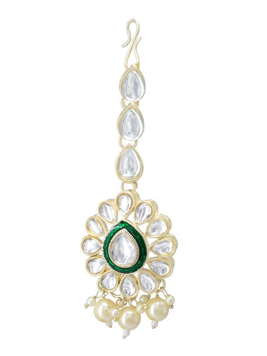 Gold Plated Green Kundan Studded Jewellery Set With Maangtika
