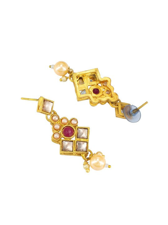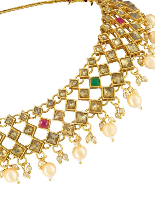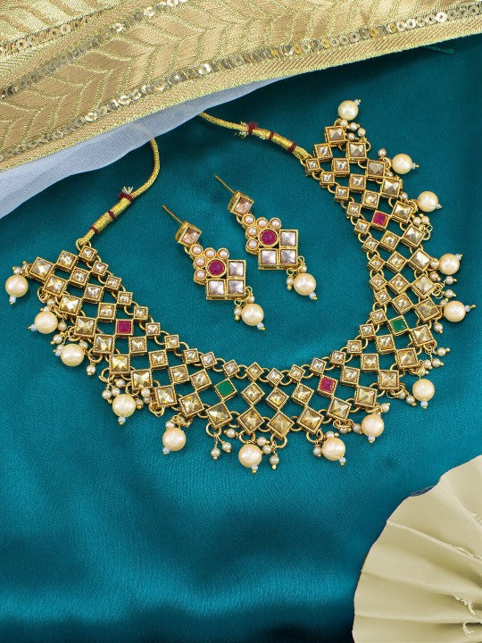 Gold-plated necklace, has green and red kundan studded and white pearl-beaded details