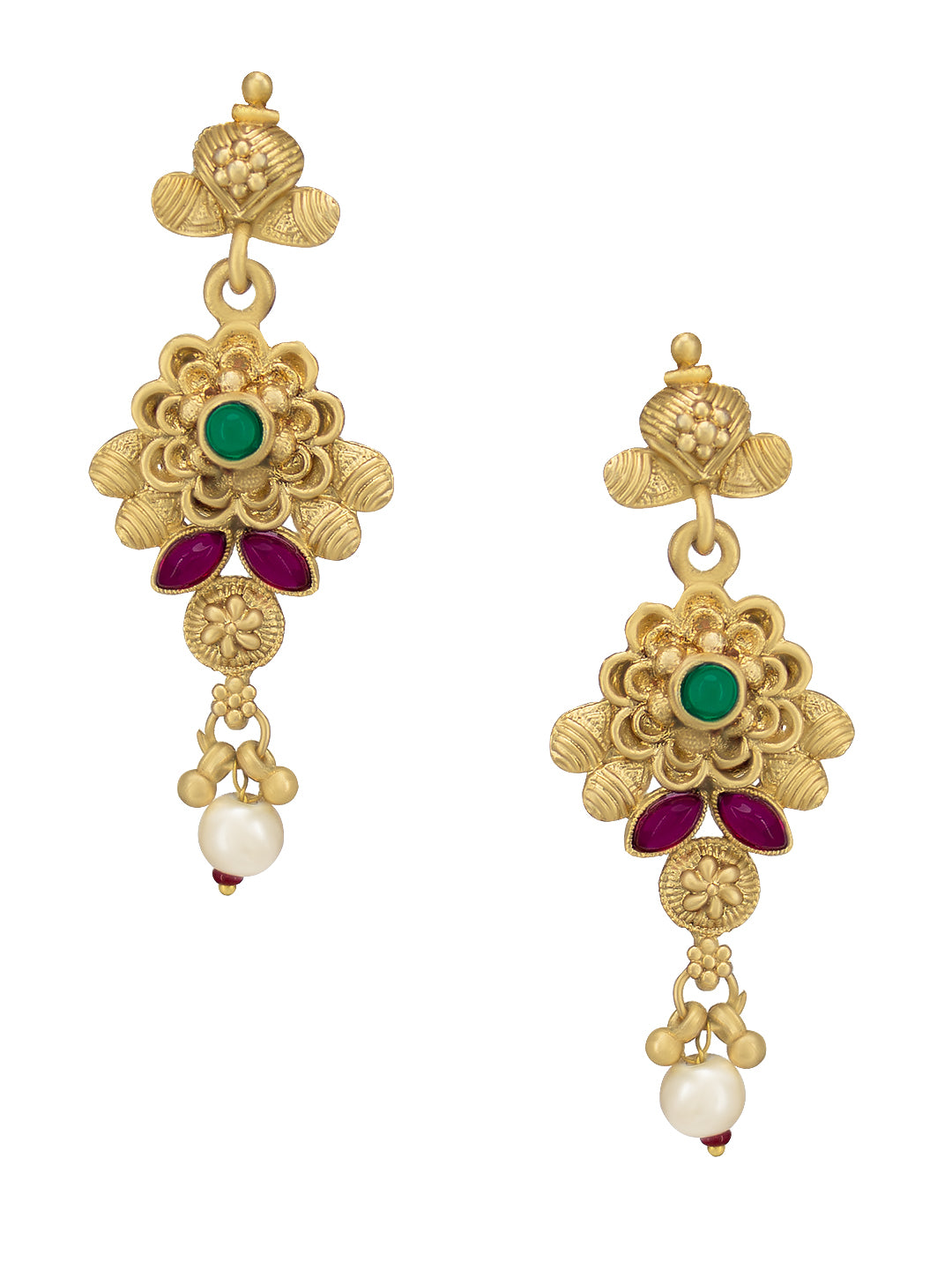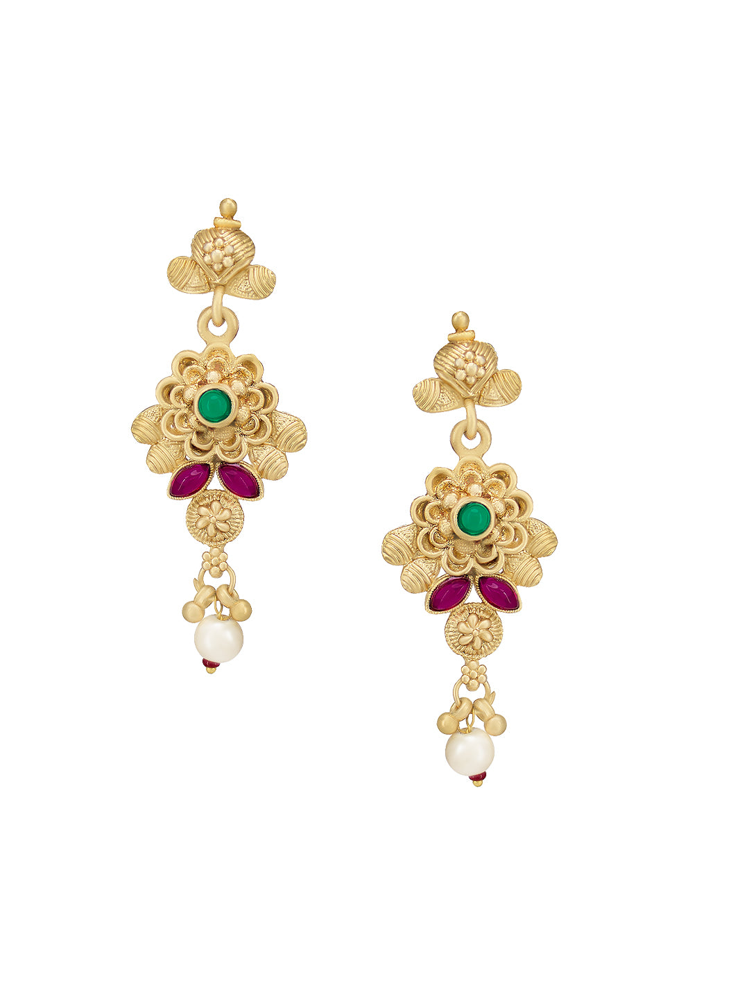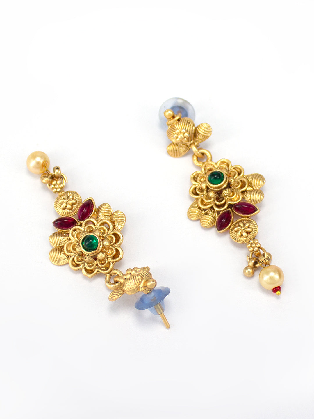 A pair of matching drop earrings, each secured with a post-and-back closure
