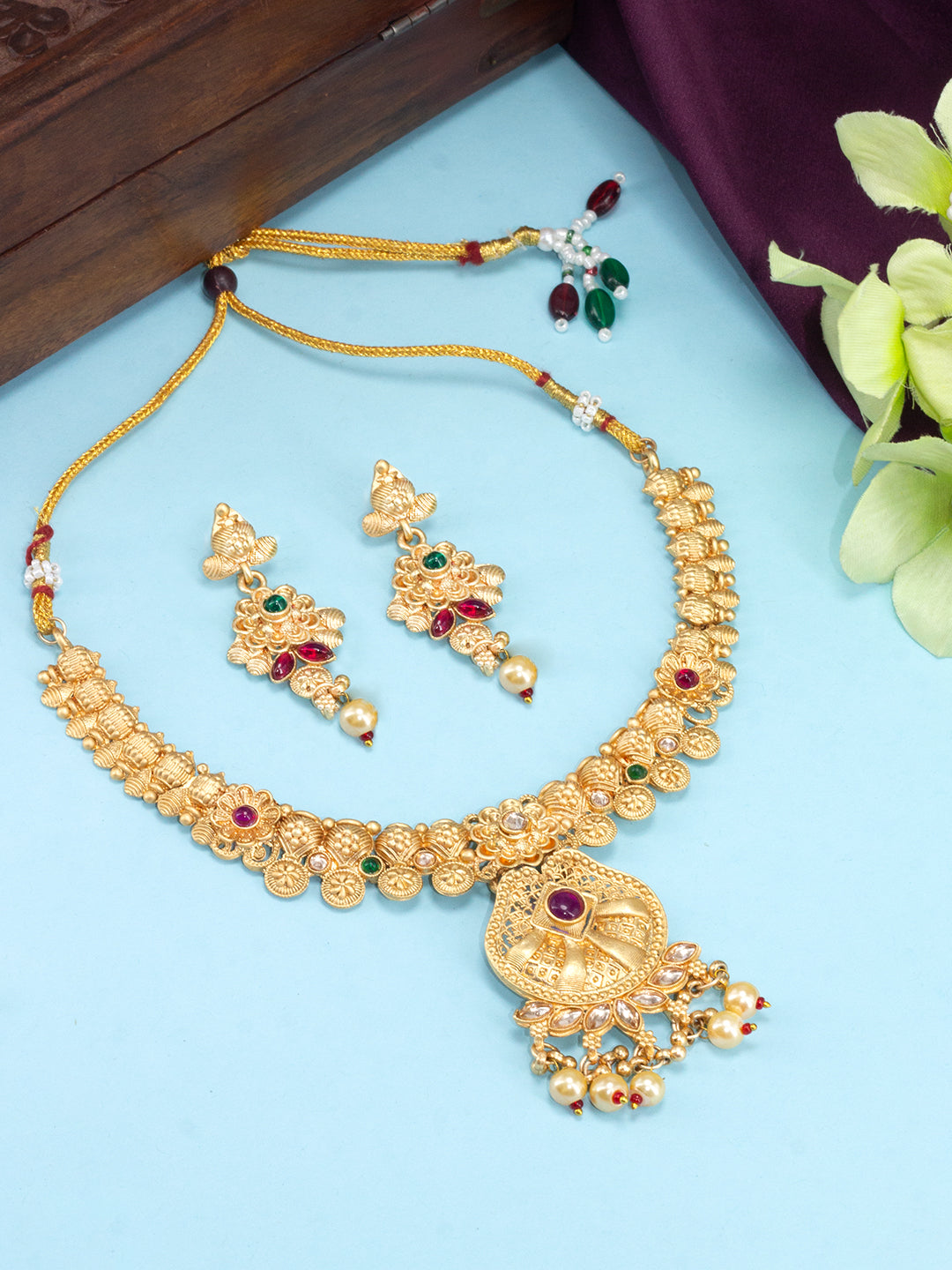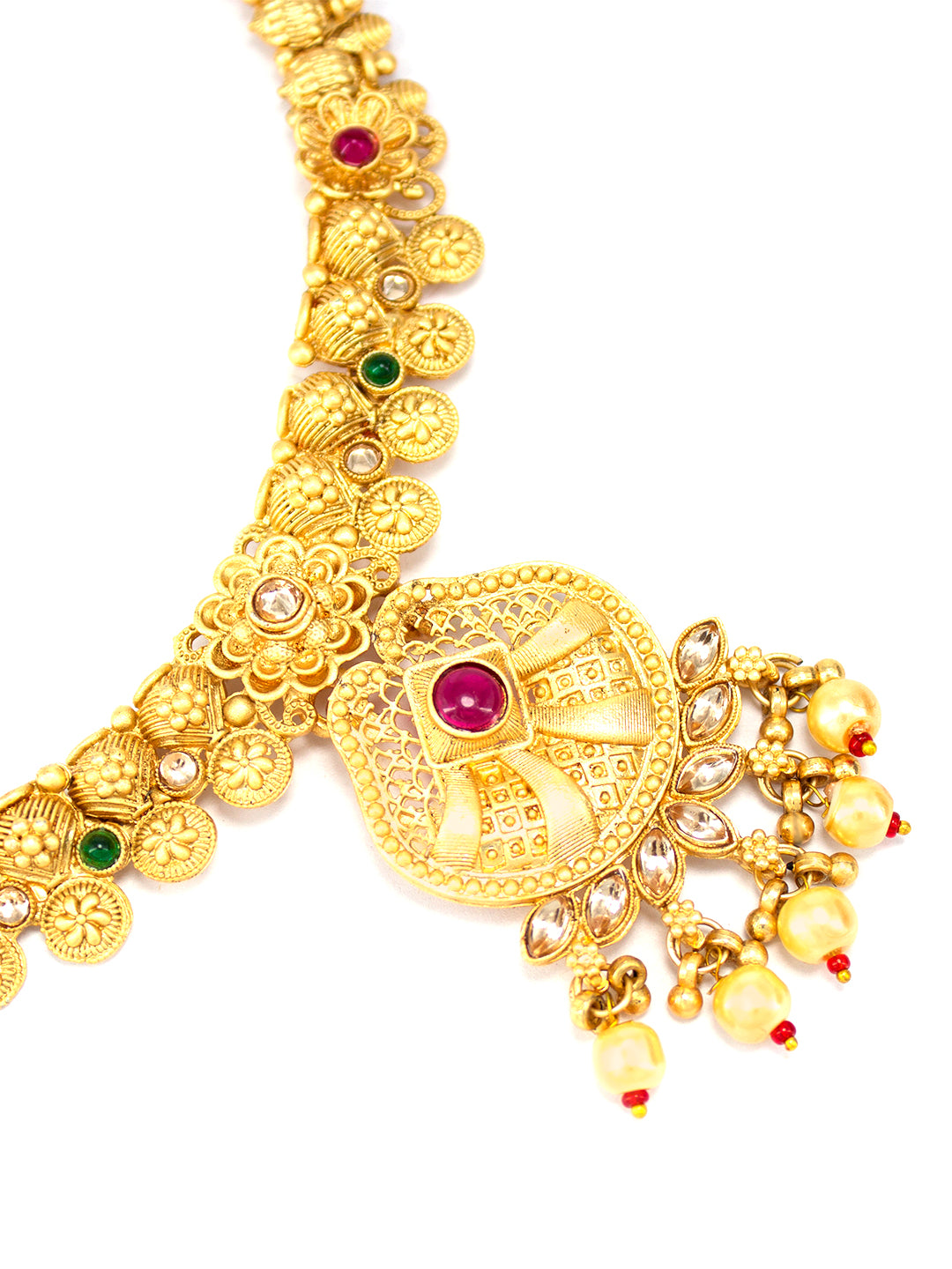 Gold-plated choker necklace, has gold, red and green Kundan-studded details
