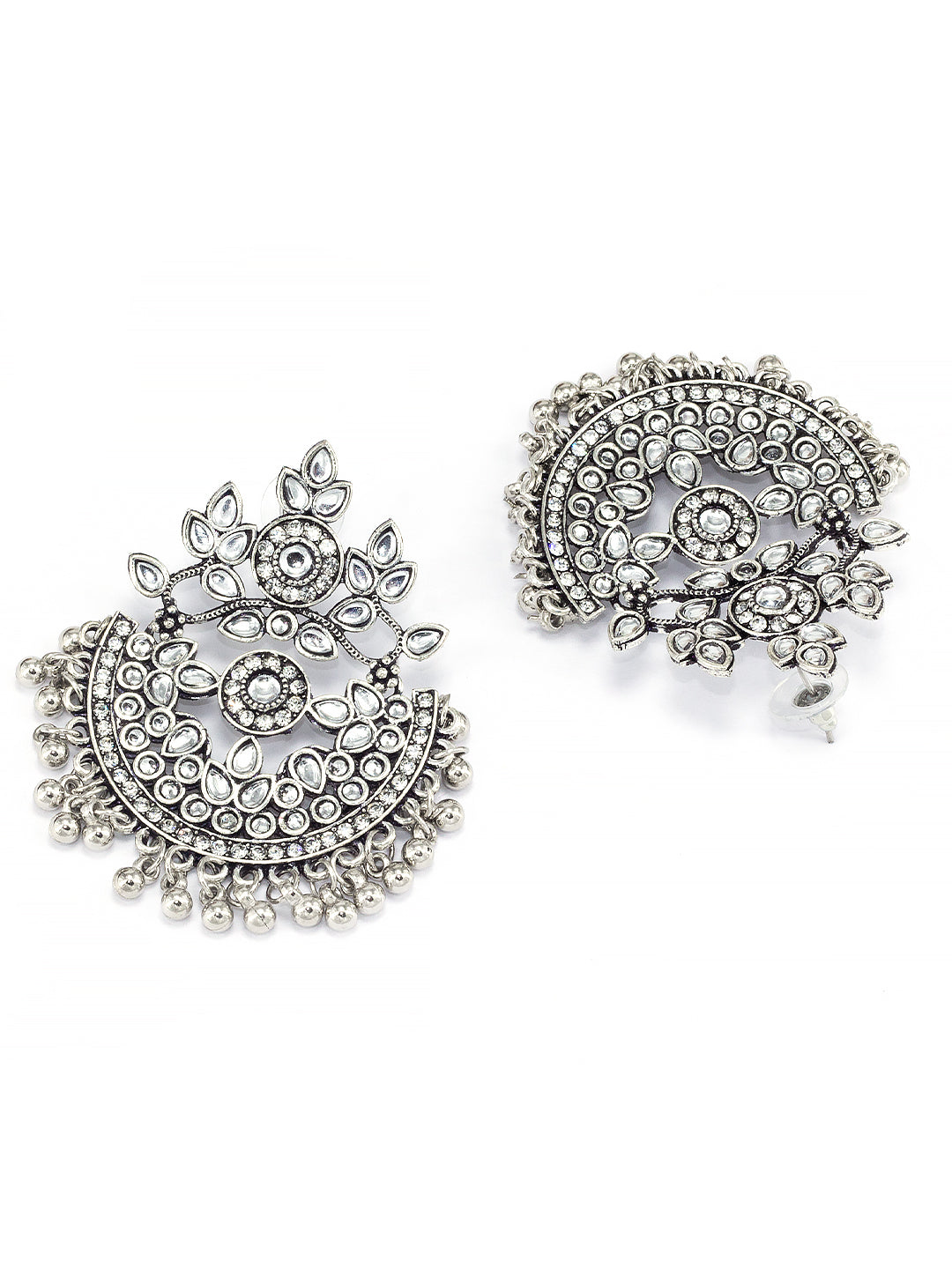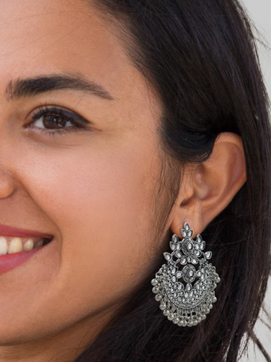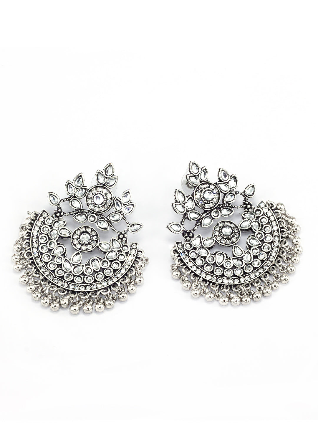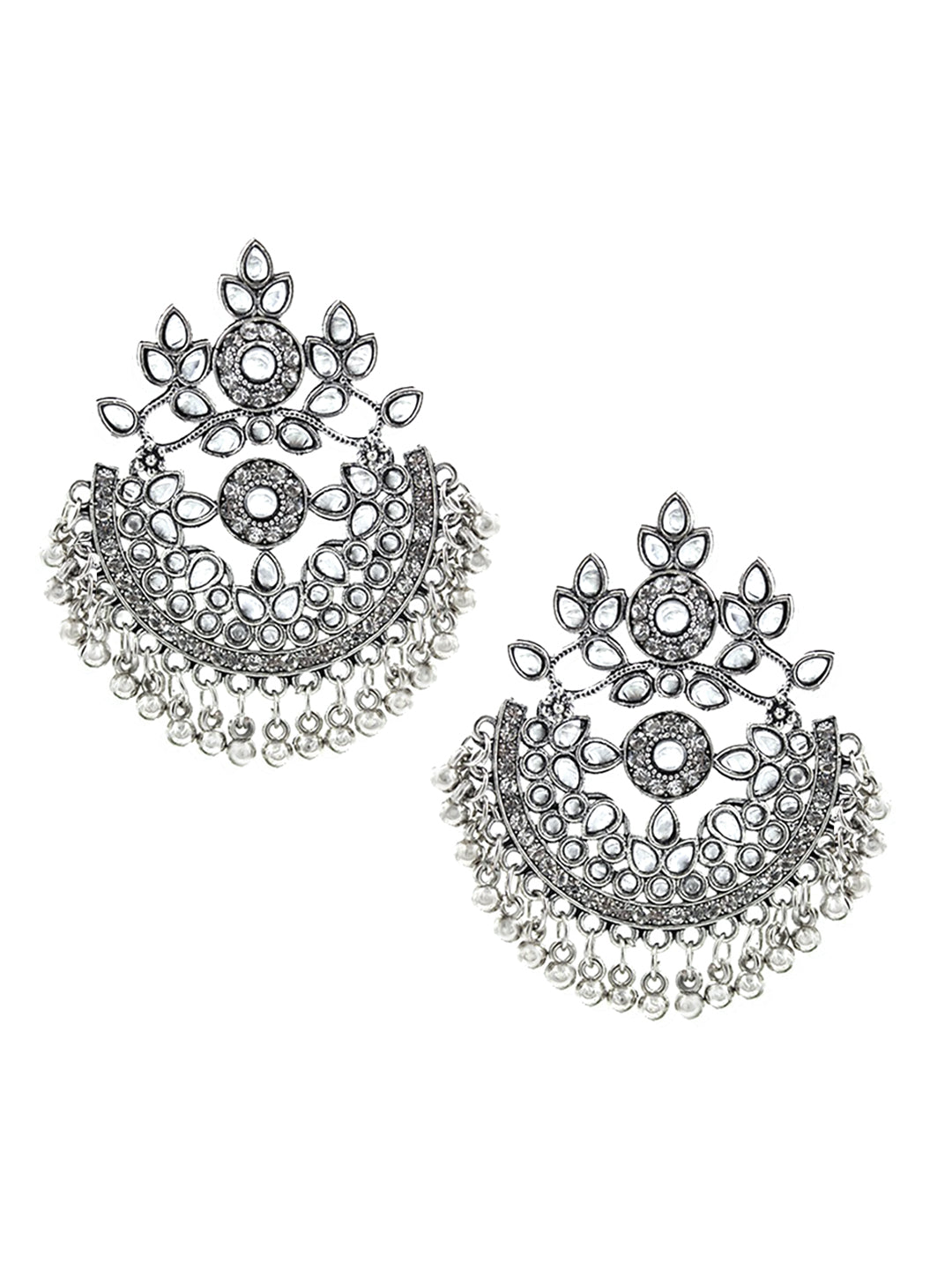 Silver-Plated Crescent Shaped Kundan Studded Drop Earrings