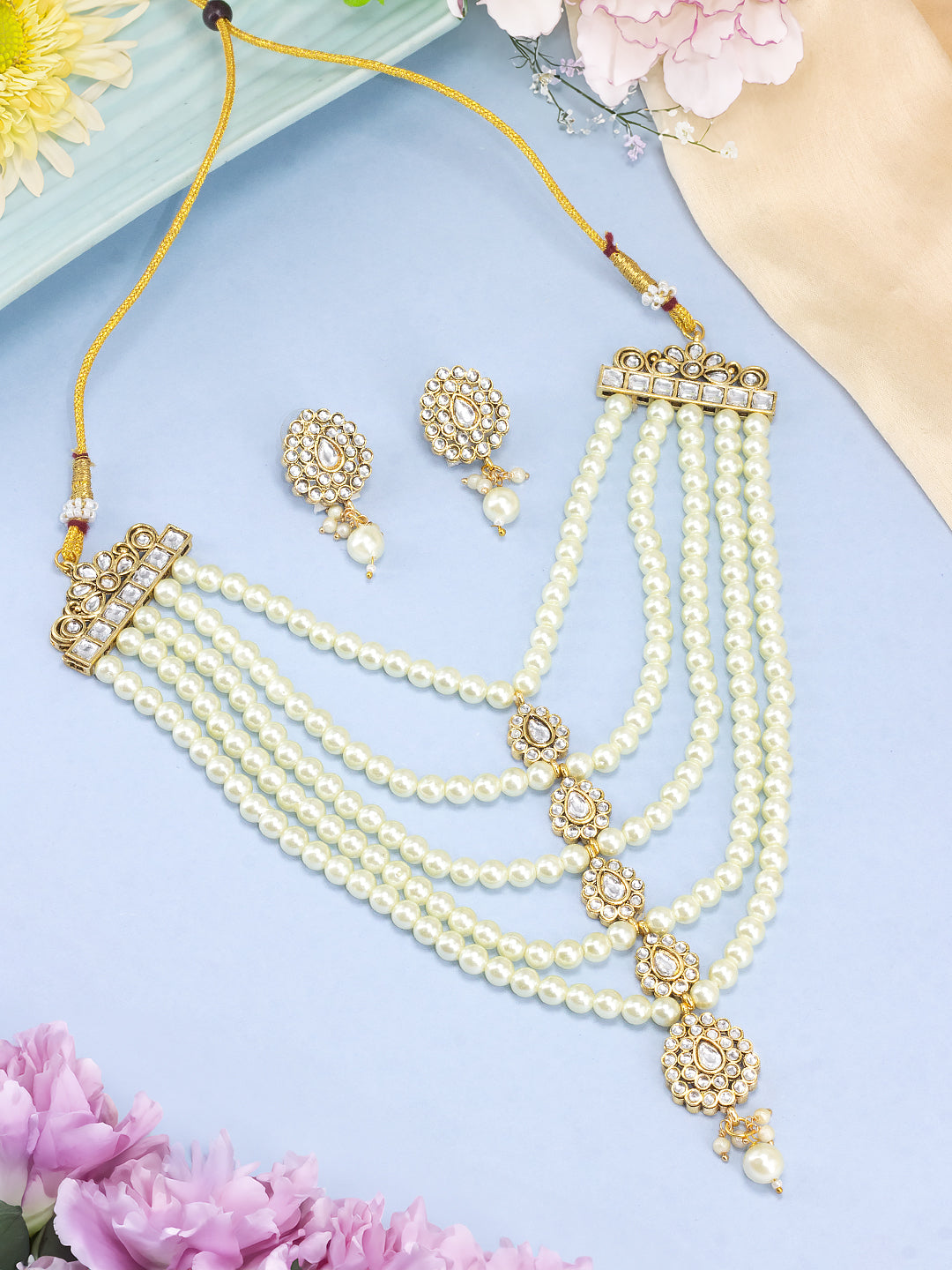 Gold-plated necklace has & white pearl Kundan studded details, Secured with a drawstring closure