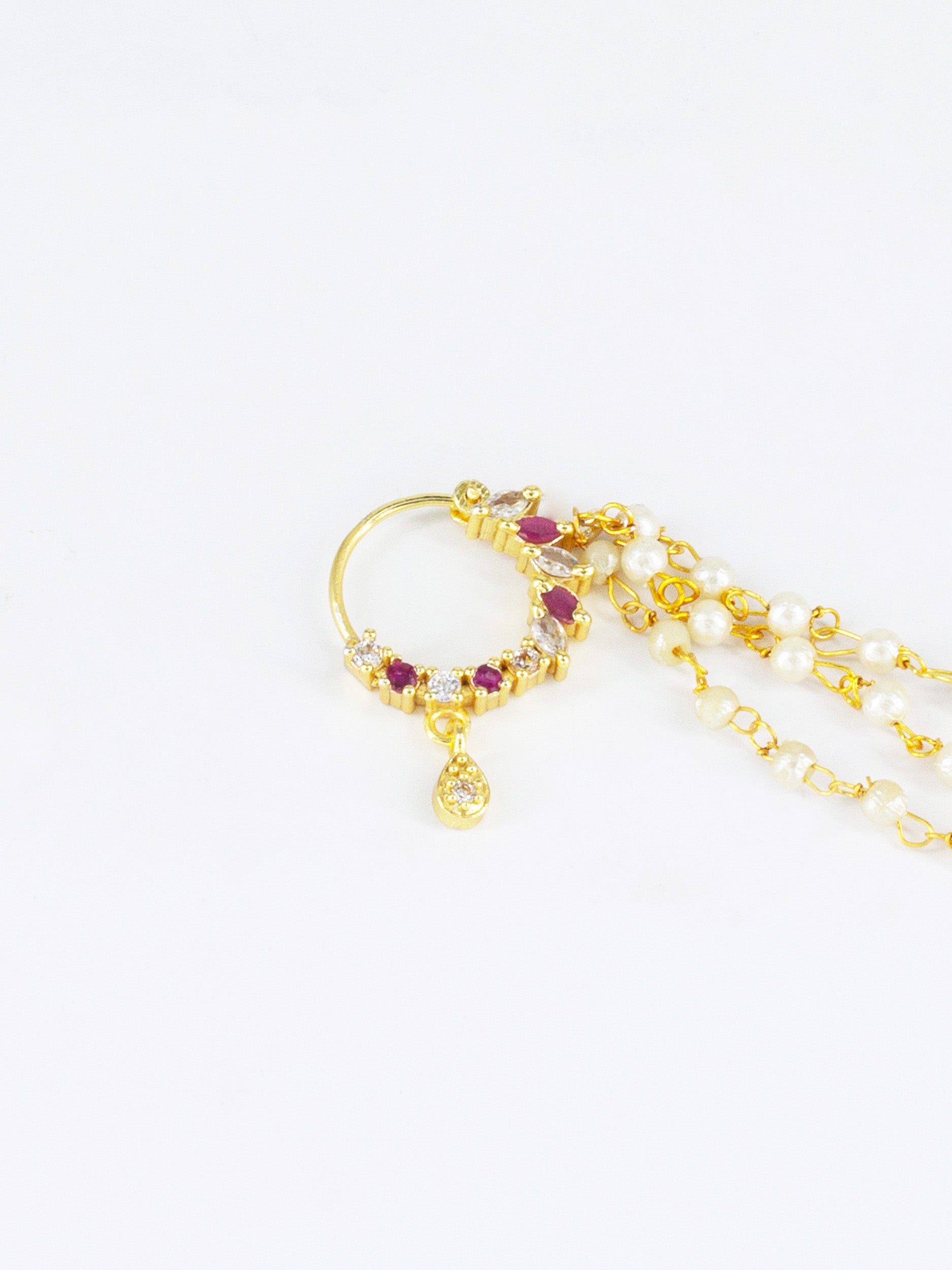 Gold Plated Red AD Nose Ring with 3 line Pearl Chain