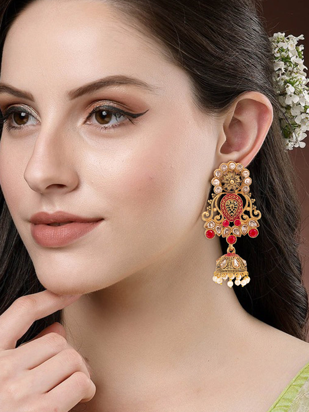 Gold Plated Red Floral Jhumka Earrings