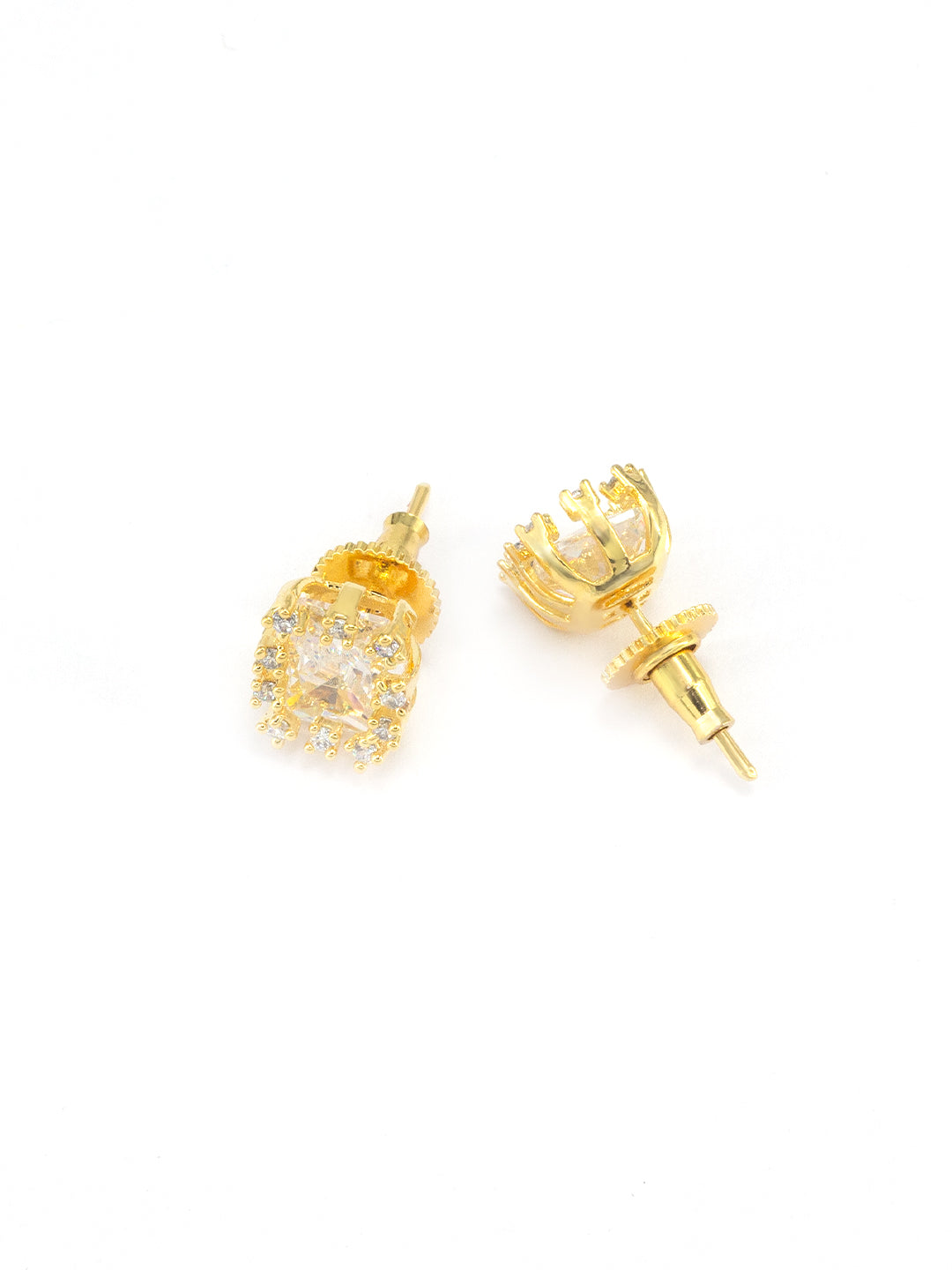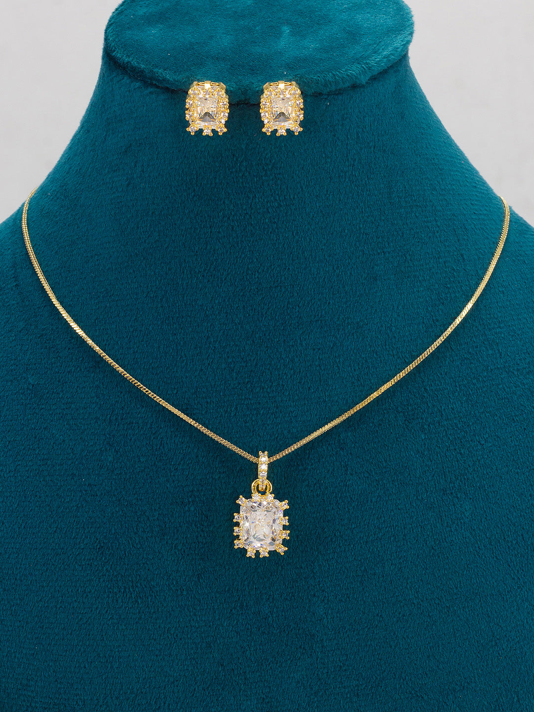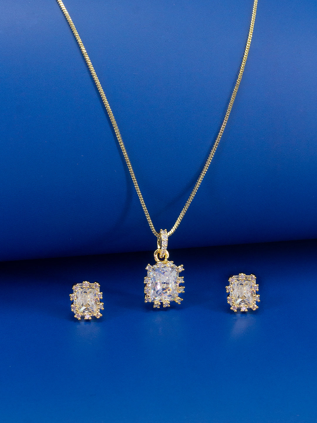 This pendant set consist of a gold plated pendant with chain and a pair of earrings, pendant has square AD studded details and Chain is secured with s-hook closure. Earrings are secured with post and back closure