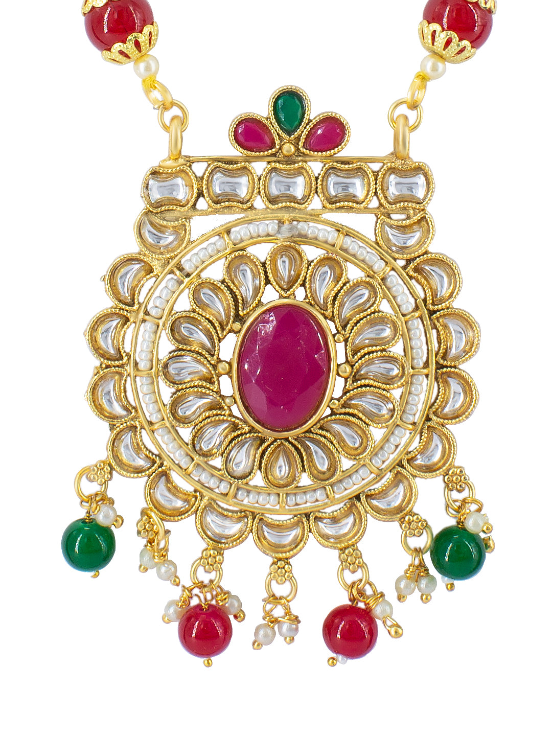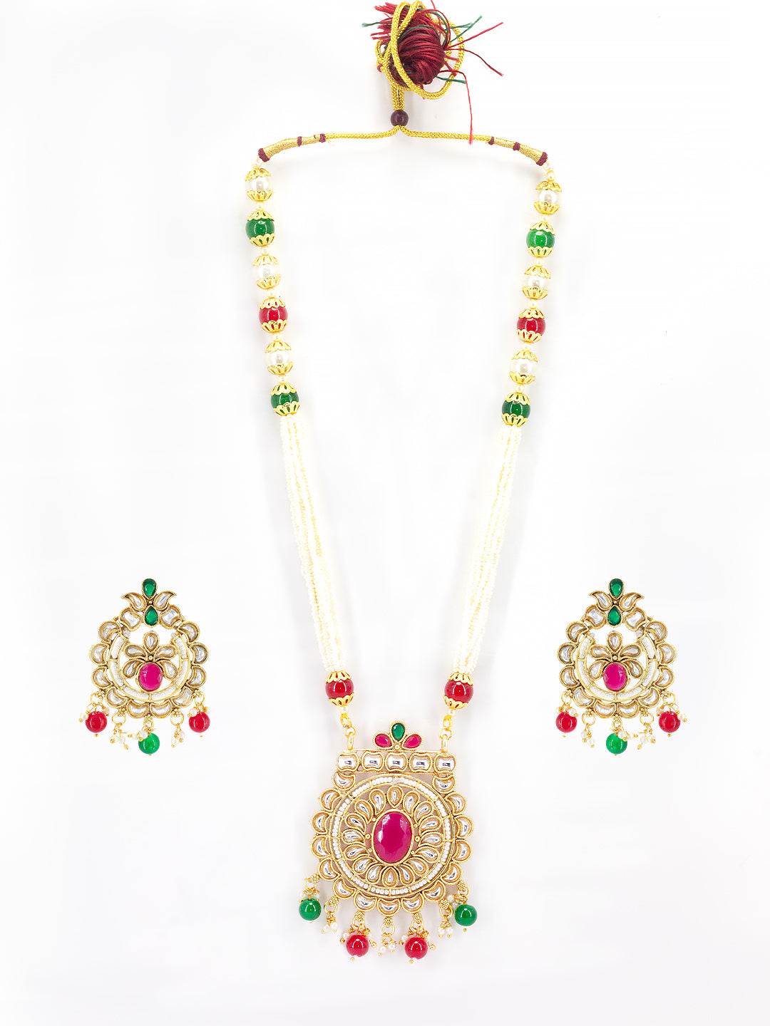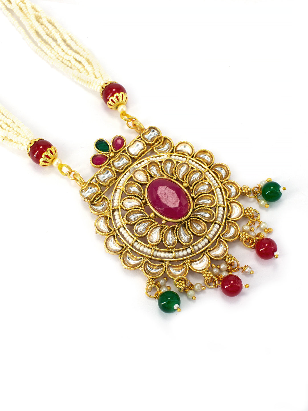 Gold-plated long necklace, has red and white stone-studded and pearl-beaded details