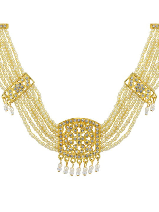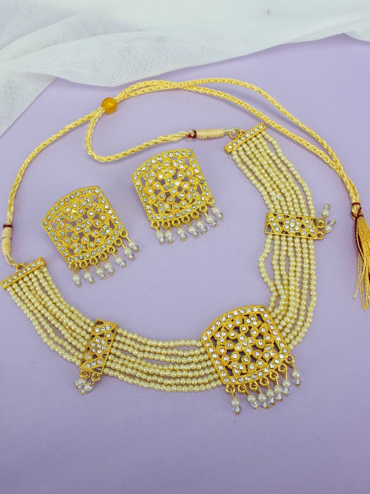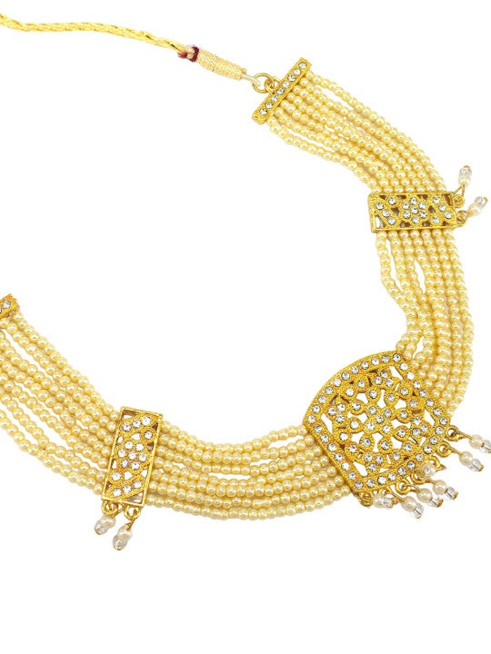 Gold-plated choker necklace, has stone-studded and pearl-beaded details
