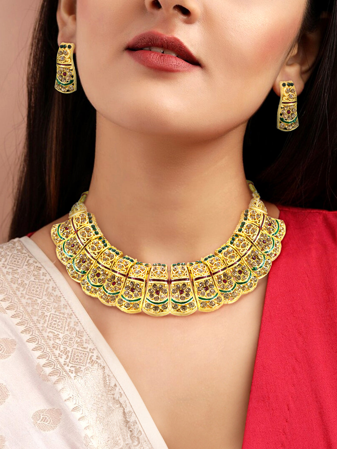 Gold-plated choker rajwadi necklace, has red and green stone-studded details