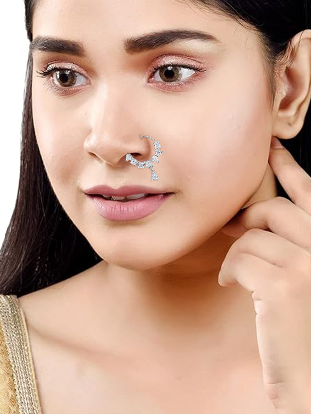 This nose ring is rhodium plated, has AD studded details and secured with insert closure