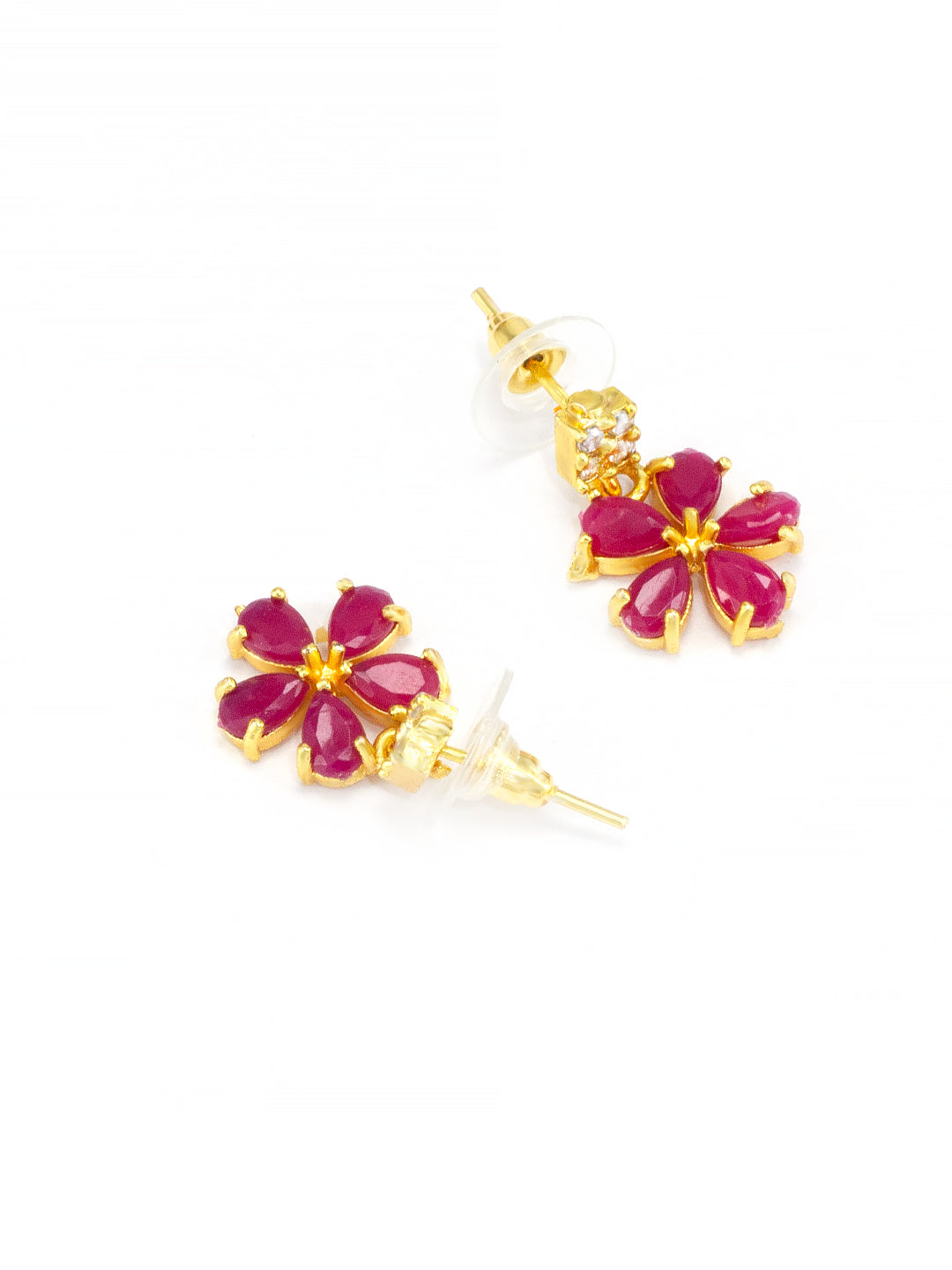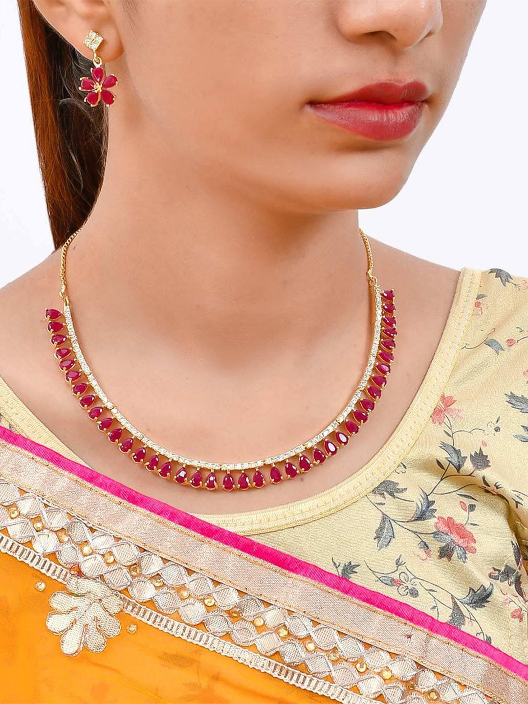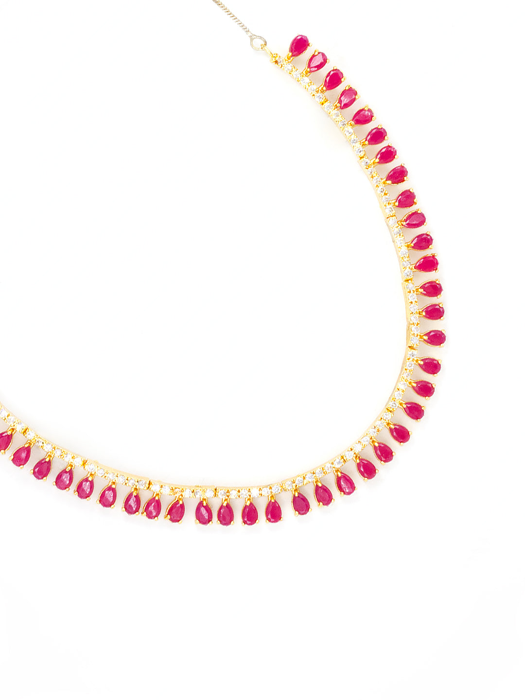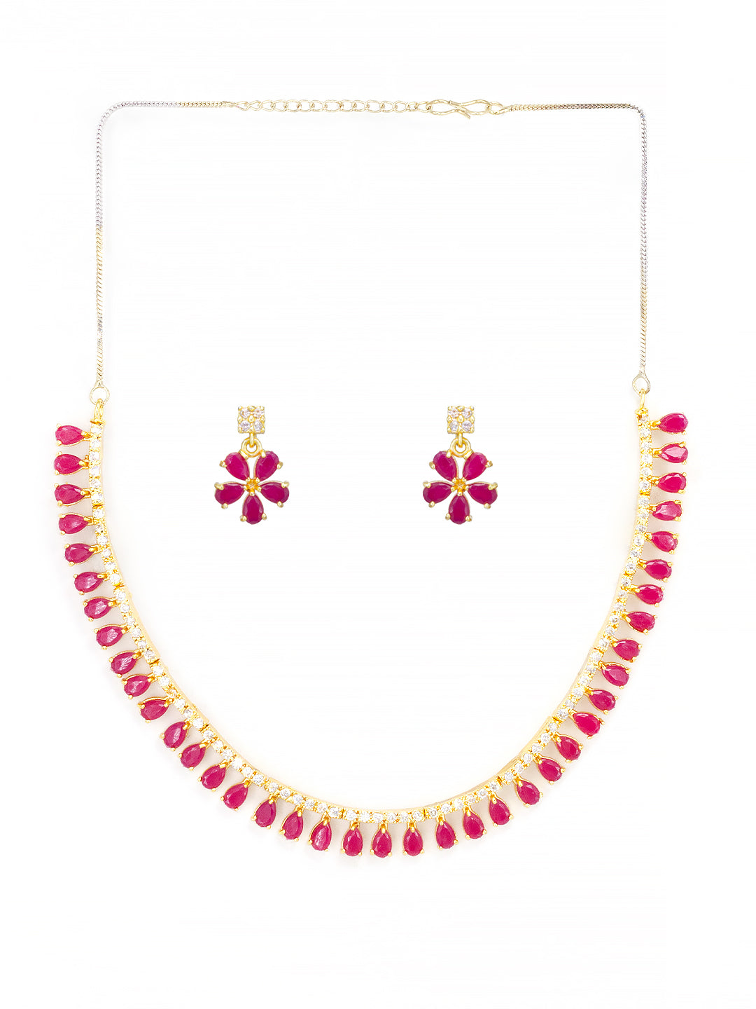 This jewellery set consist of a gold plated necklace and pair of earrings, has AD studded details. Necklace is secured with s-hook closure. Earrings are secured with post & back closure.