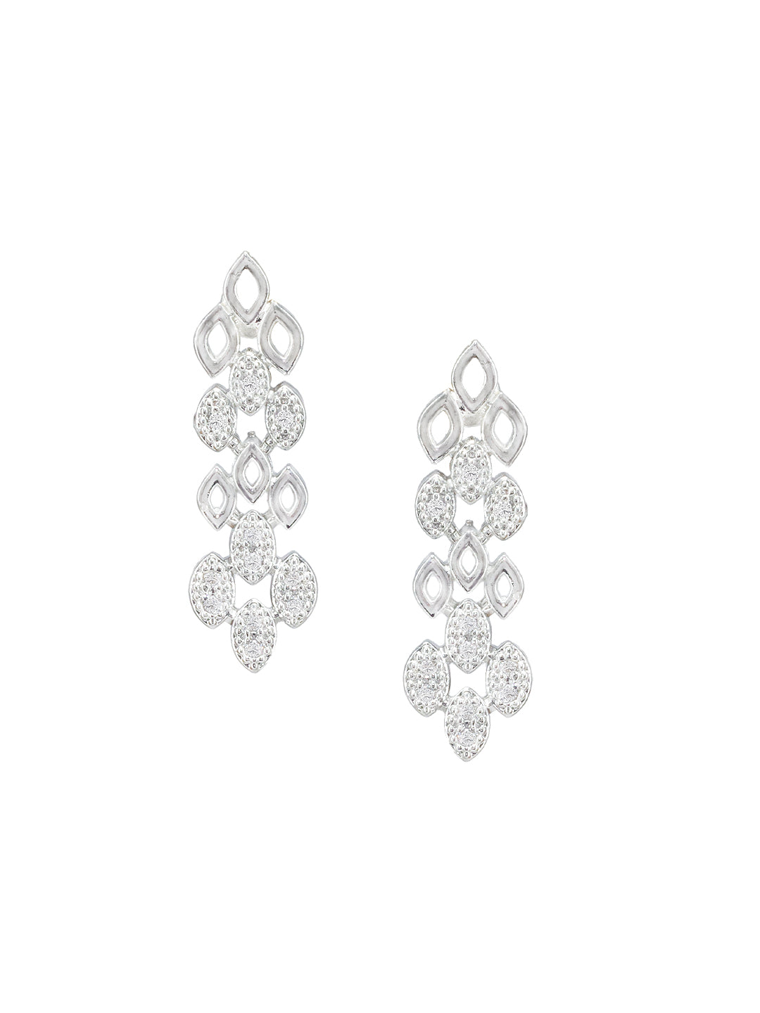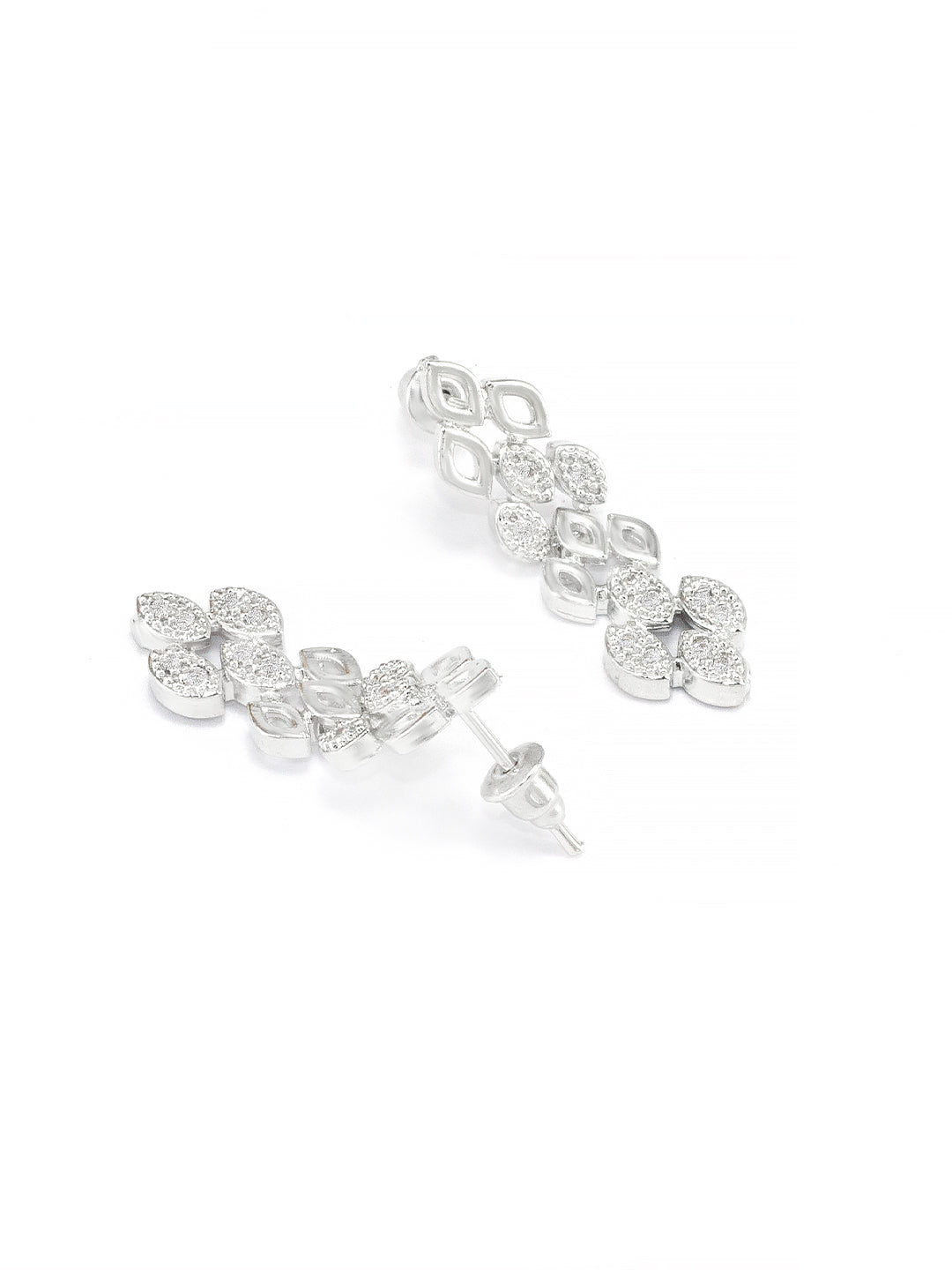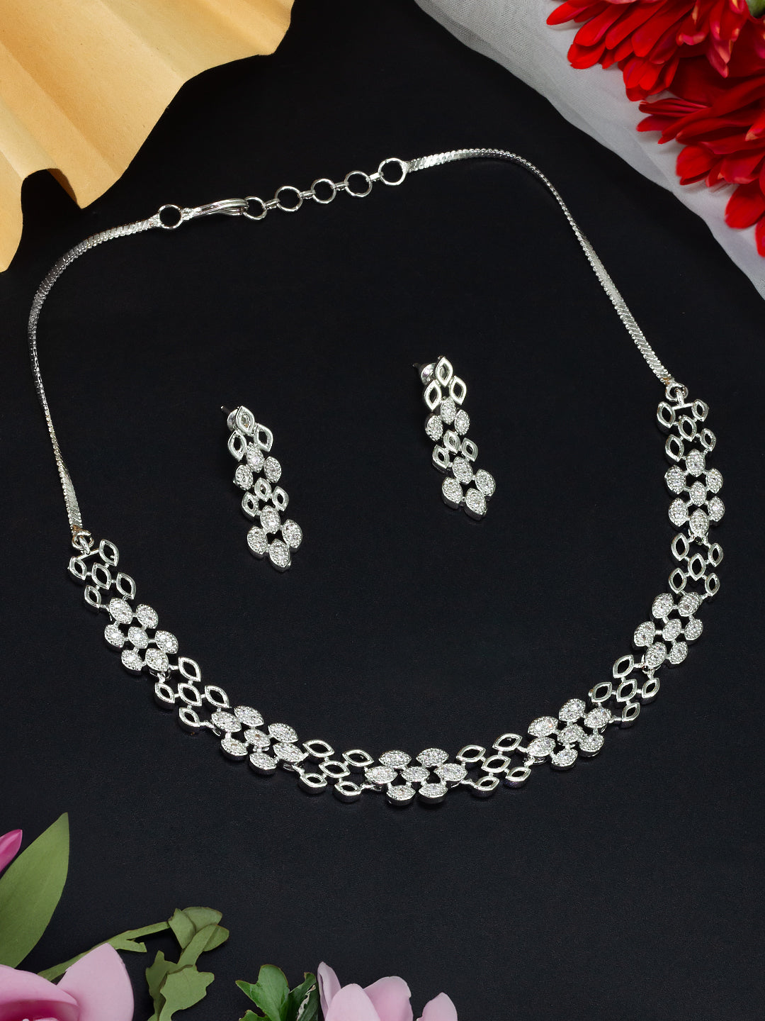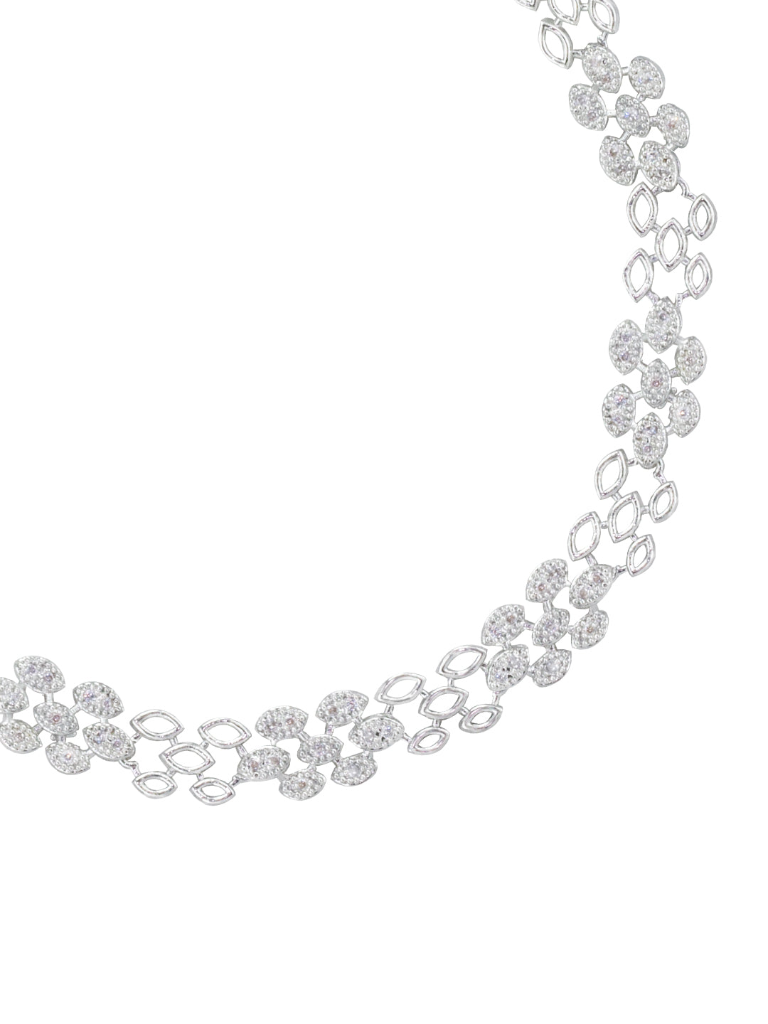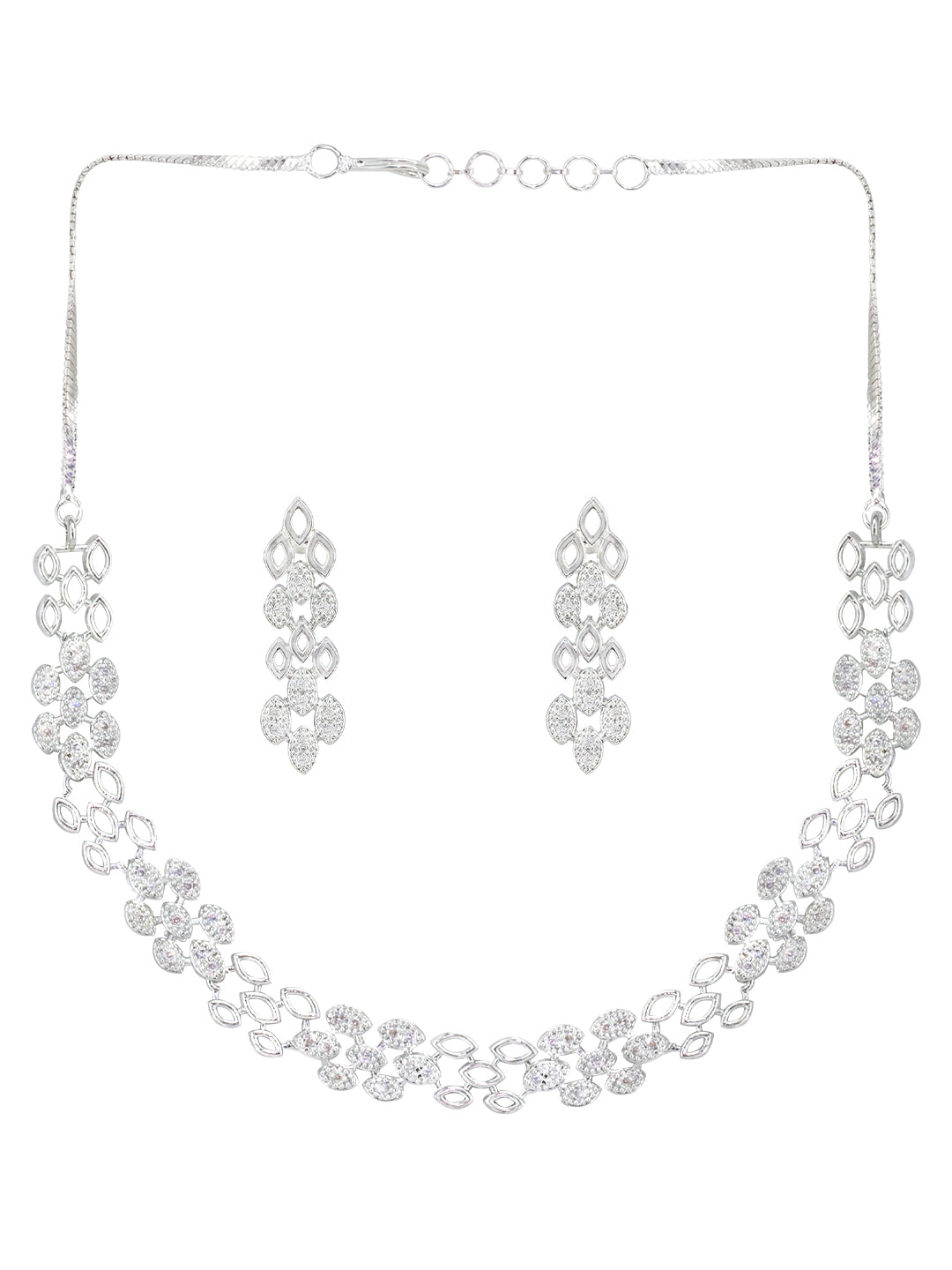 This jewellery set consist of a rhodium plated necklace and pair of earrings, has AD studded details. Necklace is secured with hook closure. Earrings are secured with post & back closure.