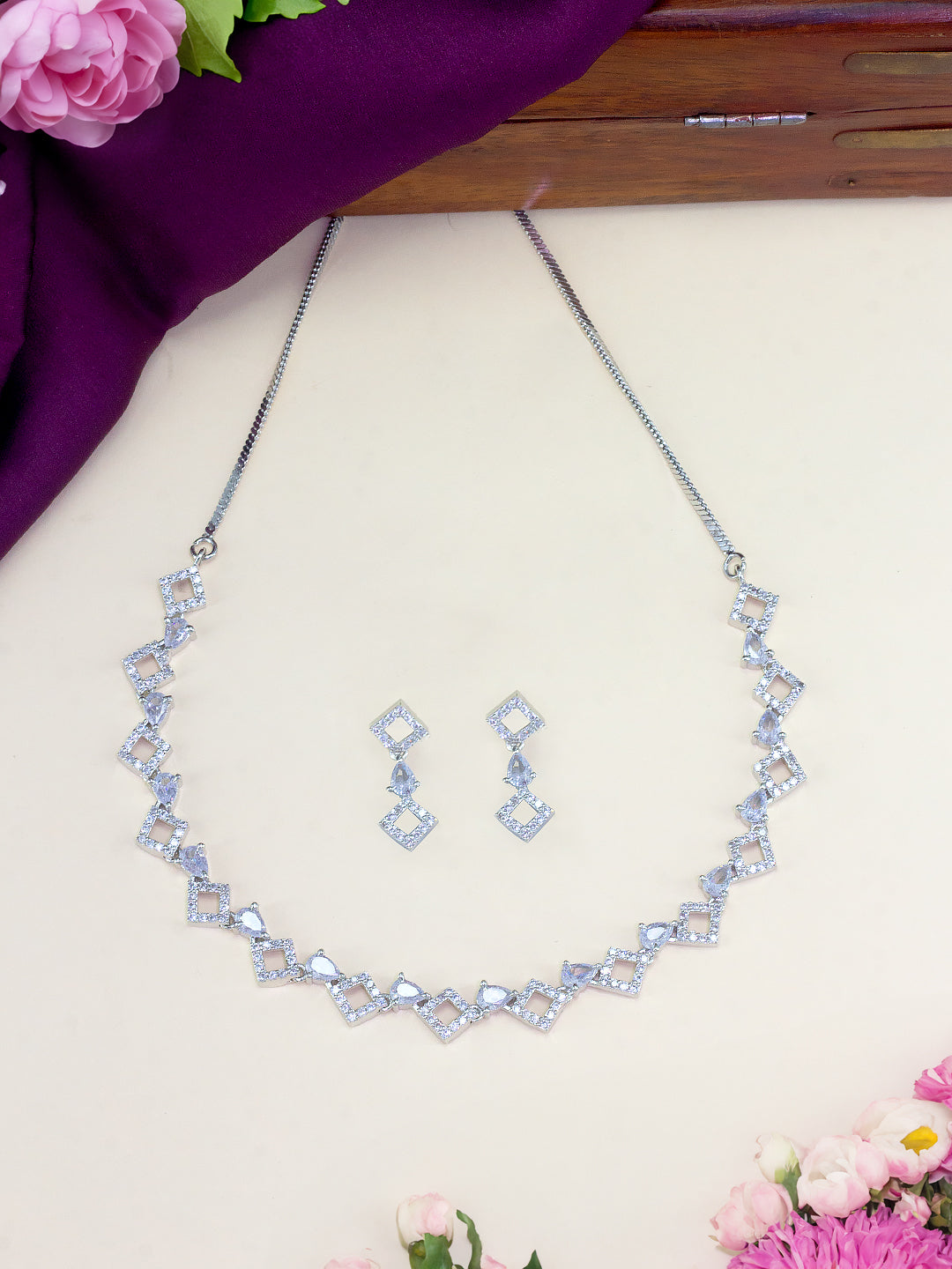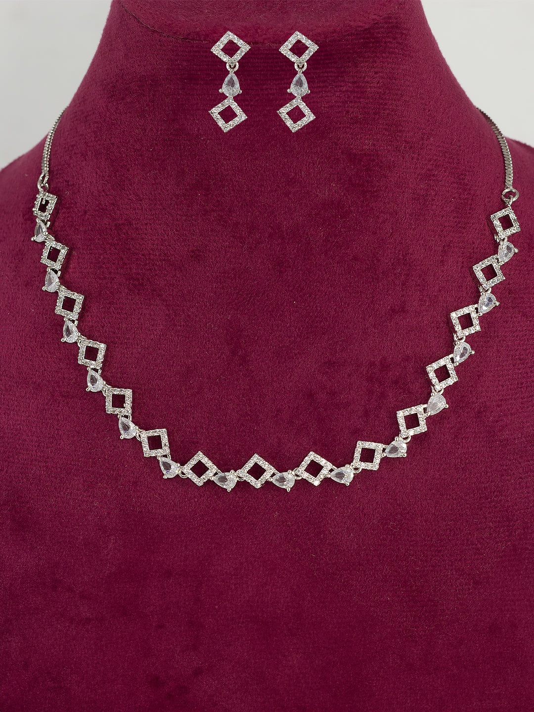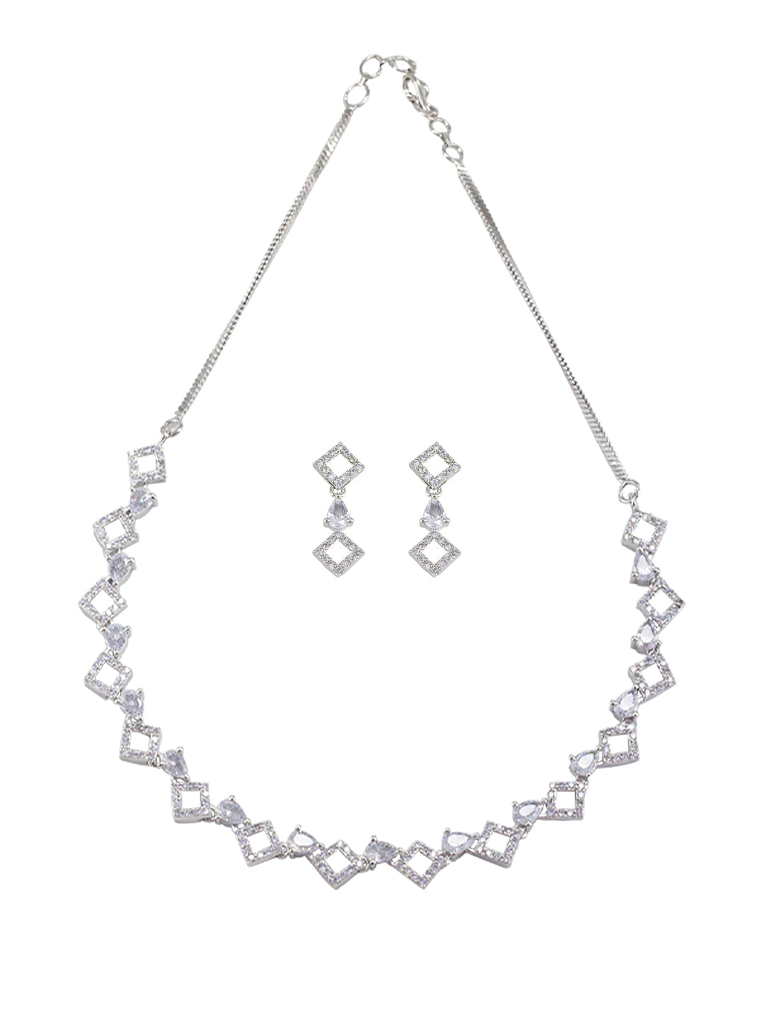 This jewellery set consist of a rhodium plated necklace and pair of earrings. Necklace has AD studded details and secured with hook closure. Earrings are secured with post & back closure.
