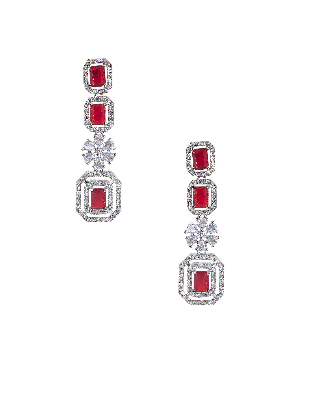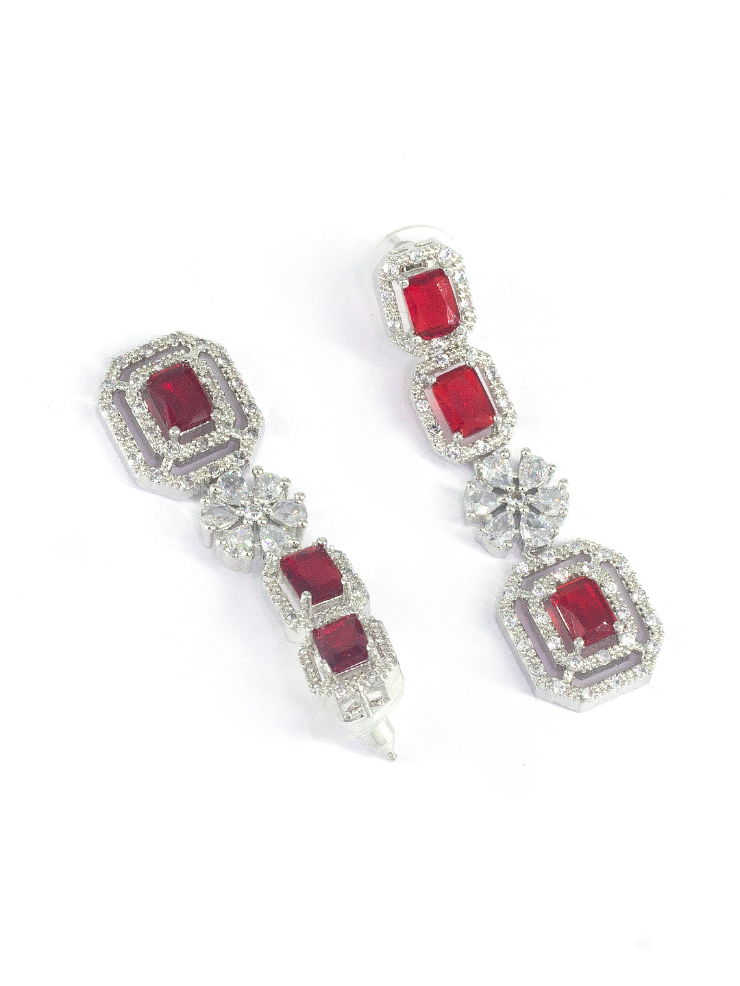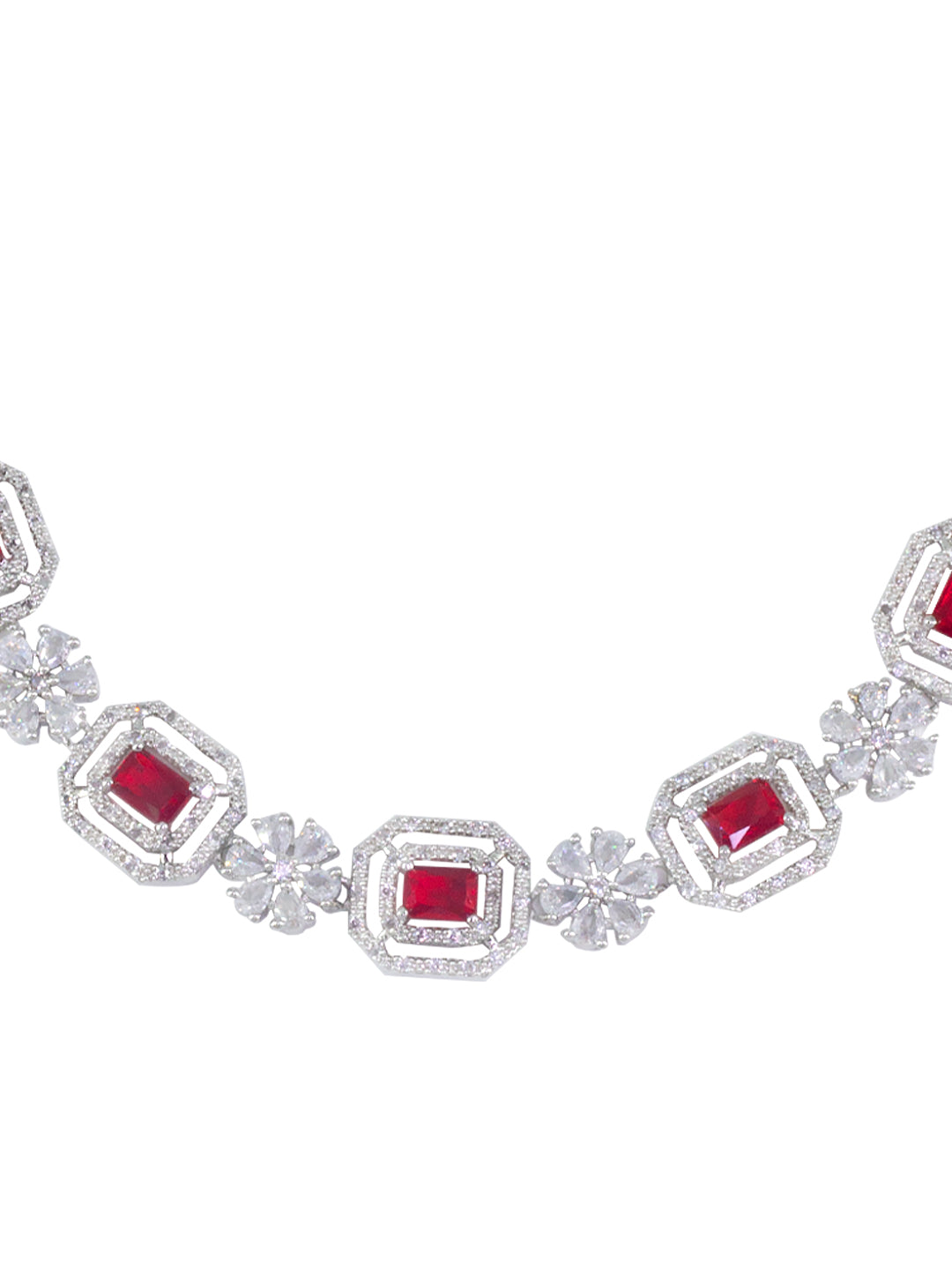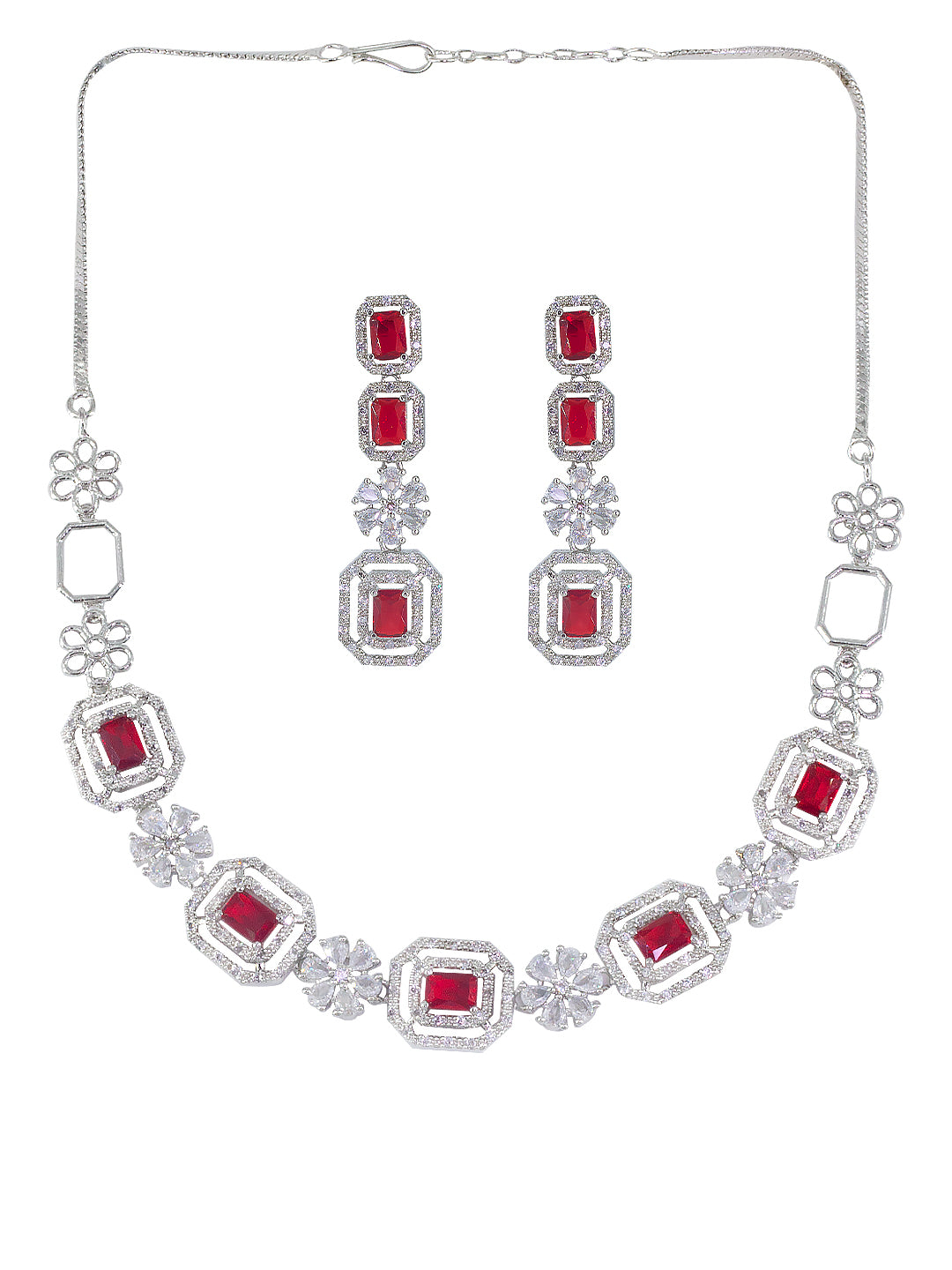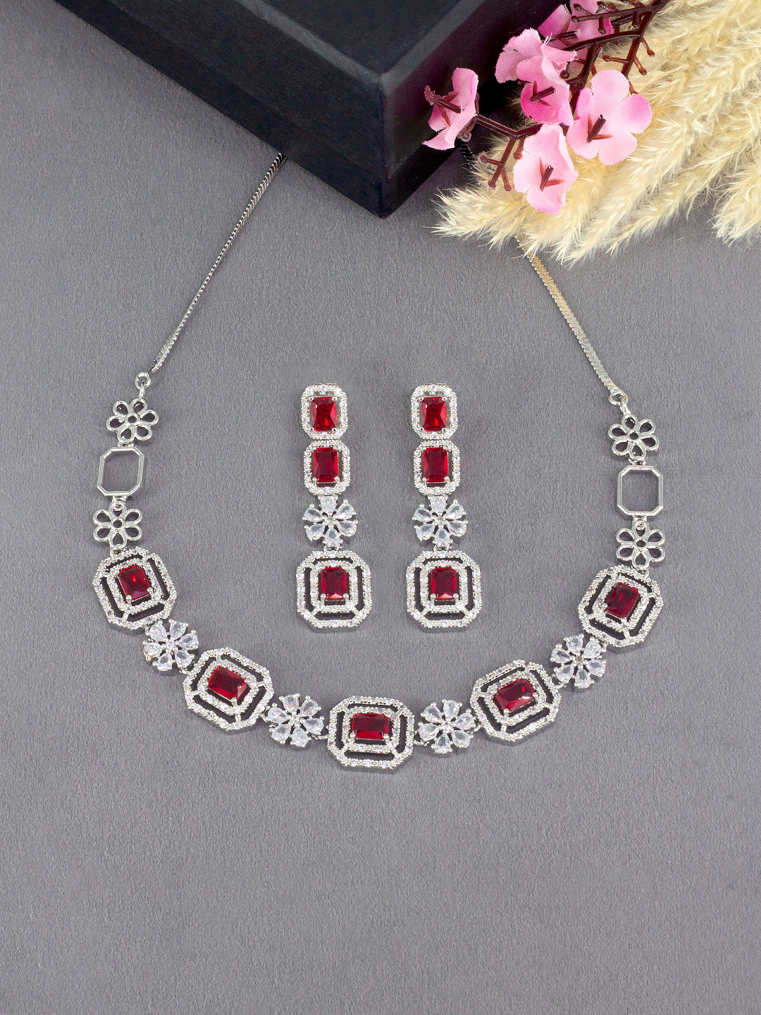 Rhodium Plated Red Floral American Diamond Jewellery Set