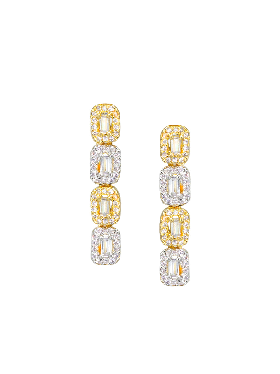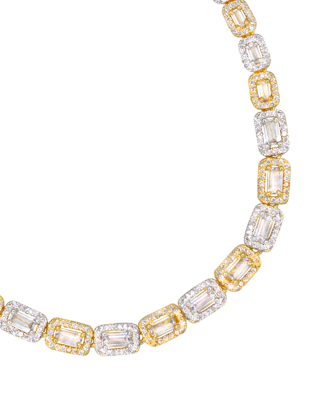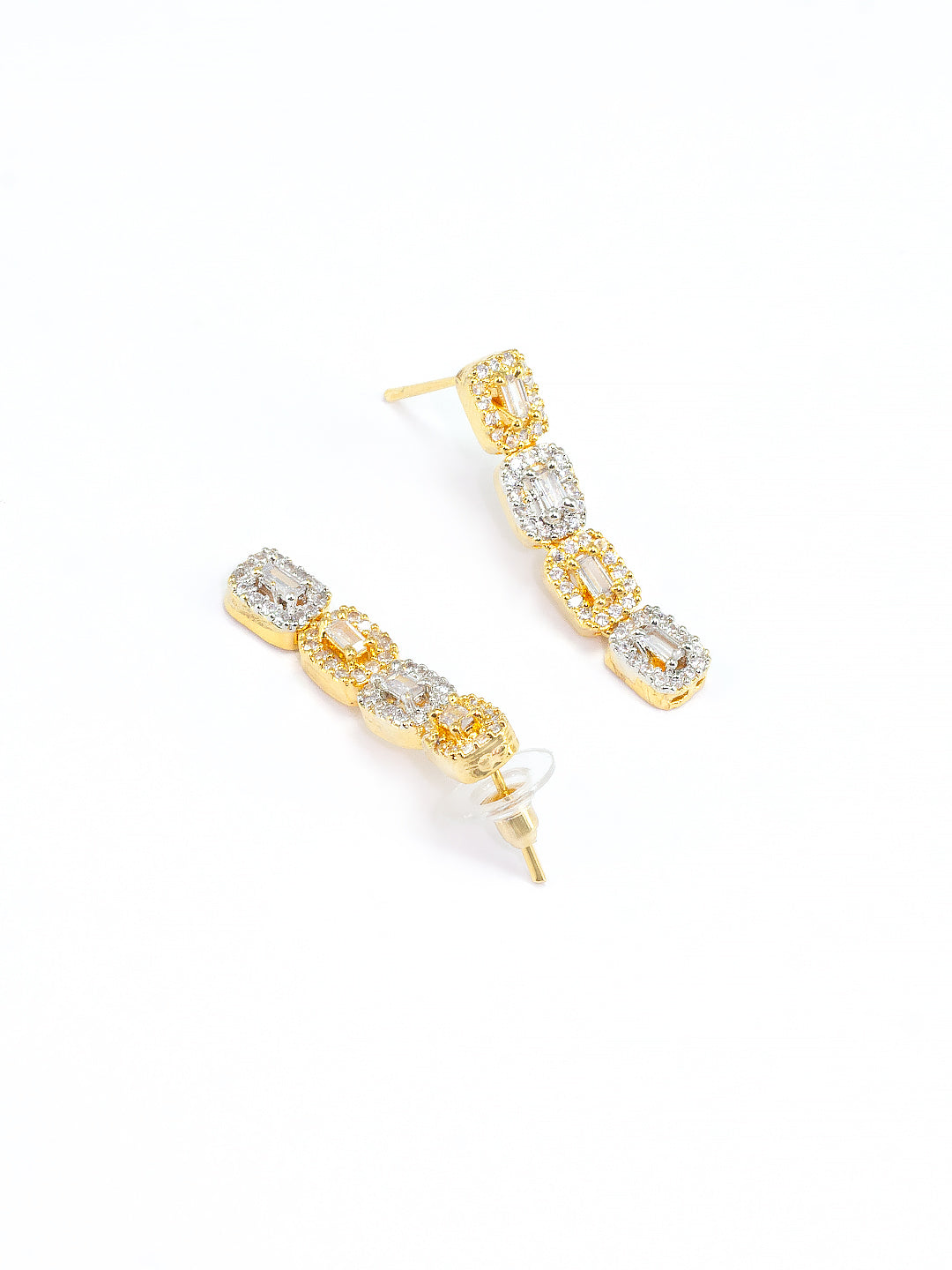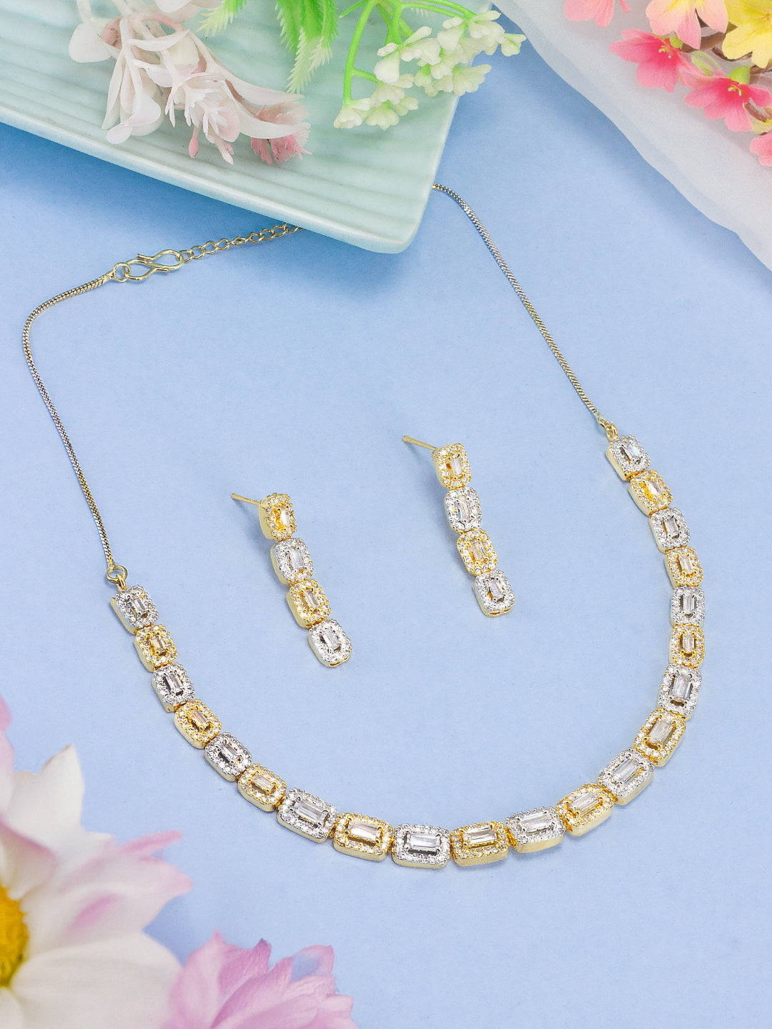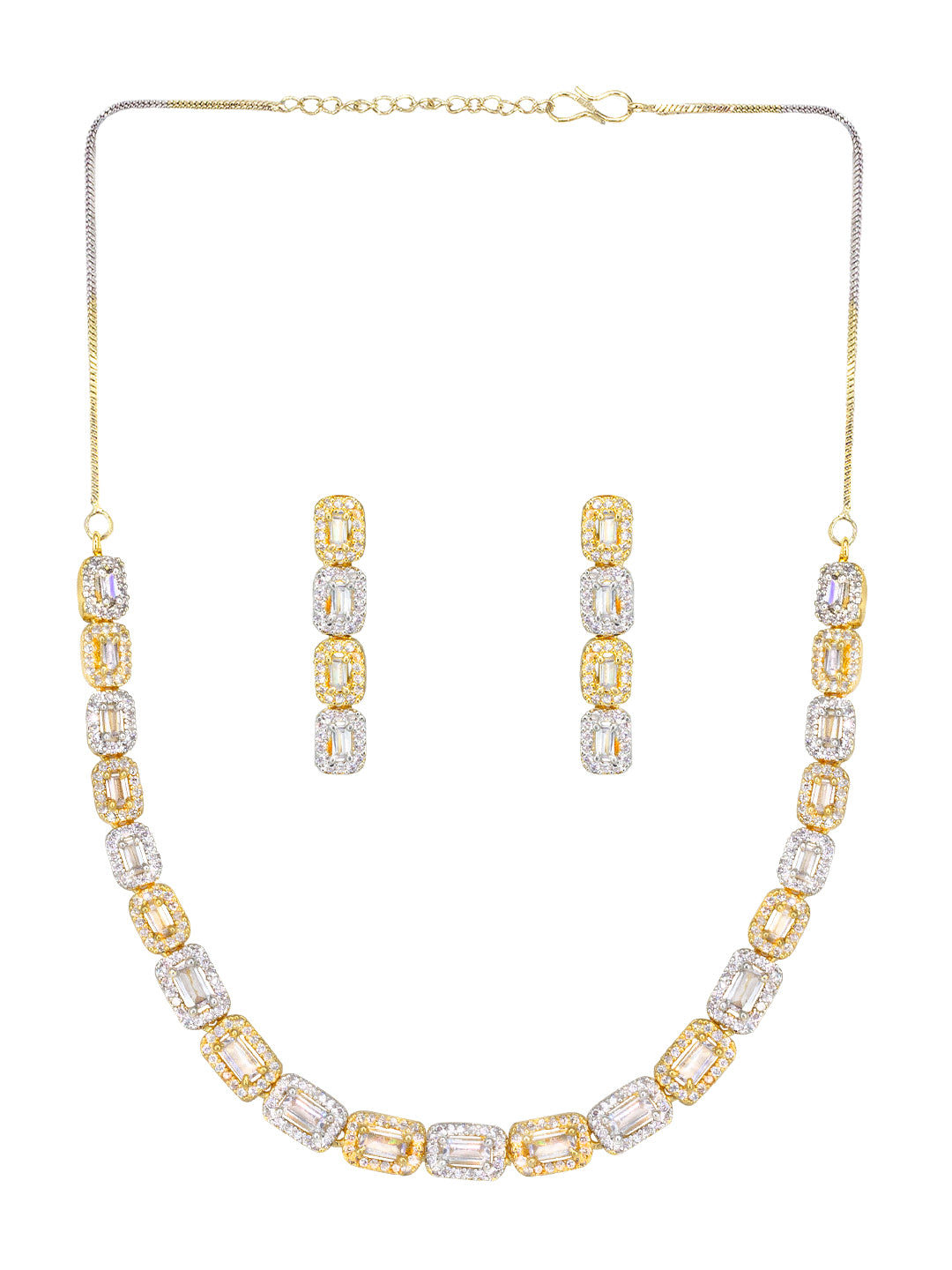 This jewellery set consist of a gold plated necklace and pair of earrings, has AD studded details. Necklace is secured with s-hook closure. Earrings are secured with post & back closure.