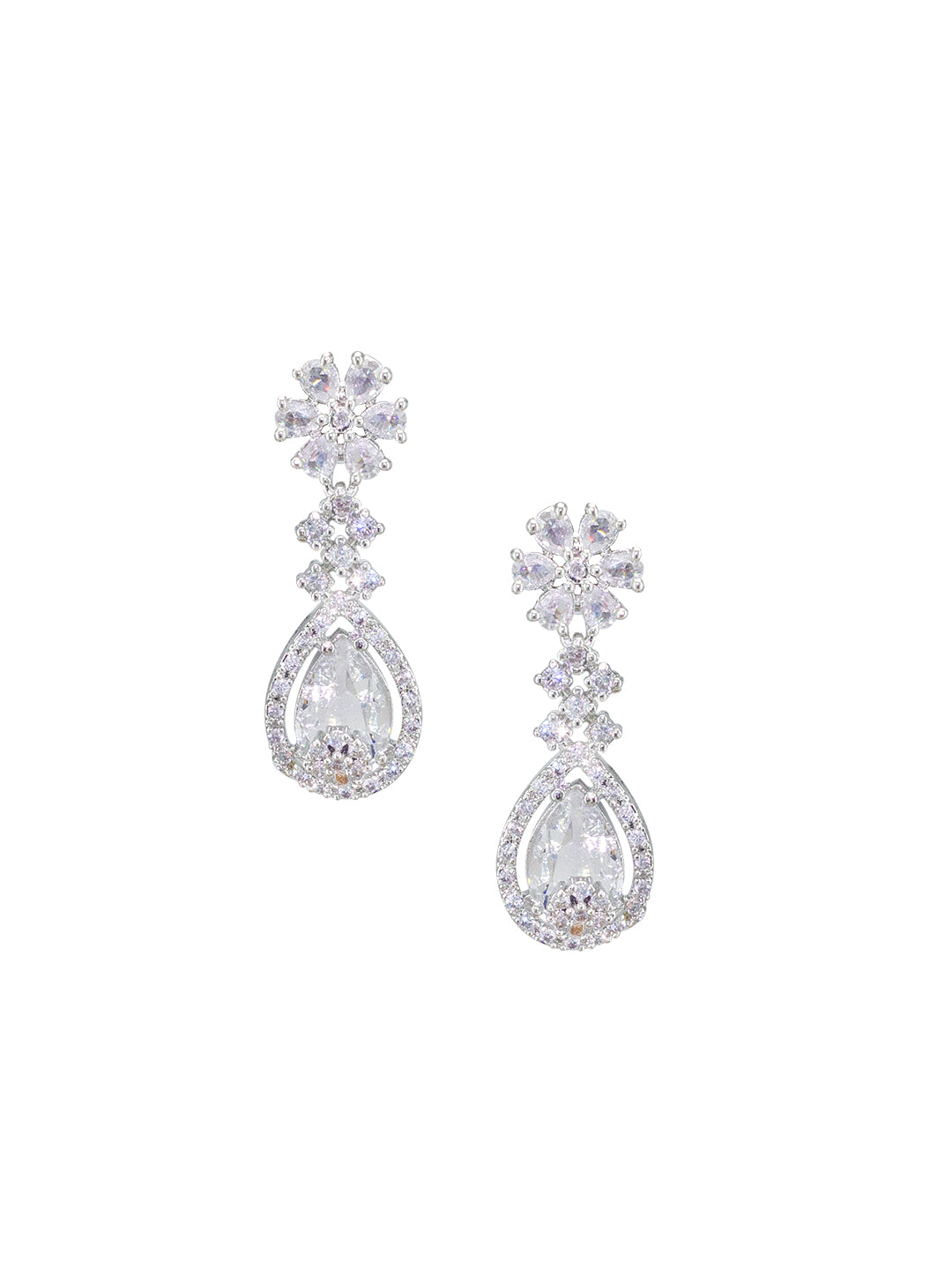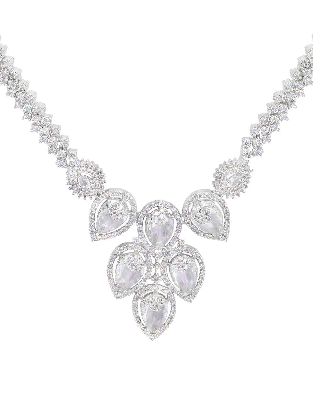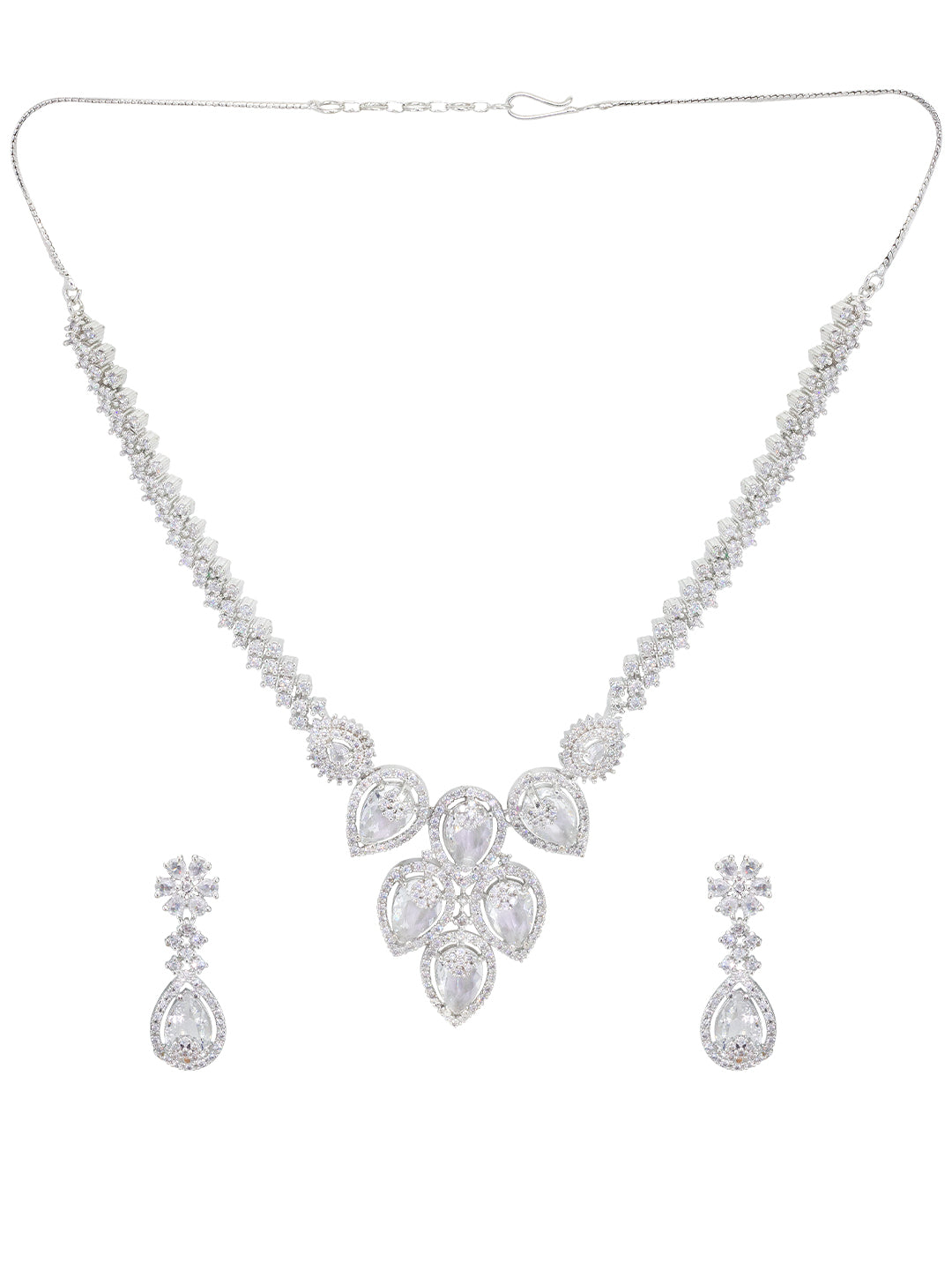 This jewellery set consist of a rhodium plated necklace and pair of earrings. Necklace has AD studded details and secured with hook closure. Earrings are secured with post & back closure.