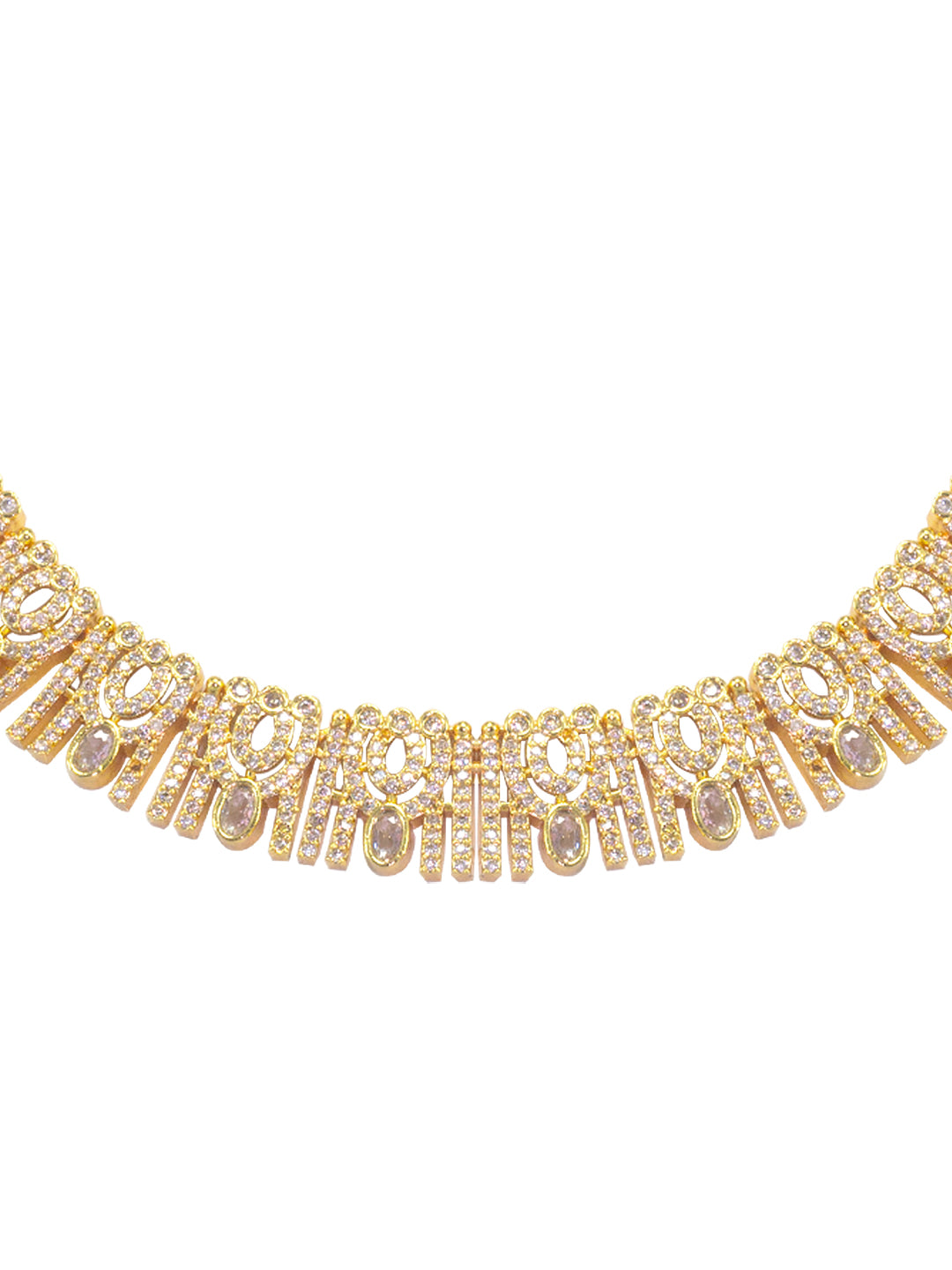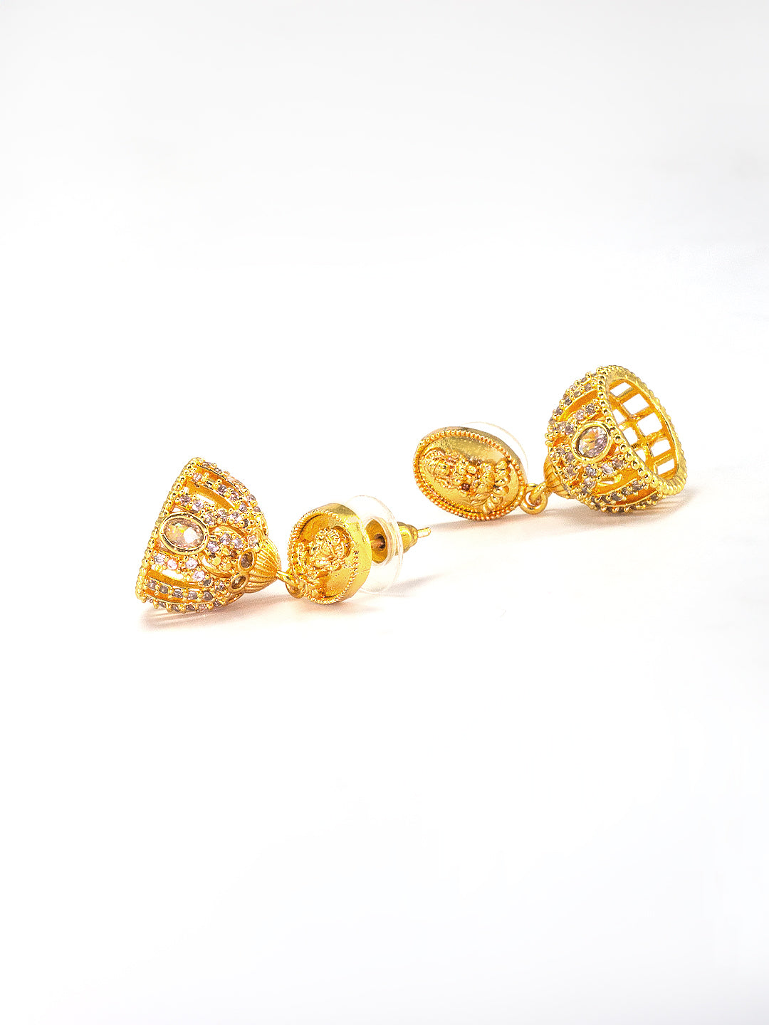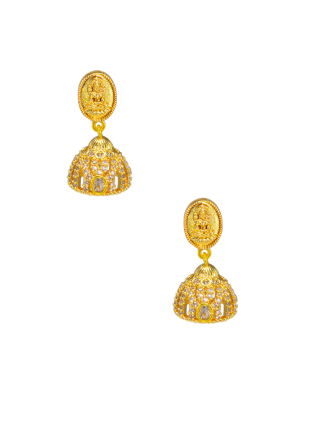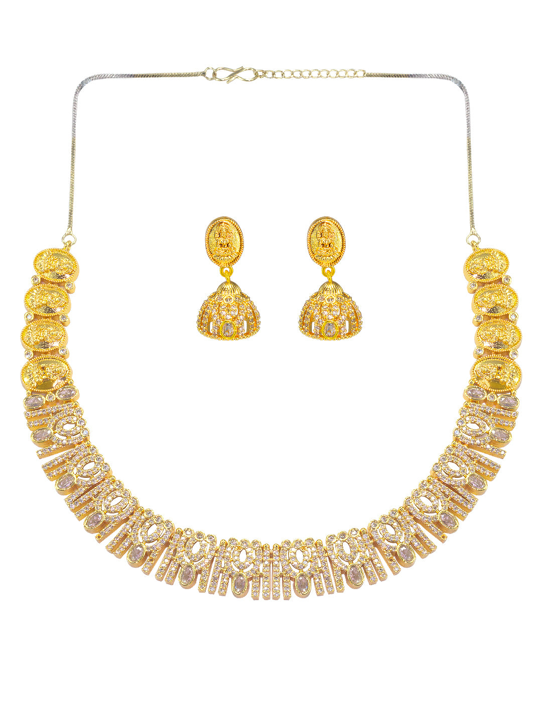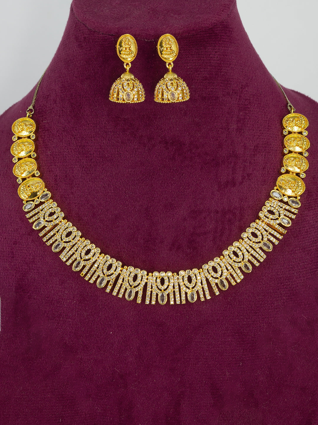 This jewellery set consist of a gold plated necklace and pair of Jhumka earrings. Necklace has AD studded and temple motif details and secured with s-hook closure. Jhumka Earrings are secured with post & back closure.