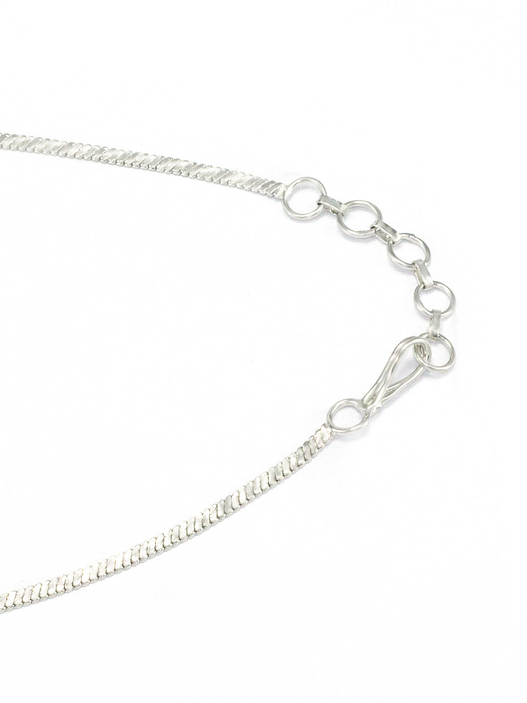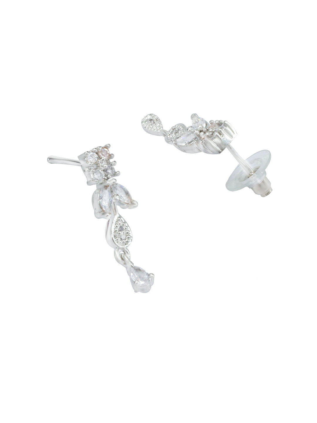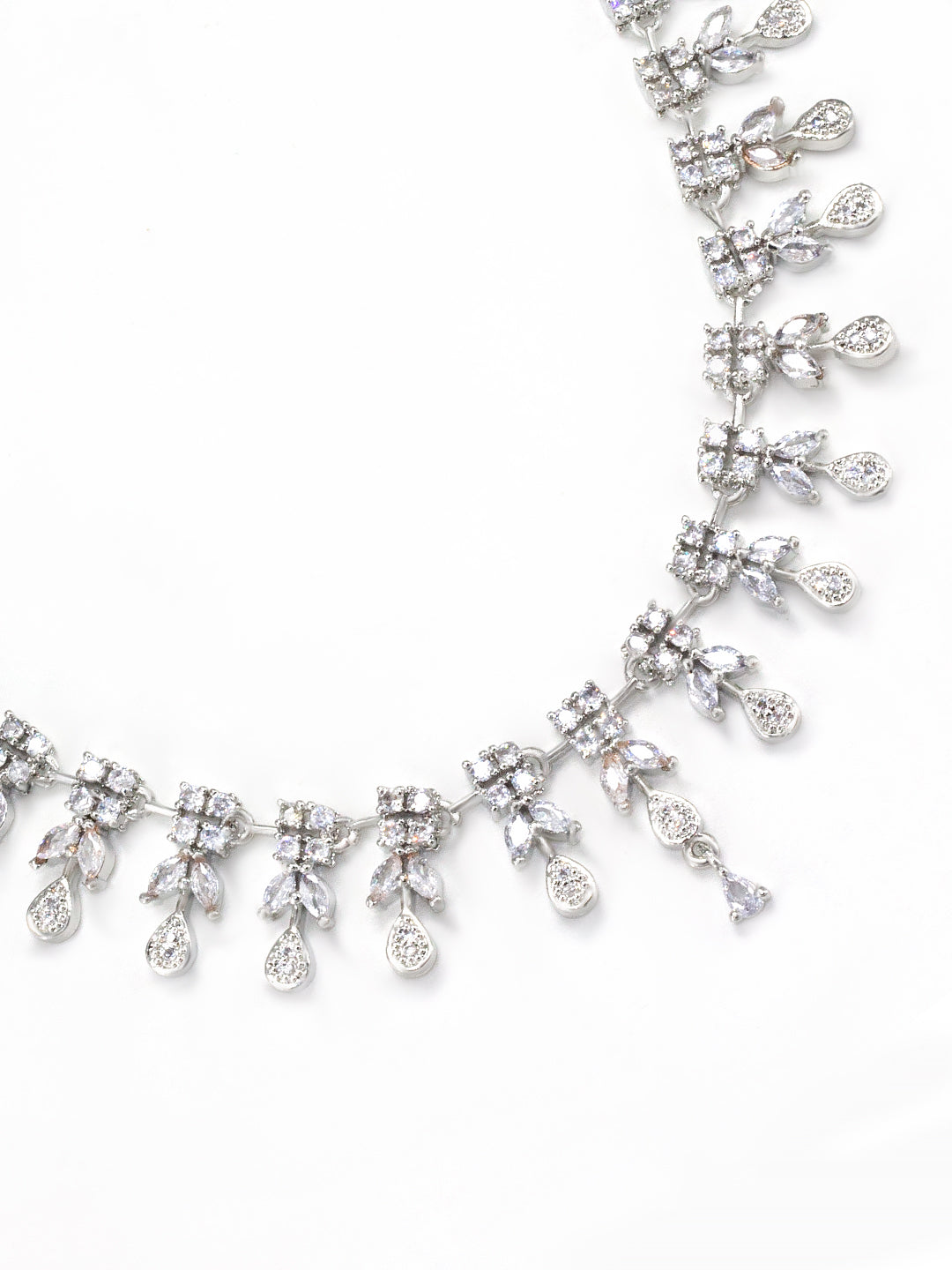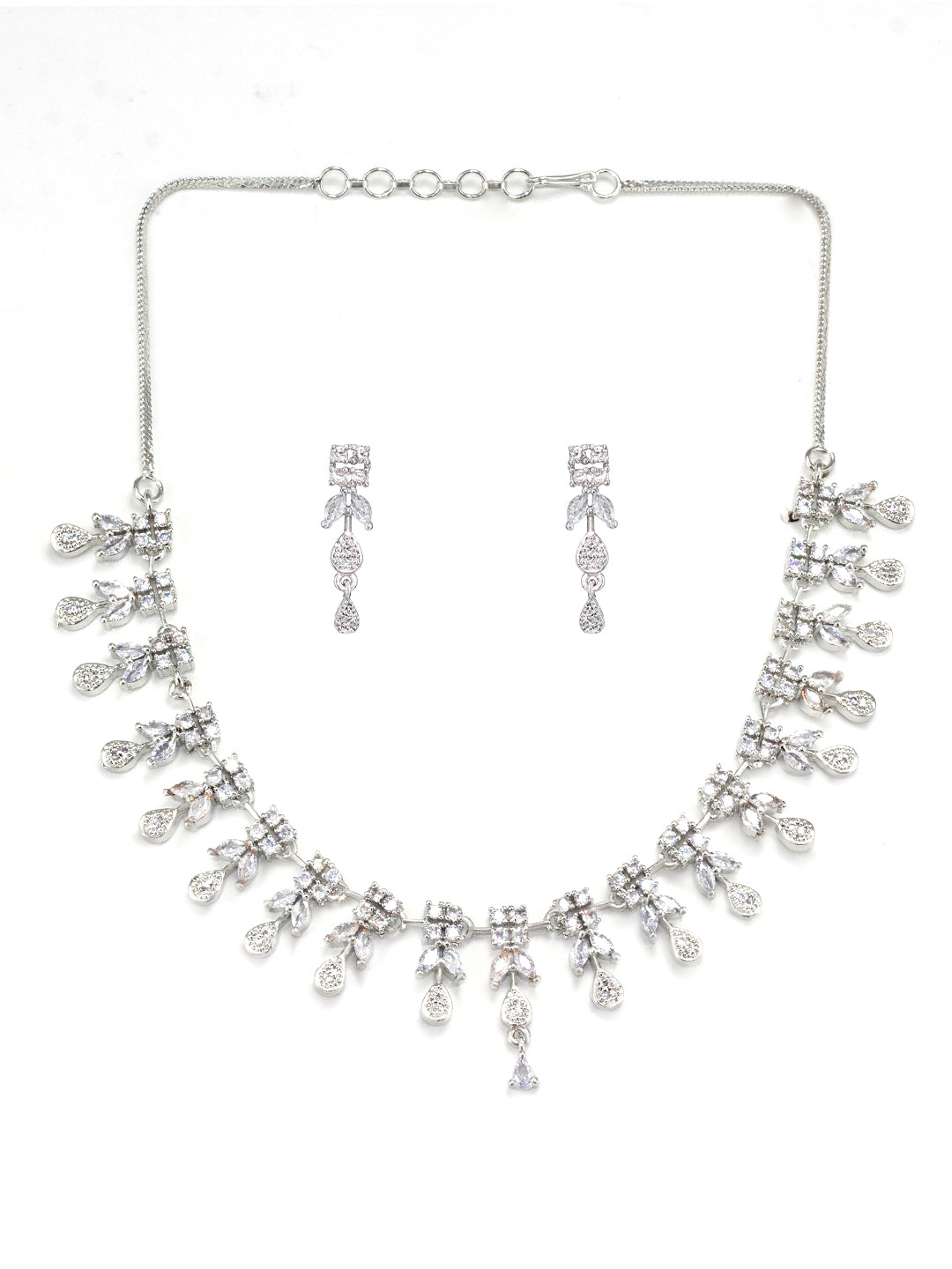 This jewellery set consist of a necklace & a pair of earrings set. The necklace is rhodium plated, had AD studded details and secured with s-hook closure. A pair of earrings are rhodium plated, has AD studded details and secured with post and back closure.