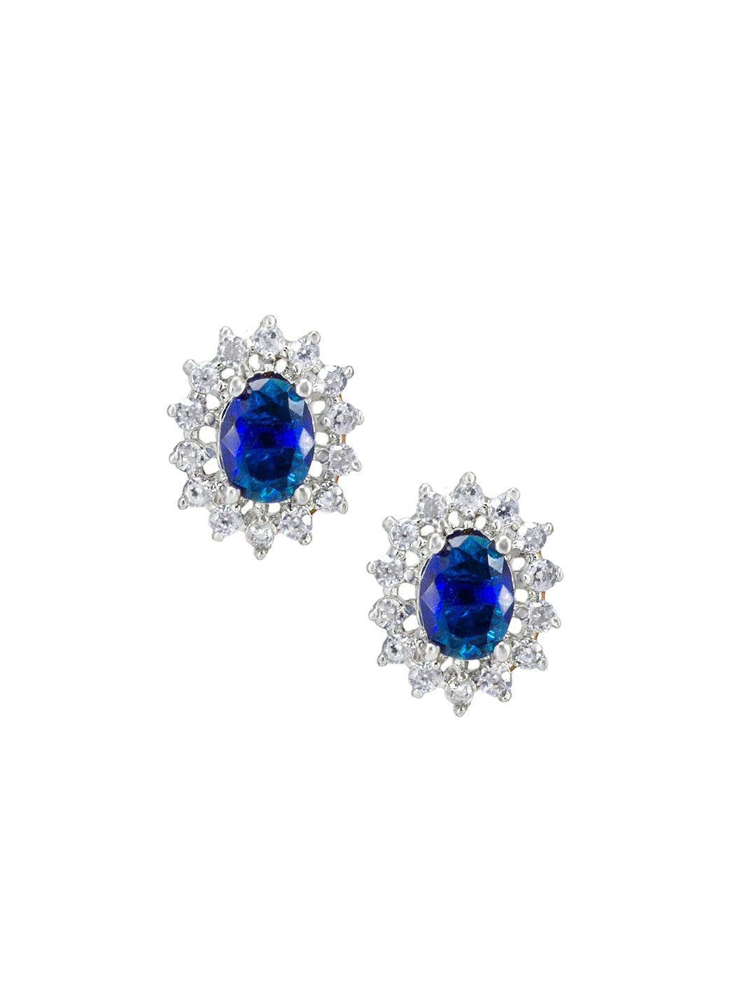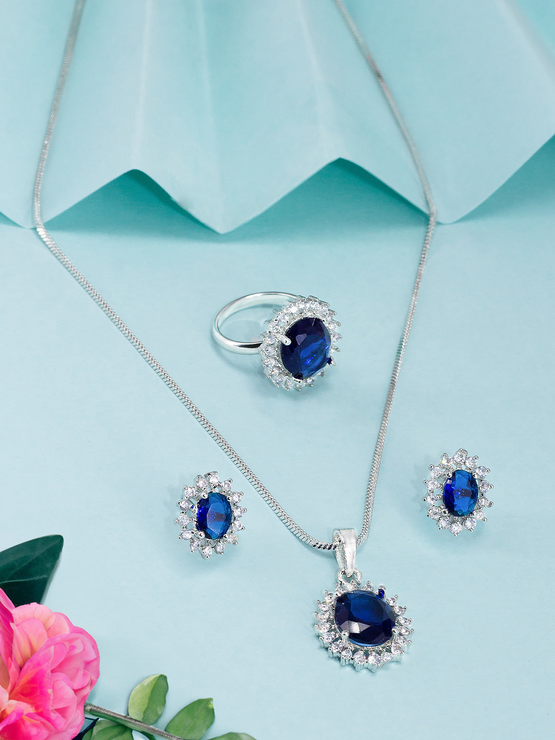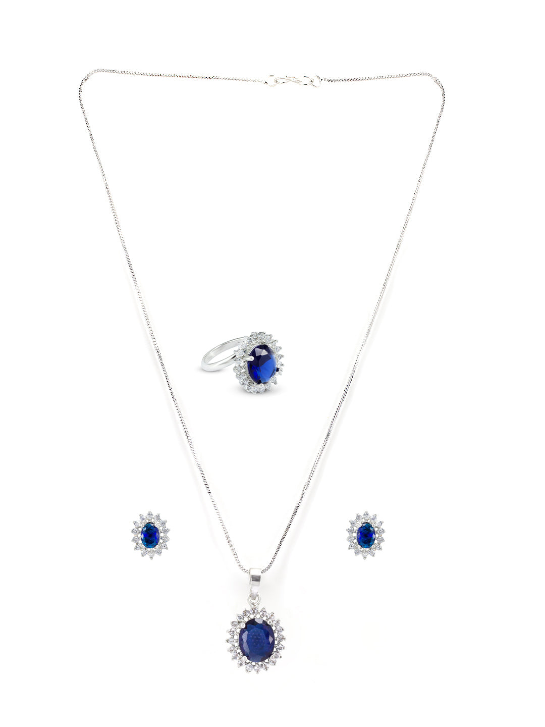 Rhodium Plated Blue American Diamond Studded Pendant Set With Ring