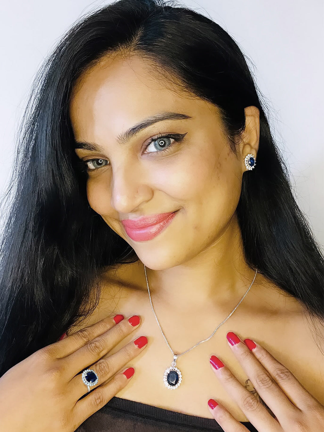 This jewellery set consist of a pendant with chain, pair of earrings and adjustable ring. Pendant is silver plated, has AD studded details and secured with post & back closure. Earrings are secured with post and back closure. Ring is secured with slip on closure and adjustable to wear.