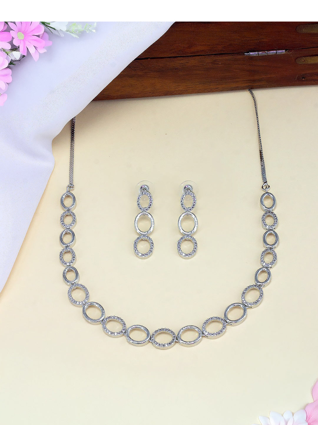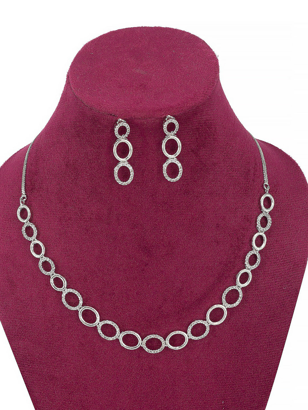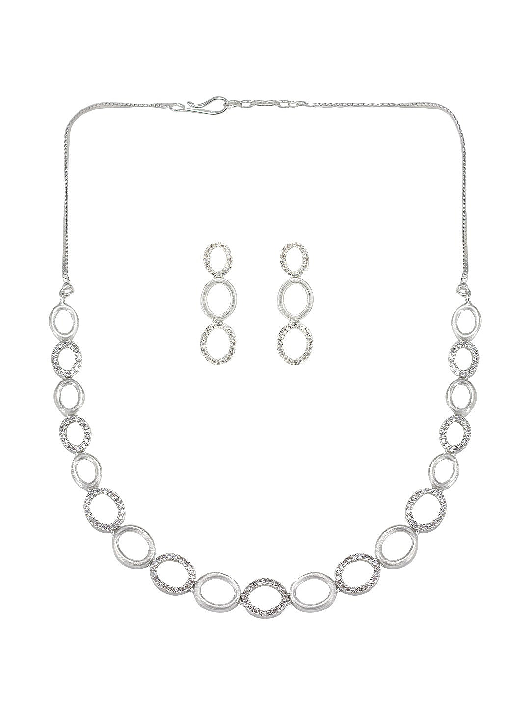 This jewellery set consist of a rhodium plated necklace and a pair of earrings, has AD studded details. Necklace is oval shaped and secured with hook closure and earrings are secured with post and back closure.
