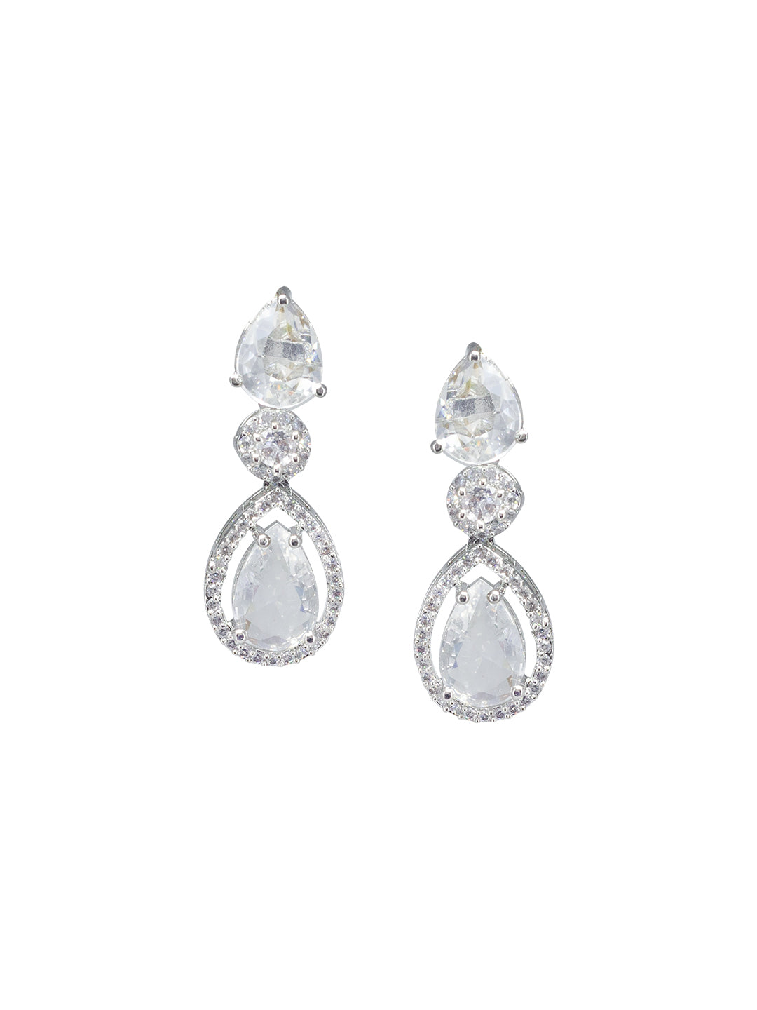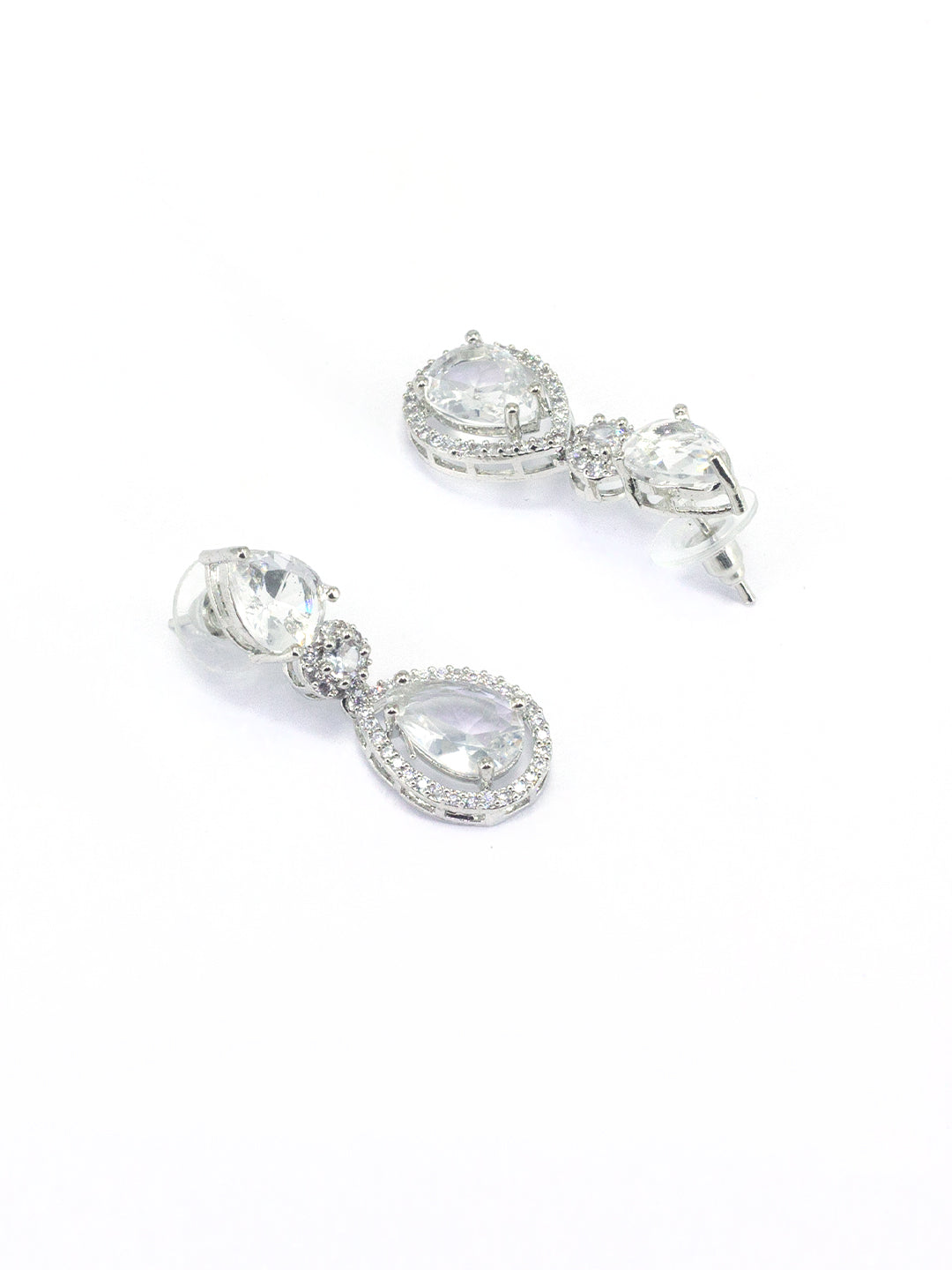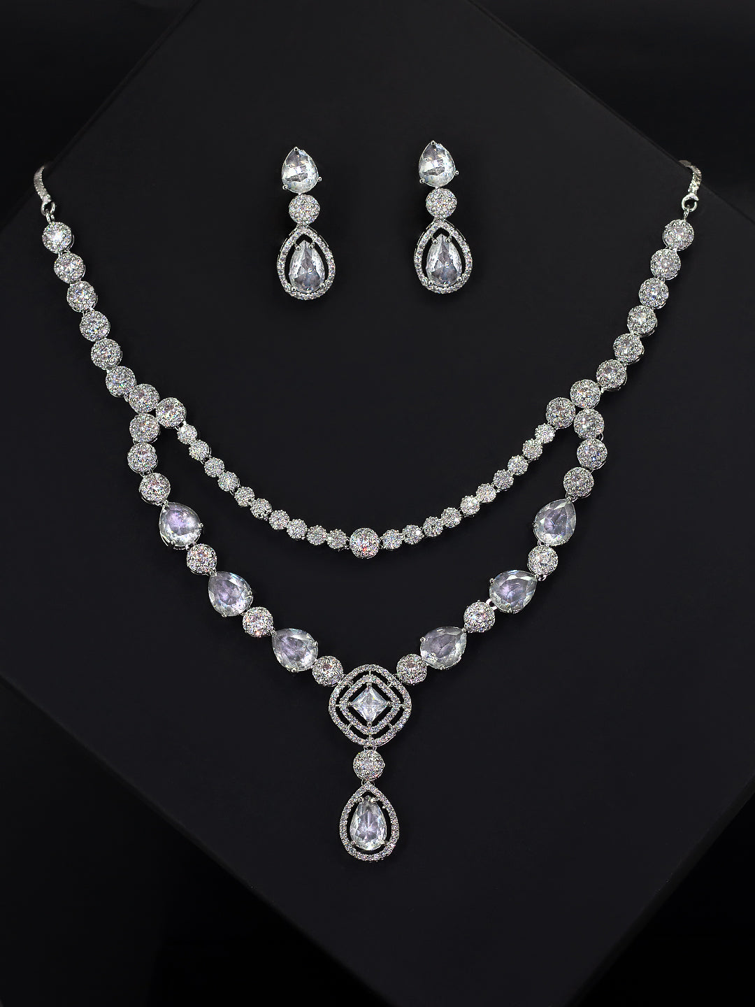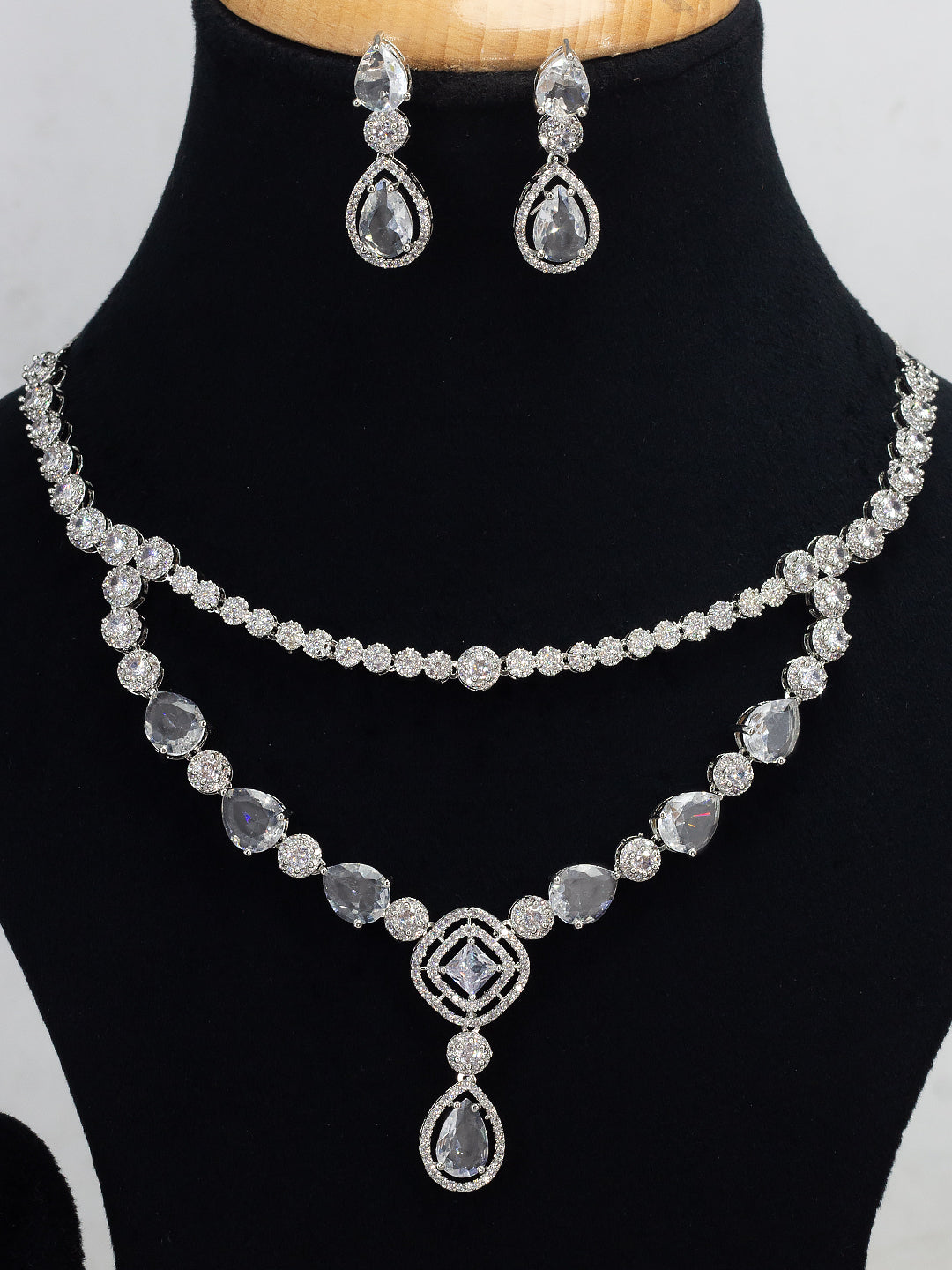 Rhodium Plated Double Layered & Teardrop AD Jewellery Set