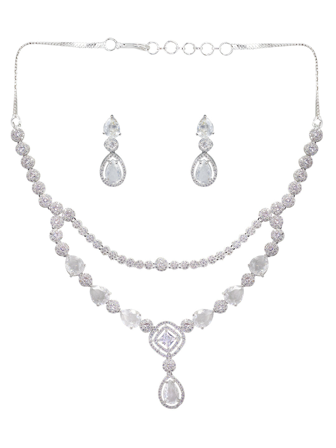 This jewellery set consist of a rhodium plated necklace & a pair of earrings, has AD studded, teardrop and double layered details and secured with hook closure. Earrings are secured with post & back closure.