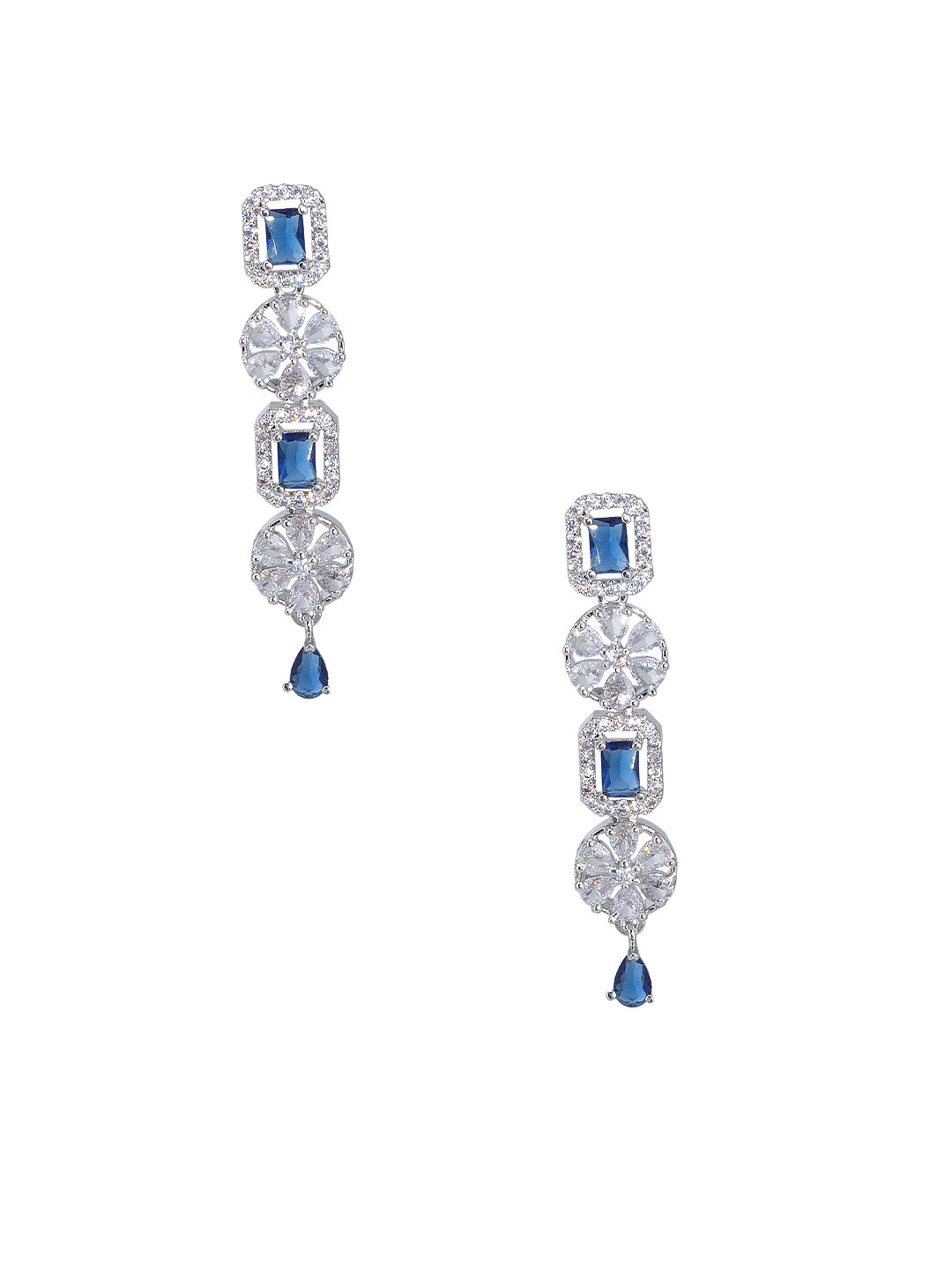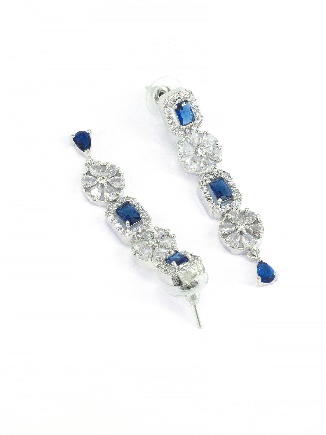 This jewellery set consist of a rhodium plated necklace and a pair of earrings, has blue star cut AD studded details. Necklace is secured with hook closure and earrings are secured with post and back closure.