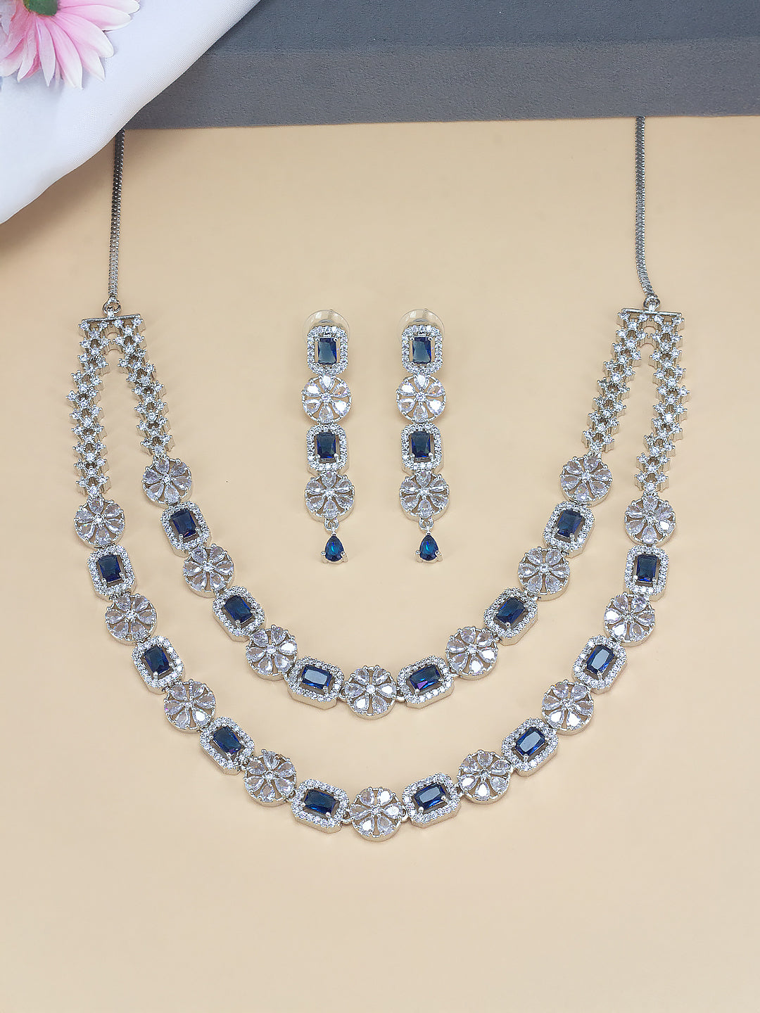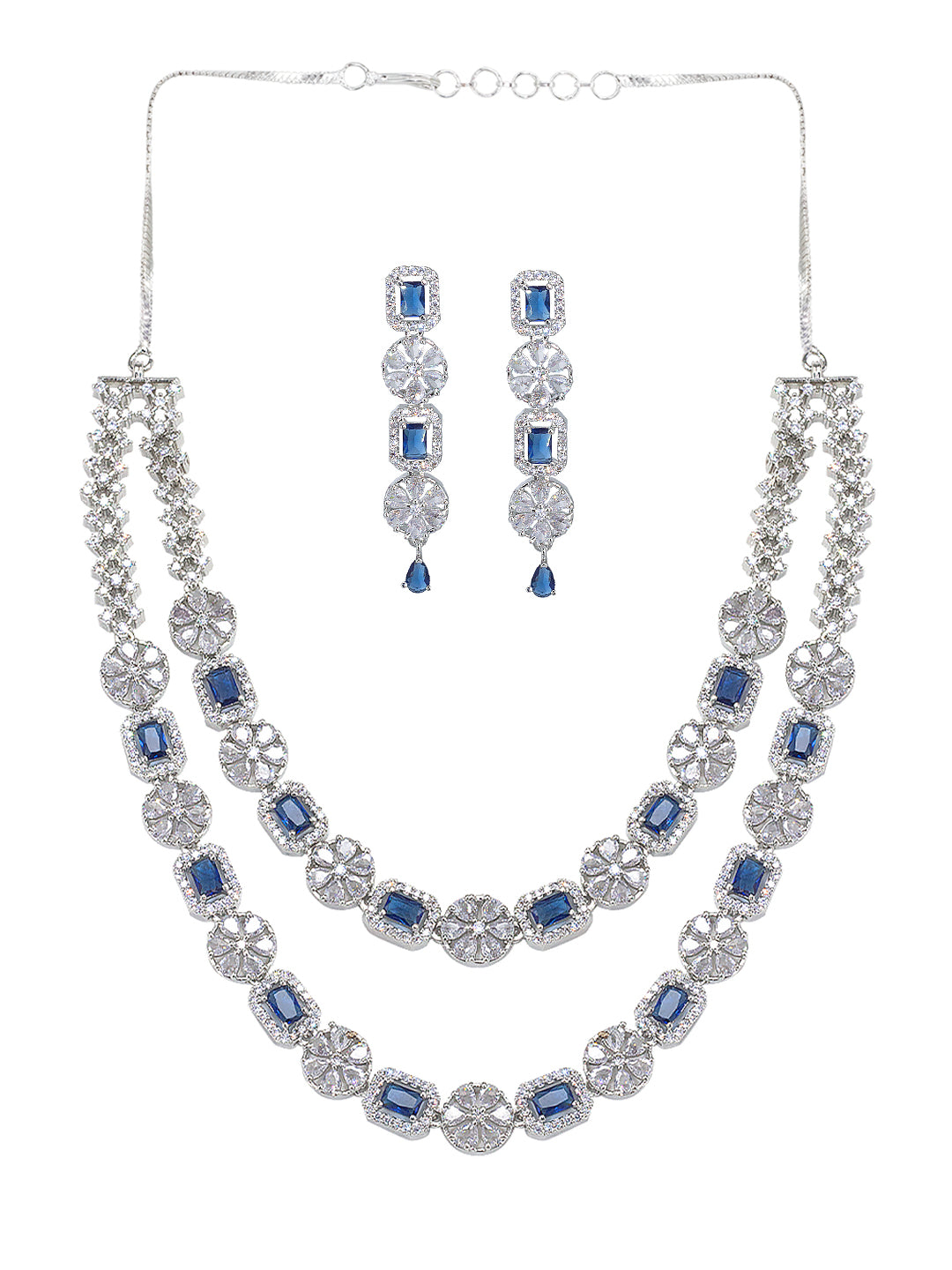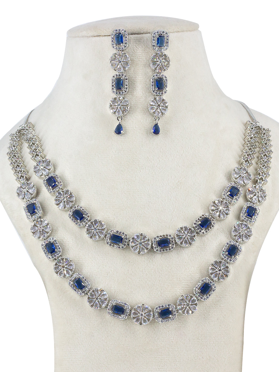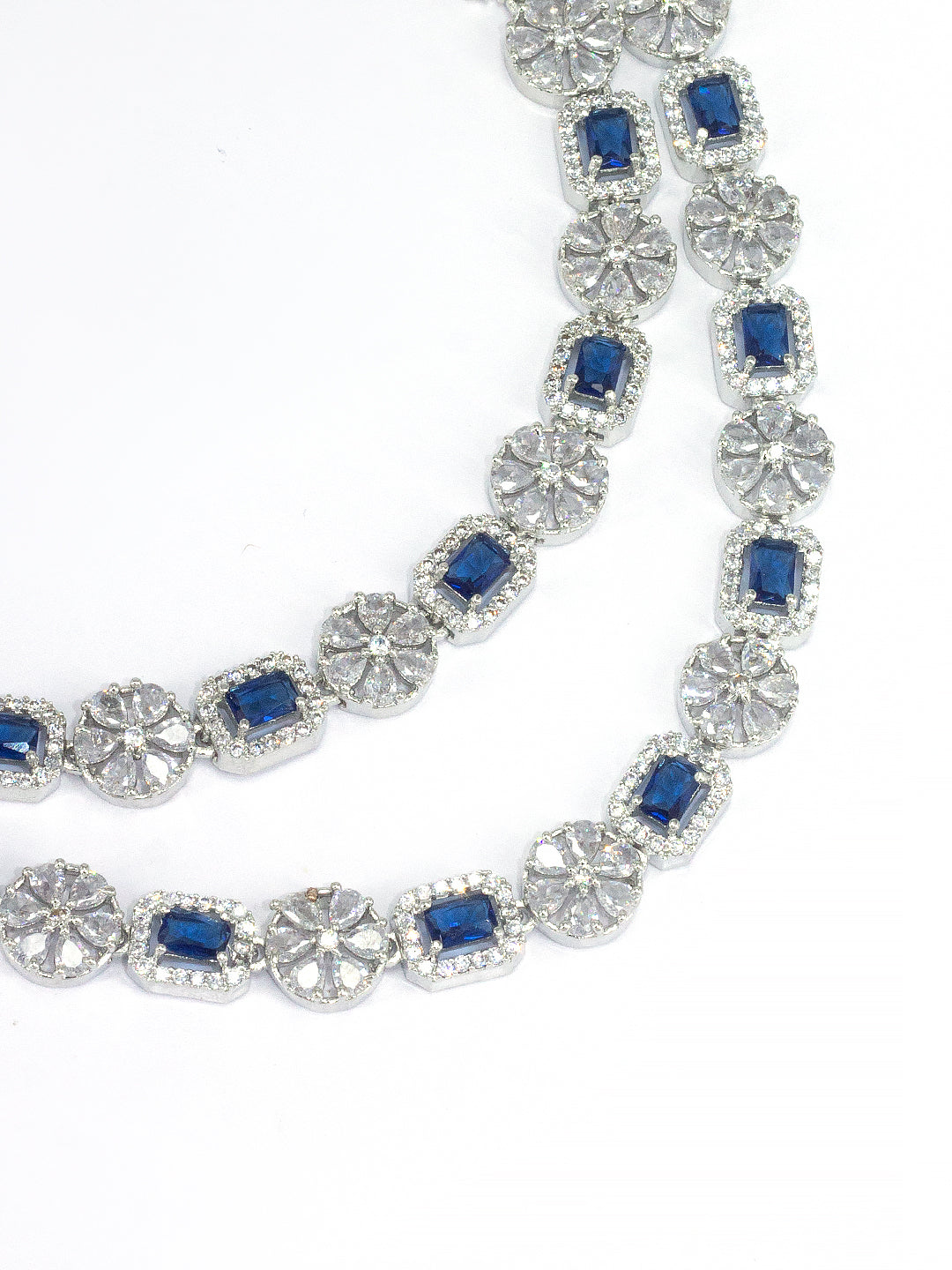 Rhodium Plated Blue Floral Double Layred American Diamond Jewellery Set
