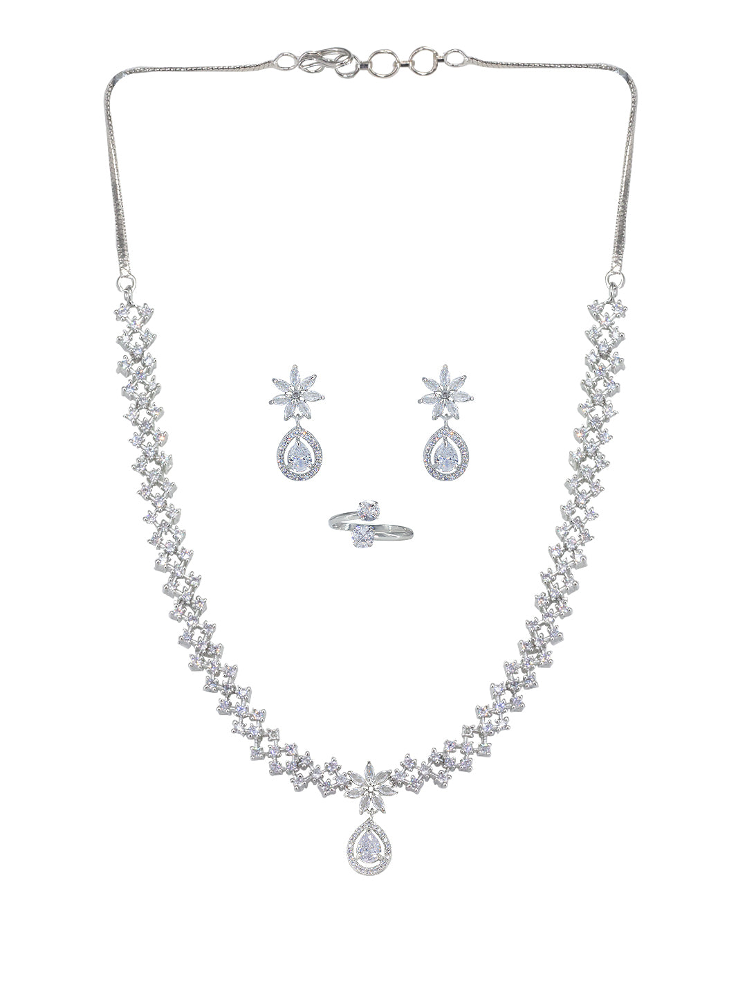 This jewellery set consist of a rhodium plated necklace, a pair of earrings and an adjustable finger ring, has AD studded details and secured with hook closure, earrings are secured with post and back closure and finger ring is secured with slip on and adjustable closure.