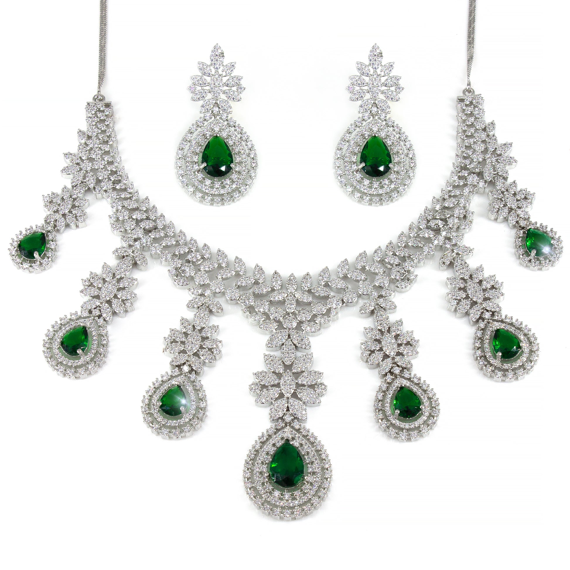 Rhodium-Plated Green Statement AD-Studded Bridal Jewellery Set