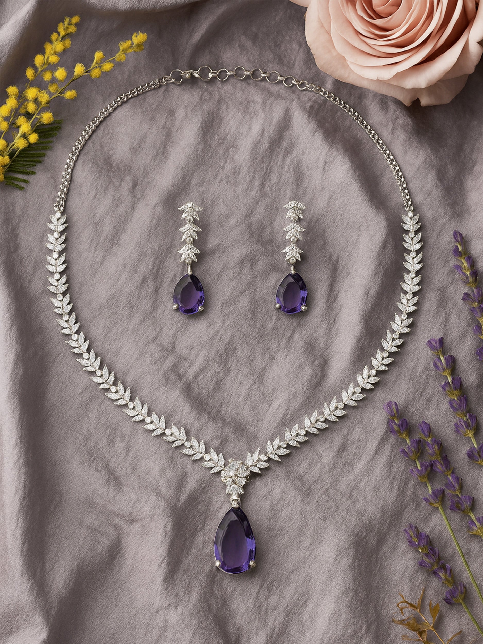 Purple American Diamond Studded Necklace and Matching Earring Set Comes with S-Hook Closure.