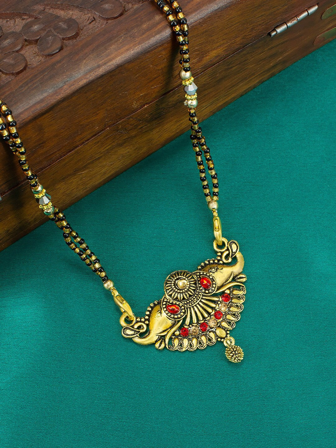 Elegant Golden Designer Black Beaded Mangalsutra, golden chain, and striking black beads, perfect for traditional and modern occasions.