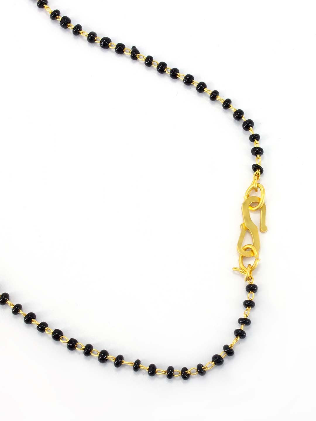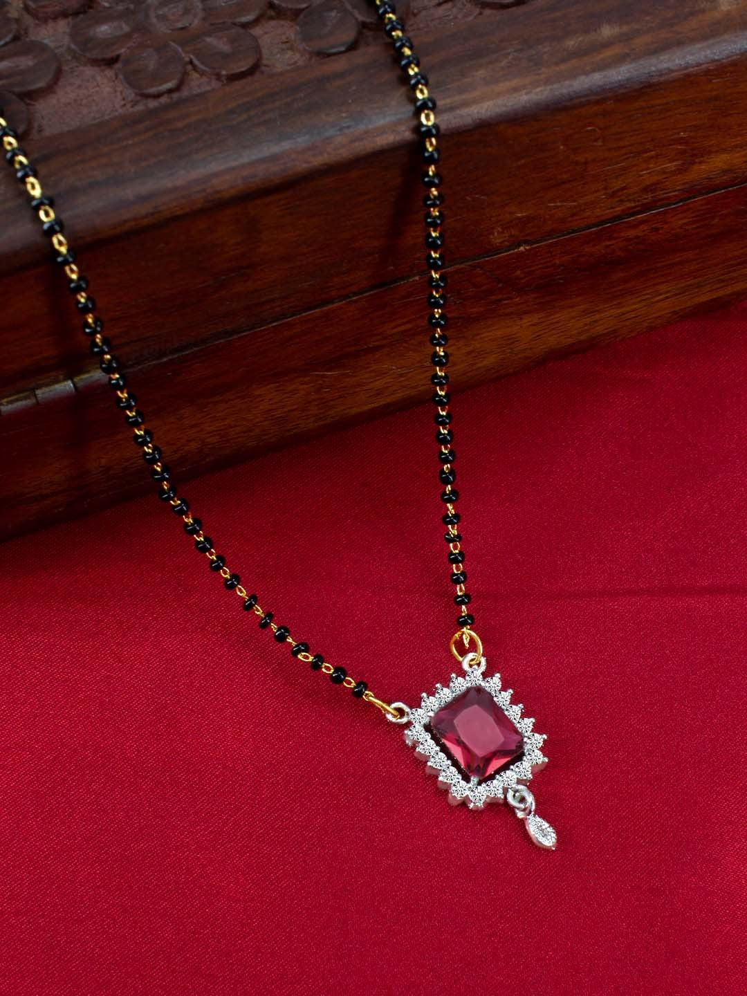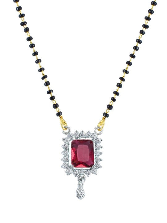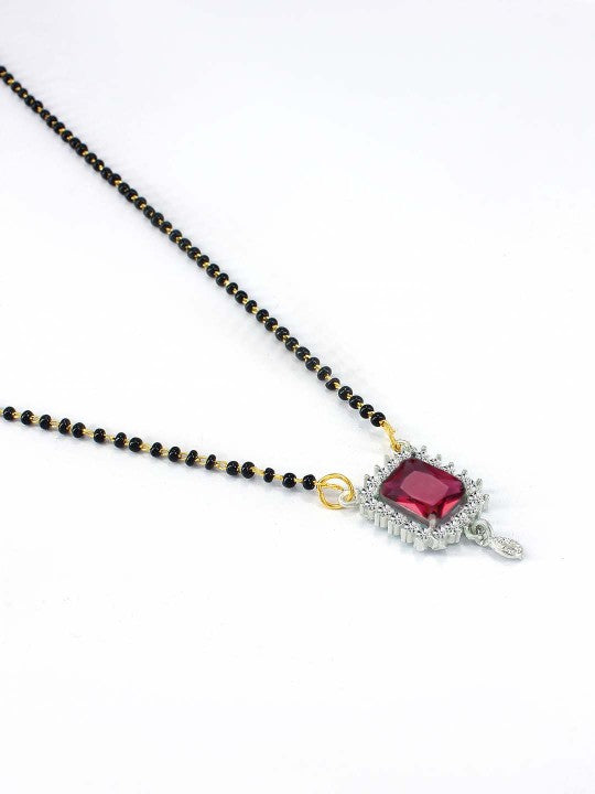Drape yourself in elegance with this gold-plated mangalsutra featuring a black beads chain and a pink AD (American Diamond) pendant, a chic and sophisticated accessory for traditional ensembles.