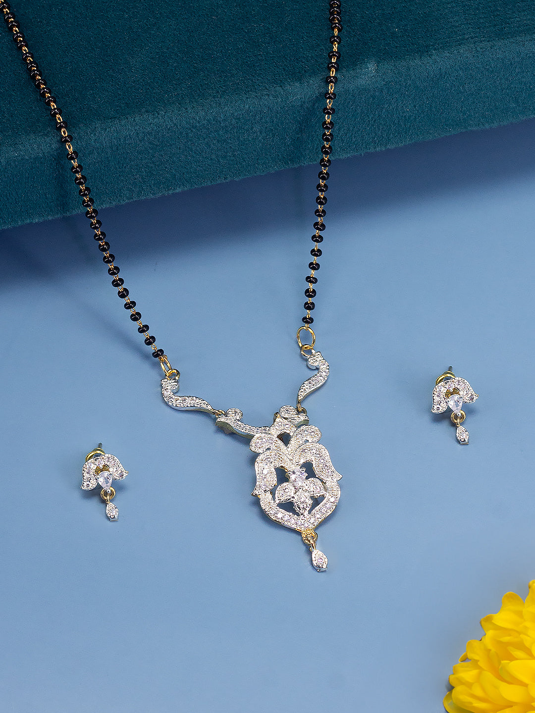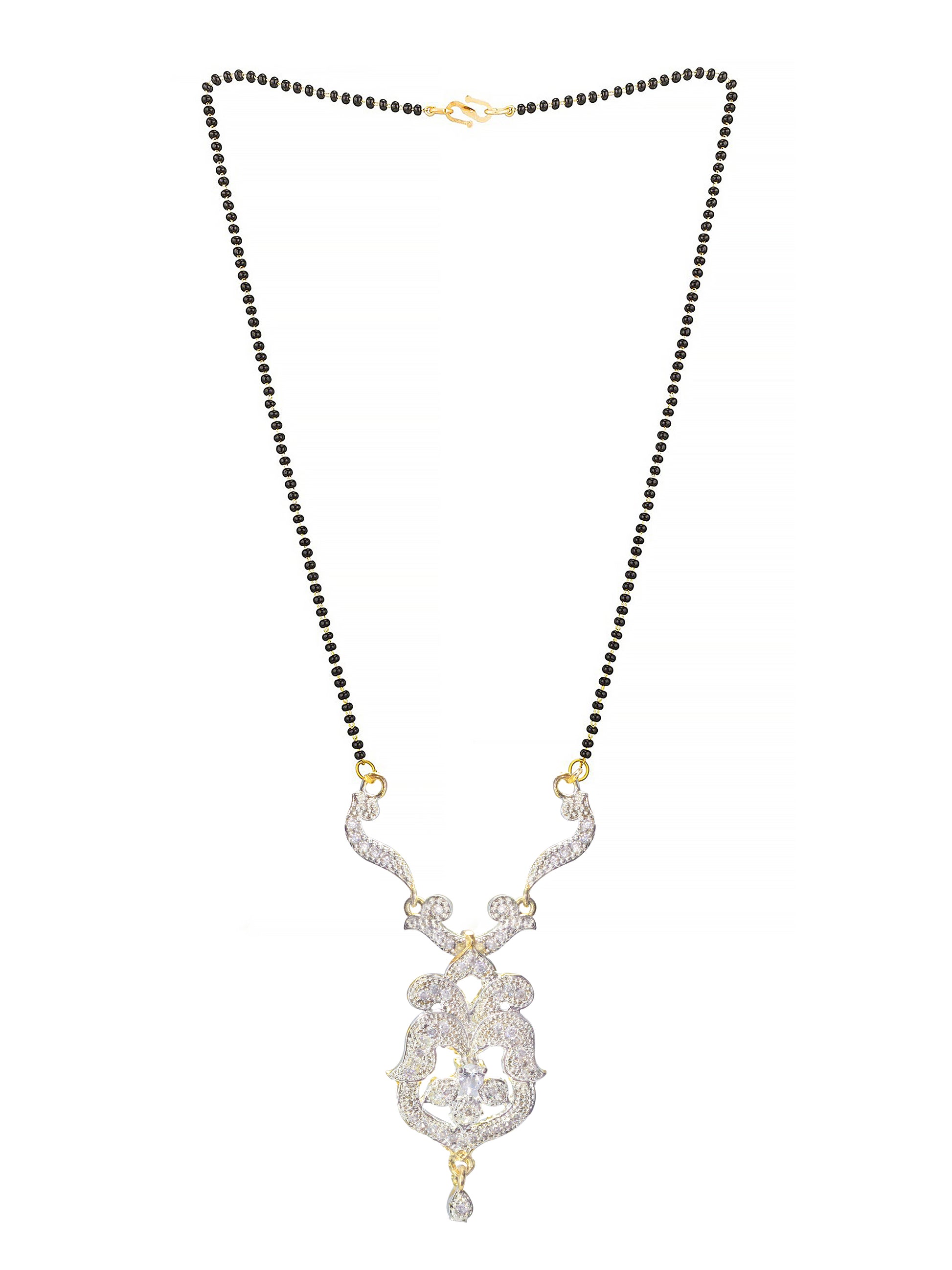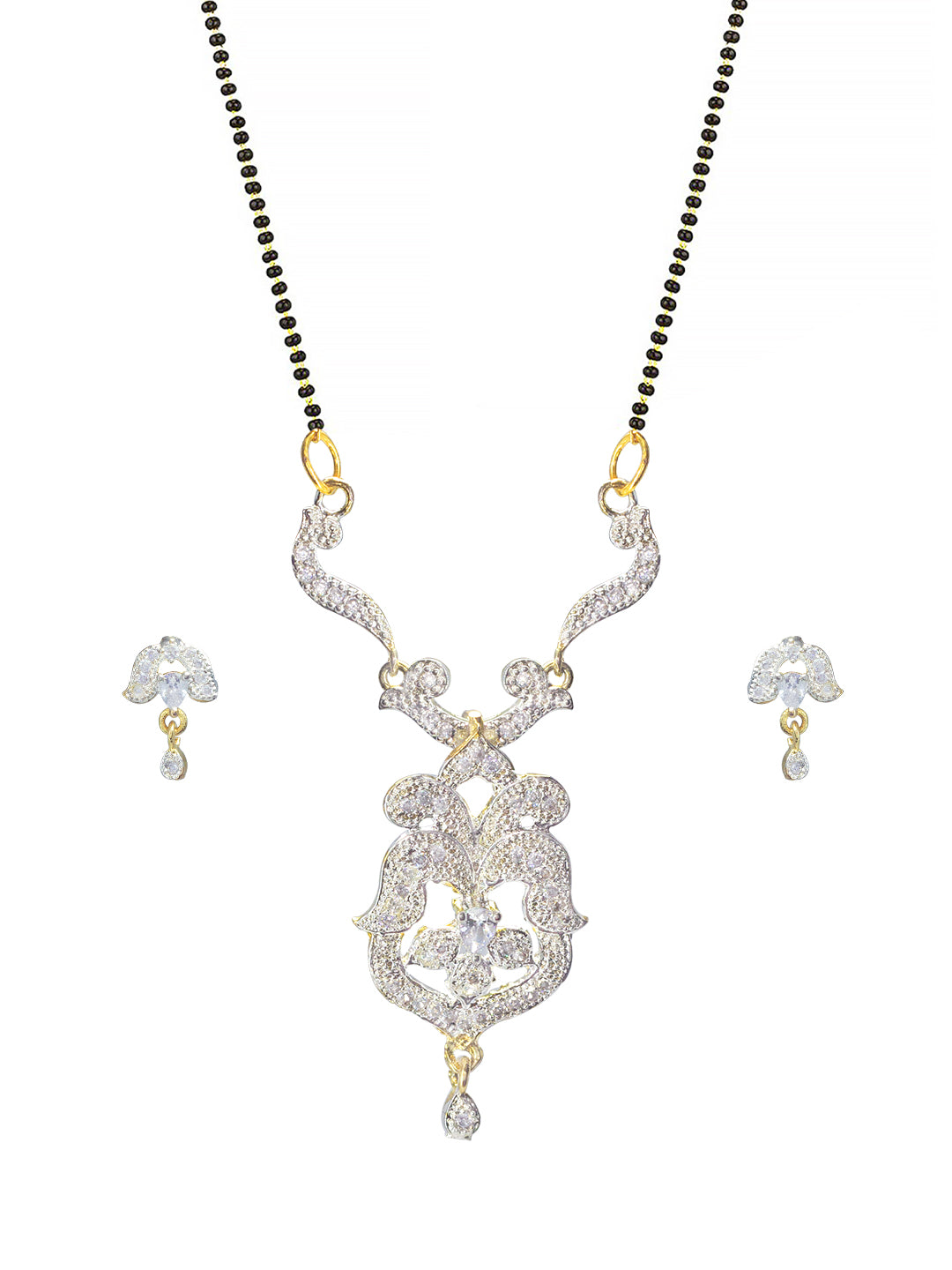 This gold plated set consist of a mangalsutra and a pair of earrings, has AD studded & black beaded chain details. Matching earrings are secured with post and back closure.