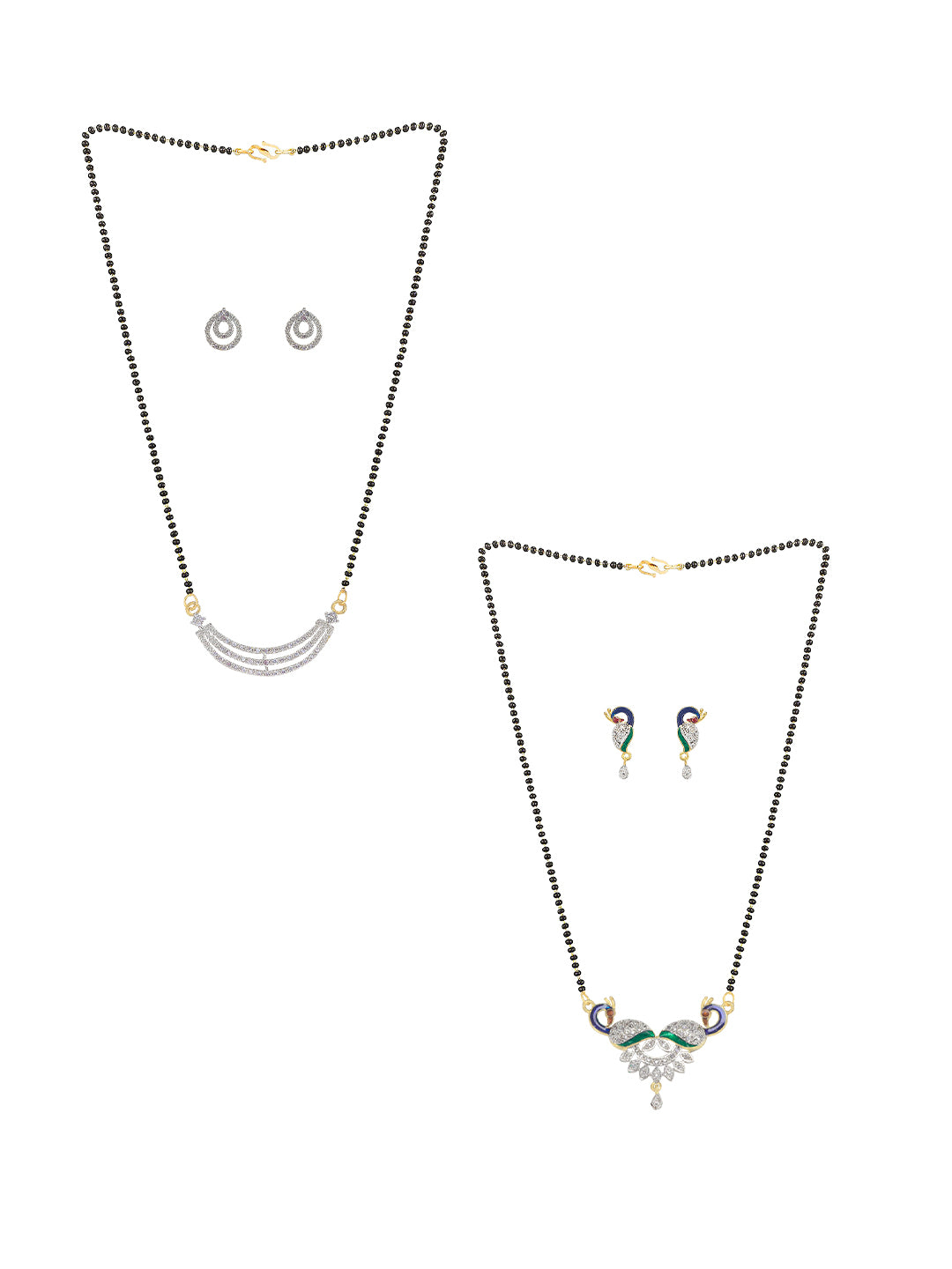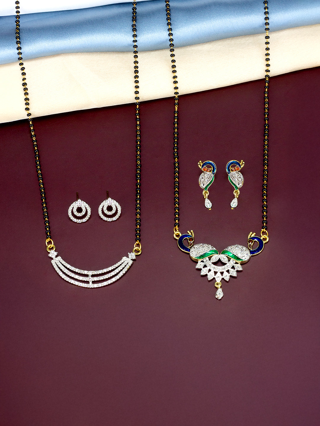 Set Of Two Gold Plated Peacock American Diamond Mangalsutra & Earrings