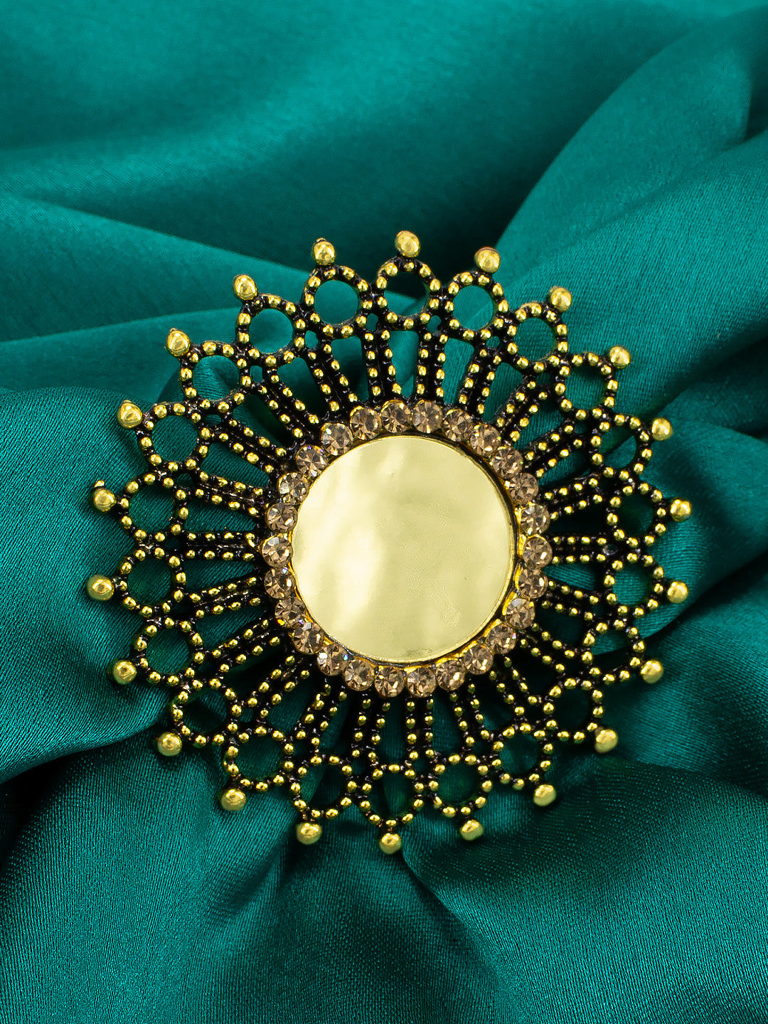 This ring is gold plated, has mirror studded details and secured with slip on closure and adjustable closure.