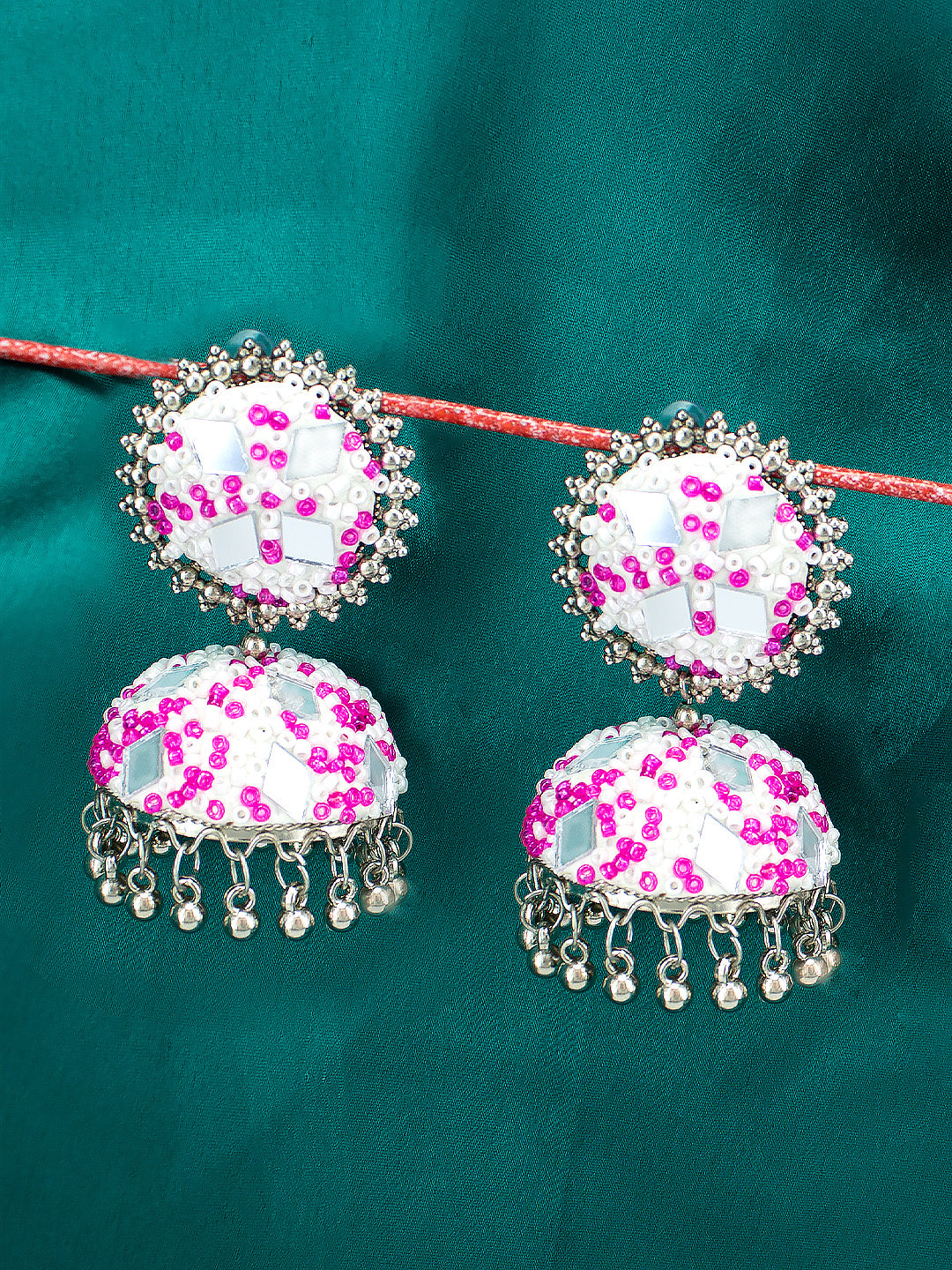 These earrings are silver plated, has mirror studded & beads drop details and secured with post and back closure.