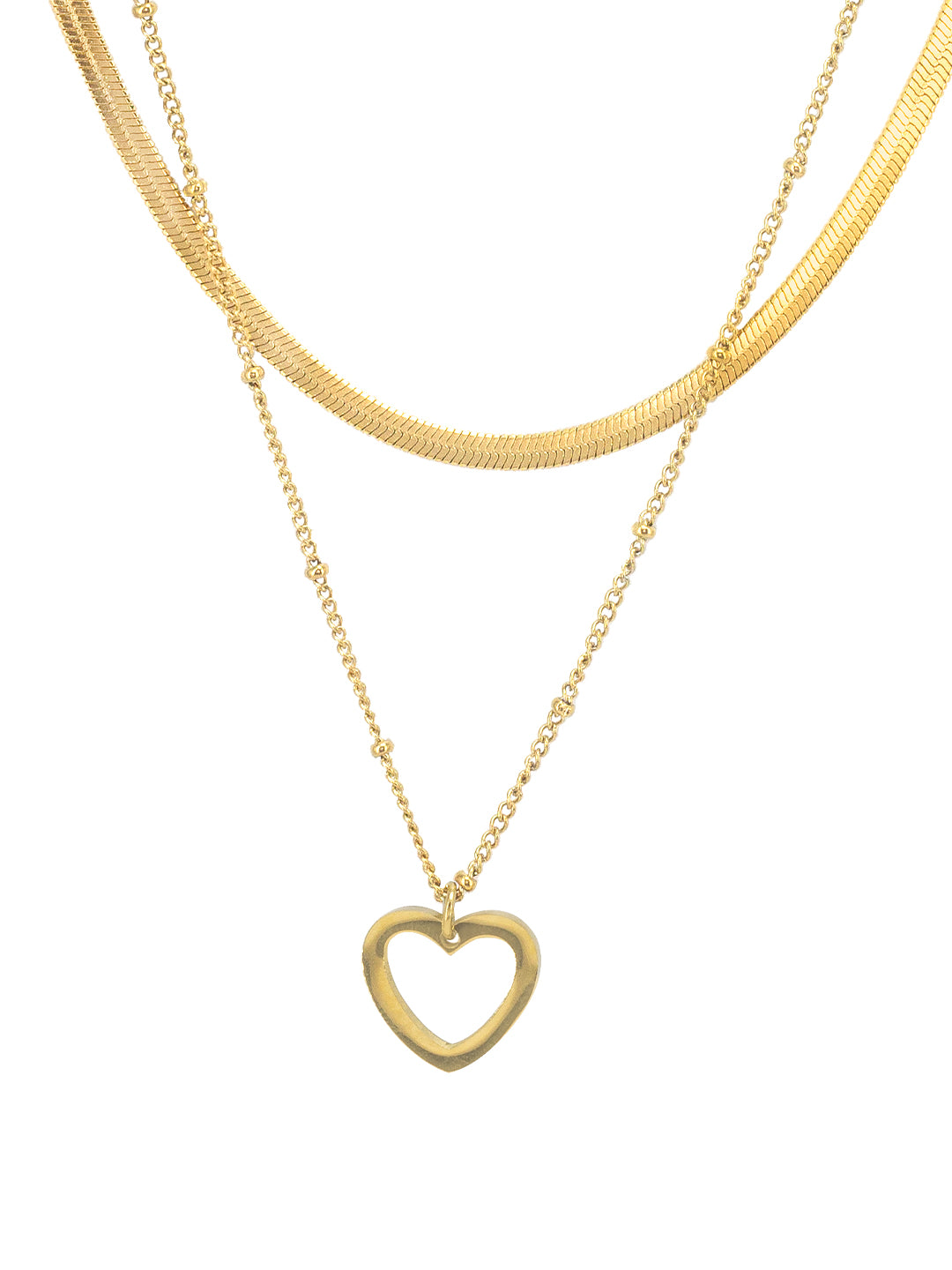 This dainty style necklace is stainless steel, anti tarnish and gold plated, has double chain and heart shaped pendant details and secured with lobster closure.