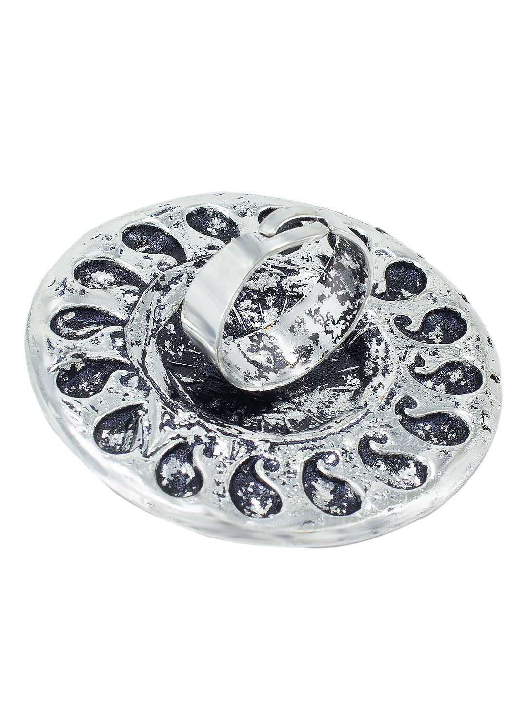 This ring is silver oxidized and secured with slip on closure and adjustable closure.