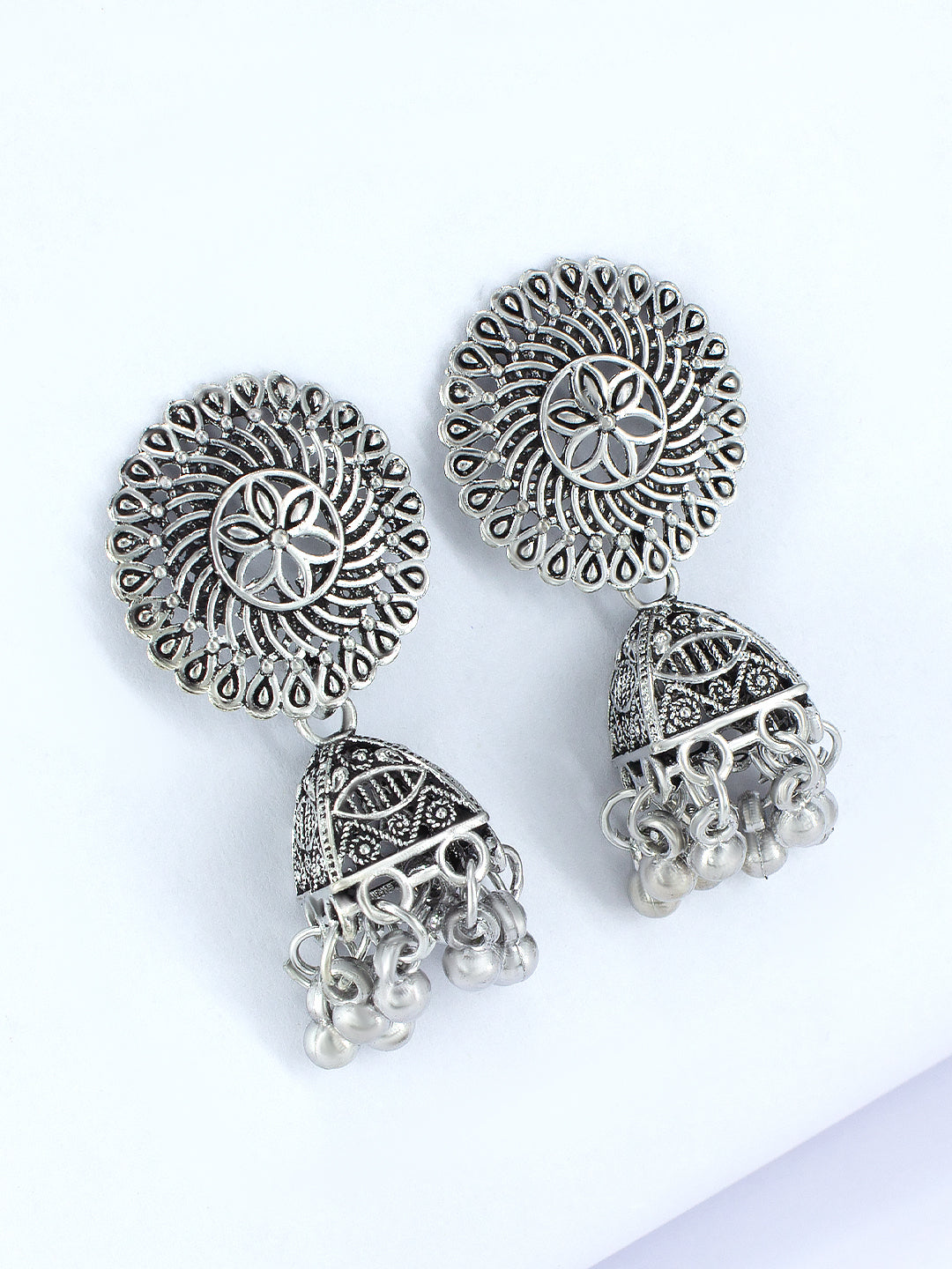 These earrings are silver oxidized, has pearl drop jhumka design details and secured with post and back closure.