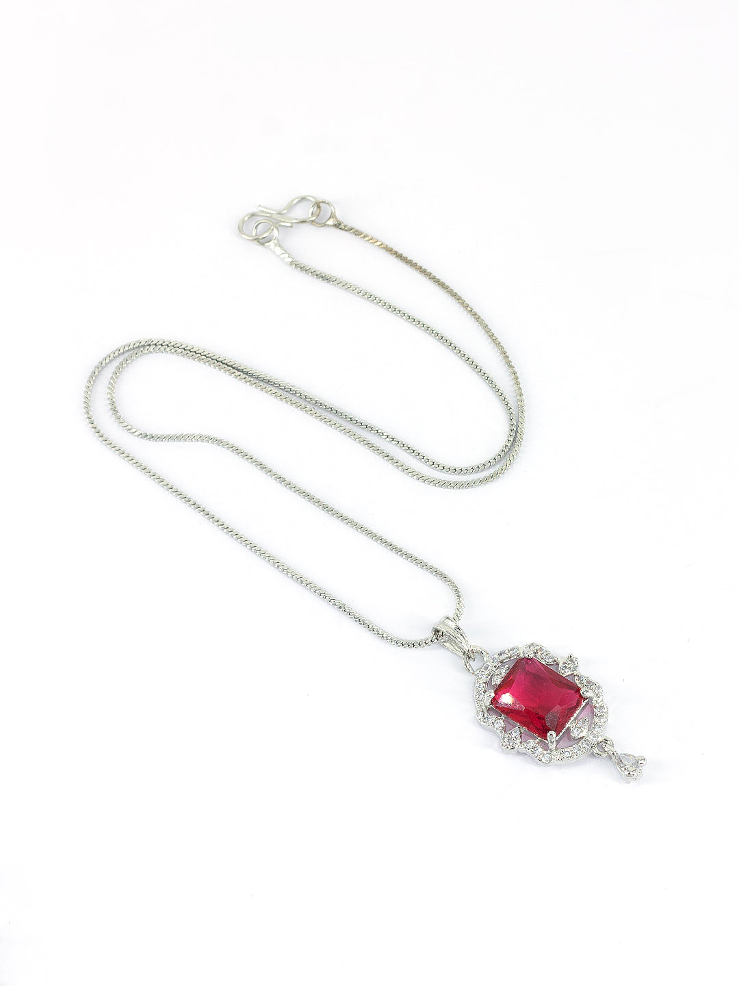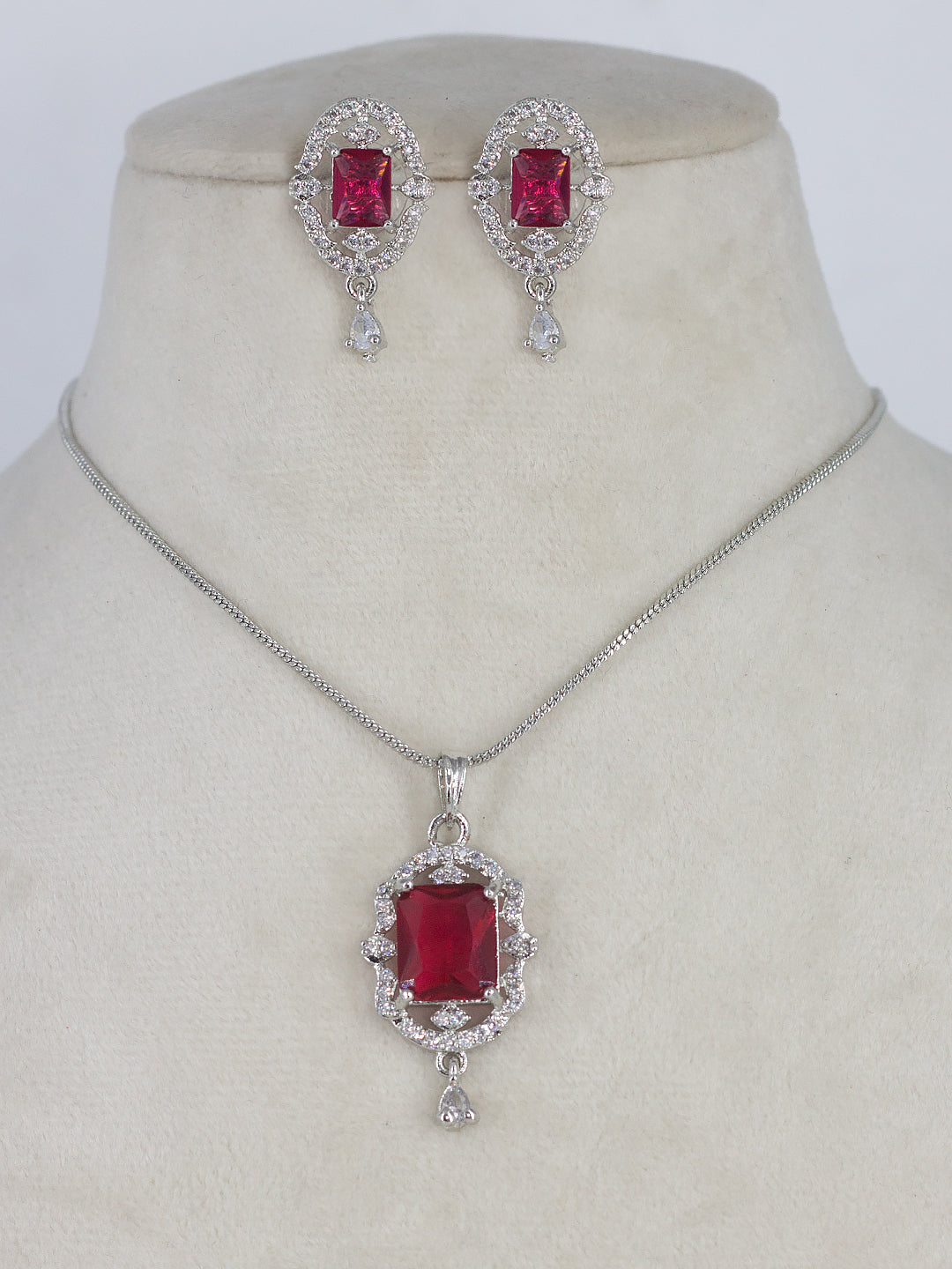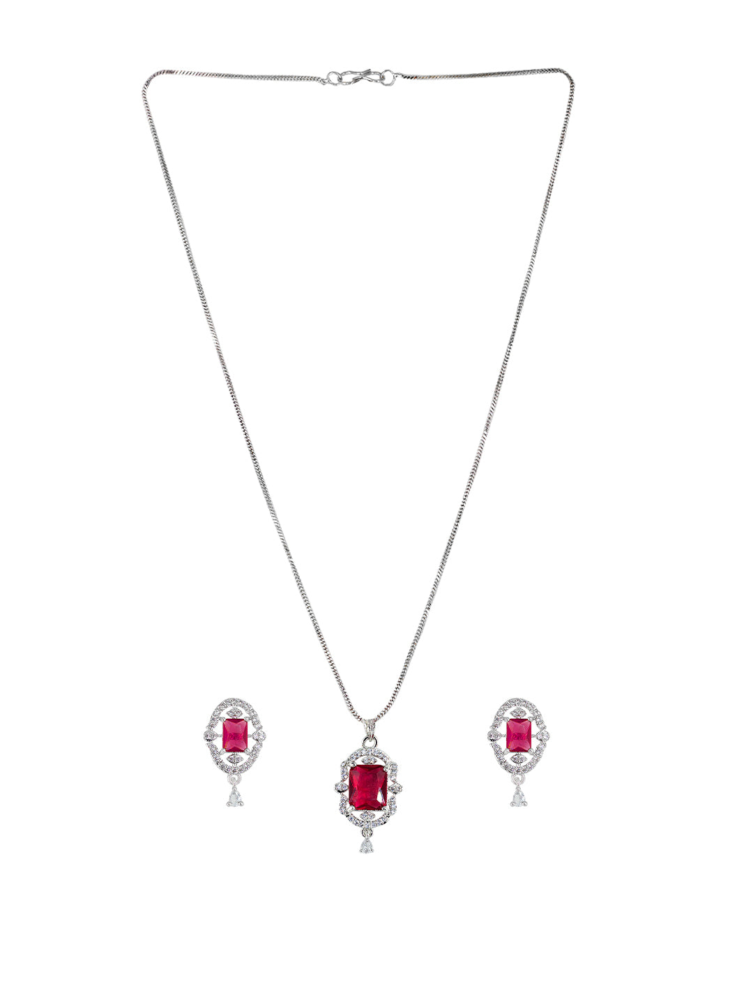 Rhodium Plated Red American Diamond Studded Pendant Set
