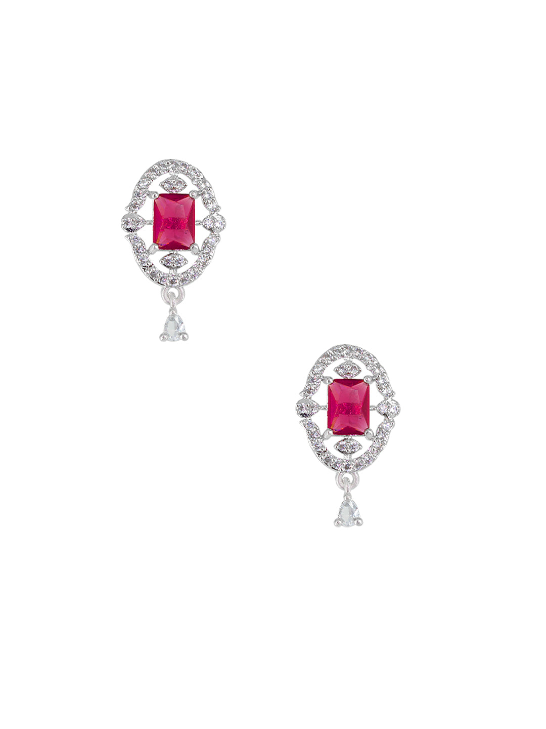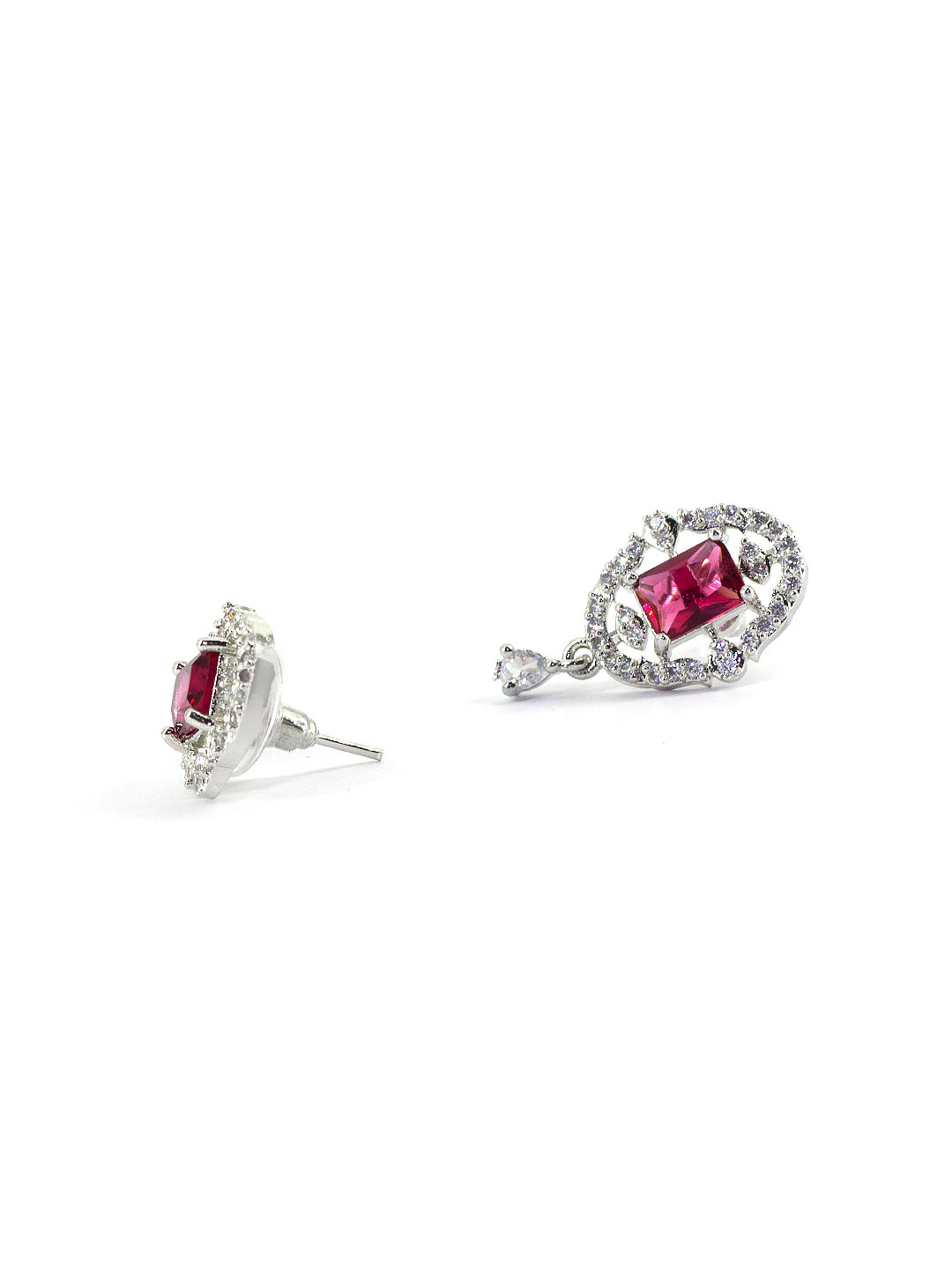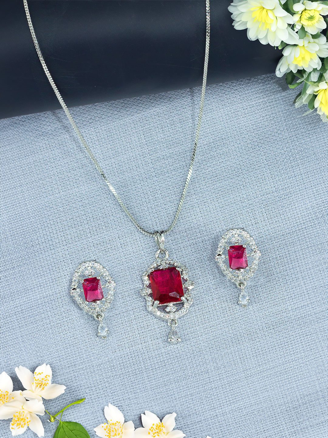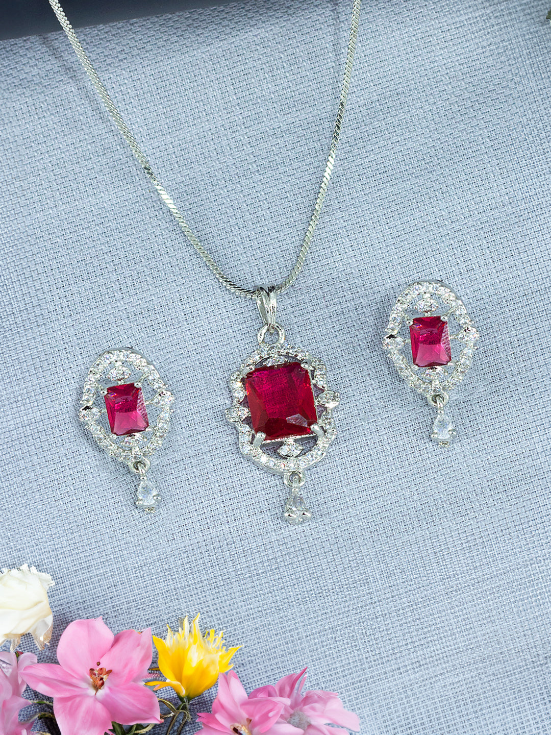 Rhodium Plated Red American Diamond Studded Pendant Set