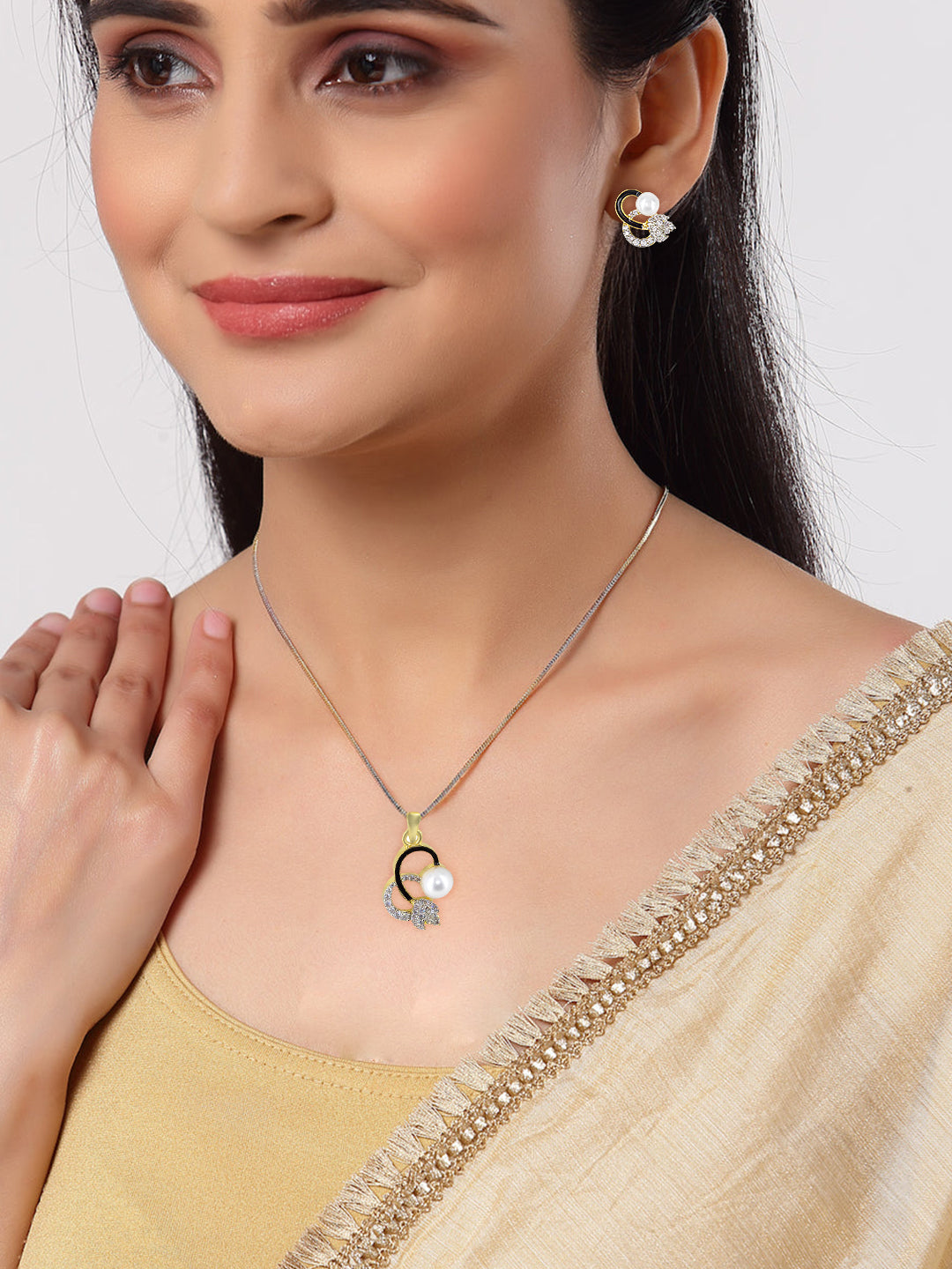 Gold Plated Peacock American Diamond & Black Beaded Trendy Mangalsutra With Earrings