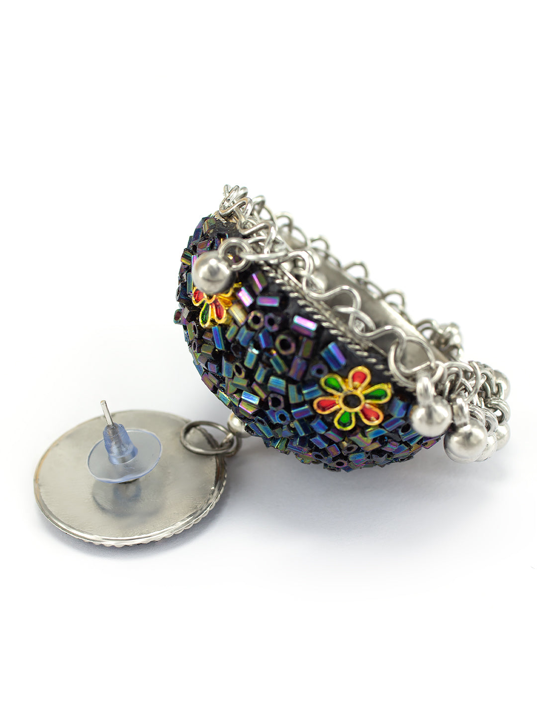 These earrings are silver plated, has mirror studded & beads drop details and secured with post and back closure.