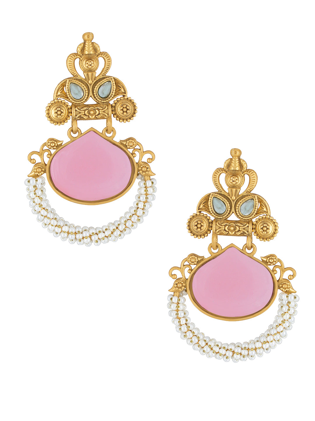 These earrings are gold plated, has monalisa stone studded and secured with post and back closure.
